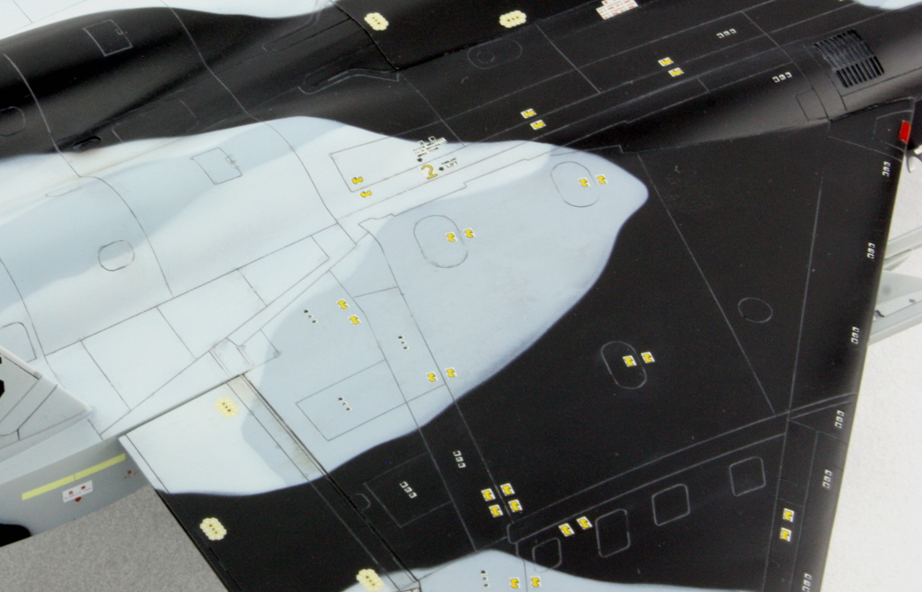 The black pattern was masked using rolls of blu-tack and masking tape and the darker grey standard camouflage pattern was sprayed with Mr Color 307 to represent FS36320. With this masked off in the same manner, the rest of the airframe sprayed with FS36375. I started with Mr Color 308, but ran out after the upper surfaces were done and had to finish using Humbrol 127 (Mr Color is hard to obtain in the UK, and I was in a rush). Fortunately these two are very close in colour and the difference is invisible. At this point I had basically completed the colour scheme.