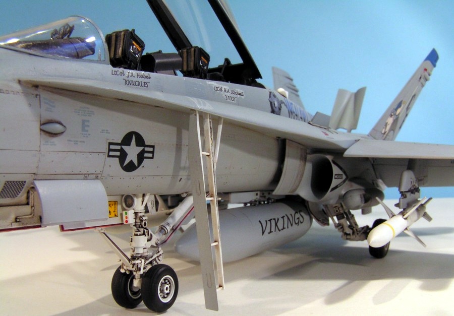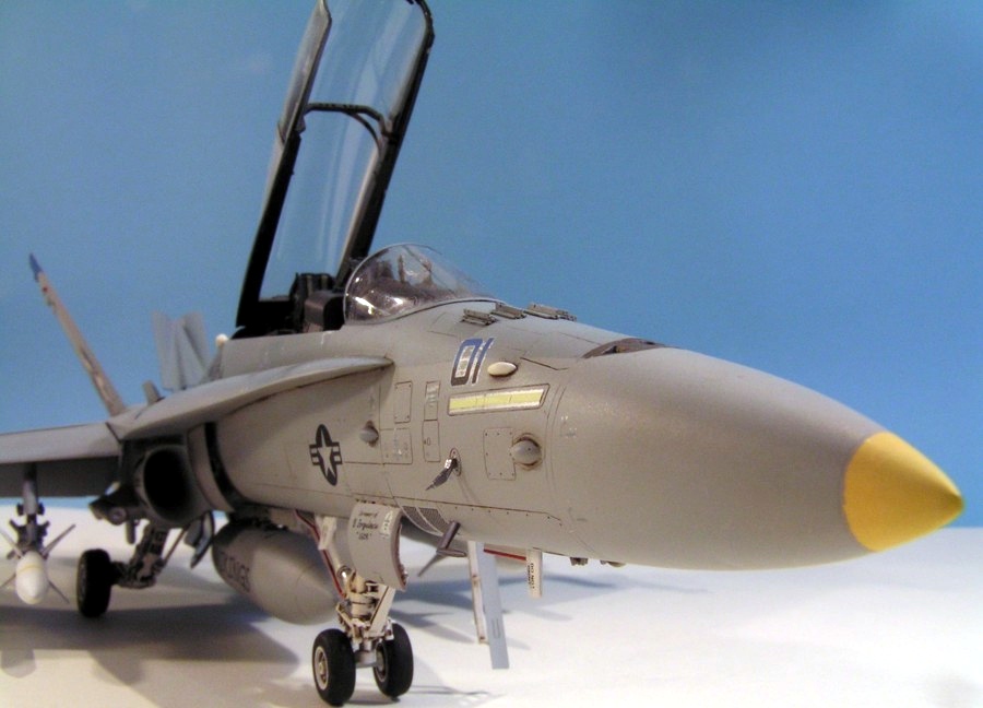 Not satisfied with building two Hasegawa F-14s side-by-side, I then built two of their Hornets simultaneously as well. This is the F/A-18D kit from Hasegawa, and while not as complex as the F-14, it runs it a close second. A lot of plastic comes in the box as well as white metal gear legs and photo-etch for various cockpit, undercarriage and ladder fittings. The detail straight from the box is very good, but I replaced the seats with resin examples from True Details. The main short-coming of the model is that no intake trunking or engine faces are provided — a surprising omission given the cost of the kit and the detail provided elsewhere. The fit is good to poor, my particular problem areas being the nose to fuselage join, the join of the fuselage halves at the rear of the aircraft and the fit of the sensor pods on the fuselage undersides. I made a couple of modifications to improve the accuracy of the model: replaced the blade antennae with swept examples, added two extra chaff dispensers (taken from extra pieces of Hasegawa’s A-4 kits), added a GPS dome, added the IFF in front of the canopy (using spare Sidewinder etch parts from a Flightpath detail set), and removed the antennae from underneath the intakes. The reinforcing brackets for the fins were also intentionally left off. The markings are from Orion Decals and they were very comprehensive. I got some silvering, but that’s probably because I didn’t persevere with the decal solvents. Paints are Humbrol enamel and the upper surface colour hides the decals — I’m not sure if the error is with the paint or the transfers. This kit is complex, but nicely detailed. Like the Tomcat it requires patience and perseverance.