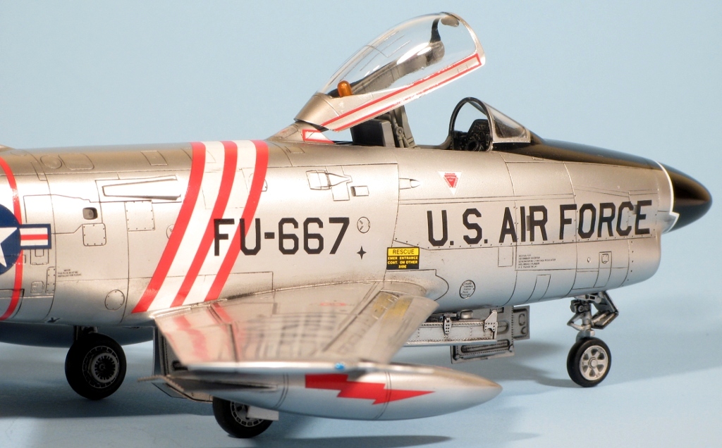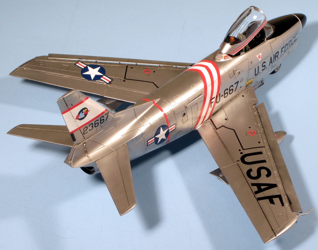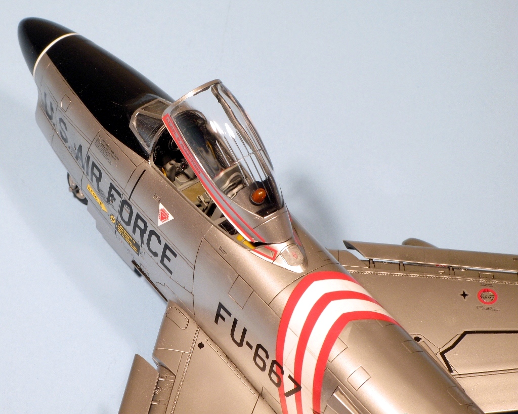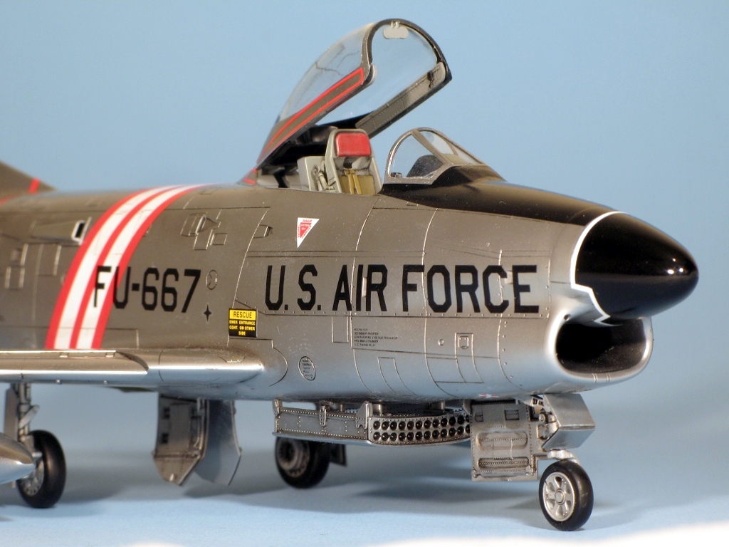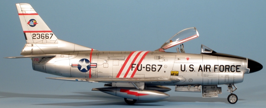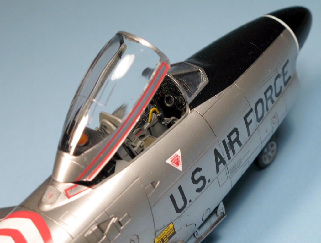 Like their F-15E, the Revell F-86D Sabre Dog is a state of the art kit at a very reasonable price. It fits together extremely well and is highly detailed. I can only fault Revell for one thing, and that is their instructions. Following their guidance I proceeded to install the air intakes on the fuselage rather than the alternative blanking plates. I then realised that this was inappropriate for the USAF markings in the kit, and that the instructions were wrong. (They also neglect to have you install the tail blanking plate.) Having stuck in the wrong component and wanting to model a USAF machine, I was forced to look for alternative decals. On Modeling Madness I found a review of a Superscale sheet that had been released for a late-model F-86D, so I obtained that. They provide some of the best decals I have used, and I highly recommend them. Unfortunately, some ghost seams appeared on the model after I had applied the Alclad II NMF and the decals. I had to apply some Mr Surfacer to the seam and carefully sand it out before reapplying the Alclad on the spine.