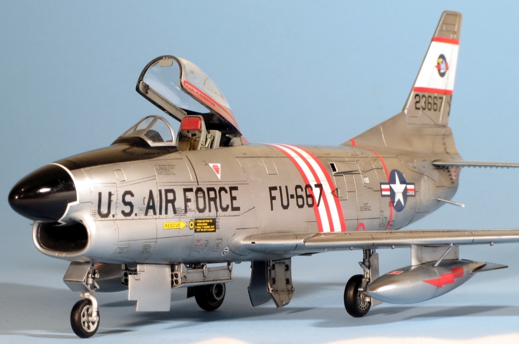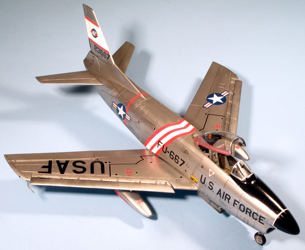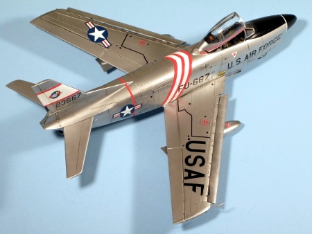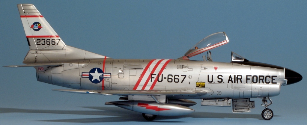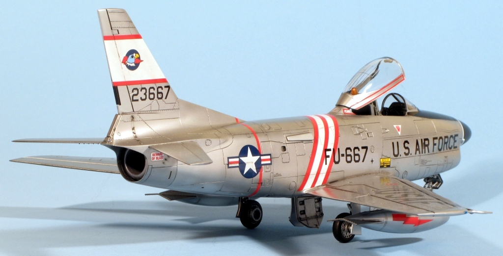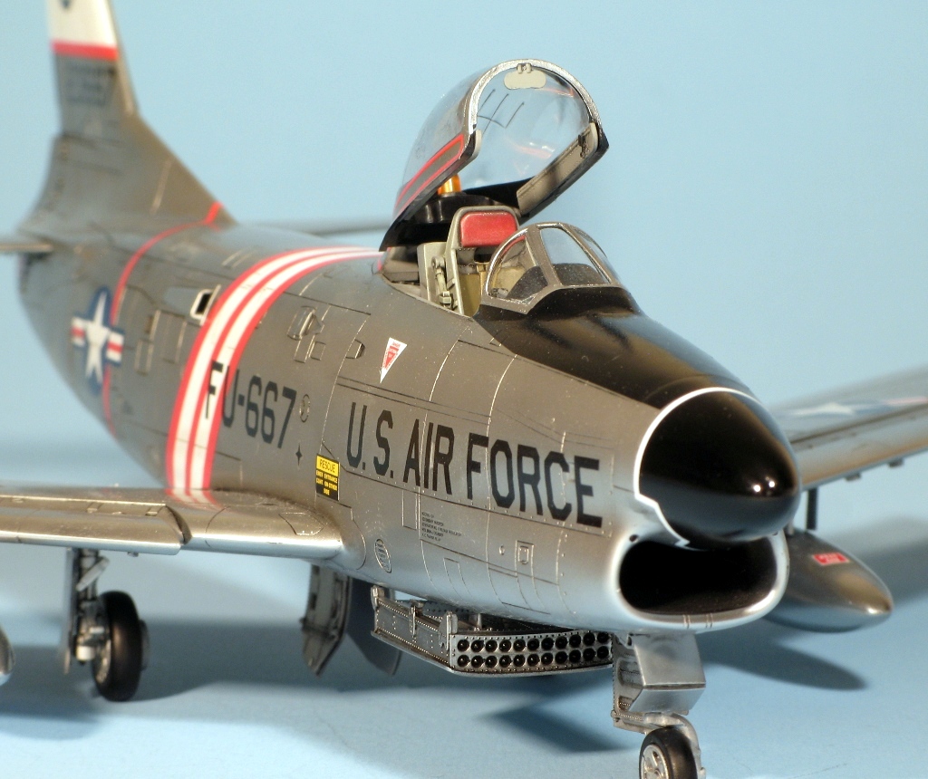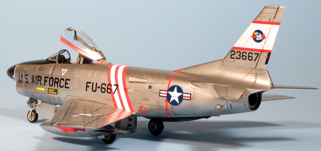Like their F-15E, the Revell F-86D Sabre Dog is a state of the art kit at a very reasonable price. It fits together extremely well and is highly detailed. I can only fault Revell for one thing, and that is their instructions. Following their guidance I proceeded to install the air intakes on the fuselage rather than the alternative blanking plates. I then realised that this was inappropriate for the USAF markings in the kit, and that the instructions were wrong. (They also neglect to have you install the tail blanking plate.) Having stuck in the wrong component and wanting to model a USAF machine, I was forced to look for alternative decals. On Modeling Madness I found a review of a Superscale sheet that had been released for a late-model F-86D, so I obtained that. They provide some of the best decals I have used, and I highly recommend them. Unfortunately, some ghost seams appeared on the model after I had applied the Alclad II NMF and the decals. I had to apply some Mr Surfacer to the seam and carefully sand it out before reapplying the Alclad on the spine.