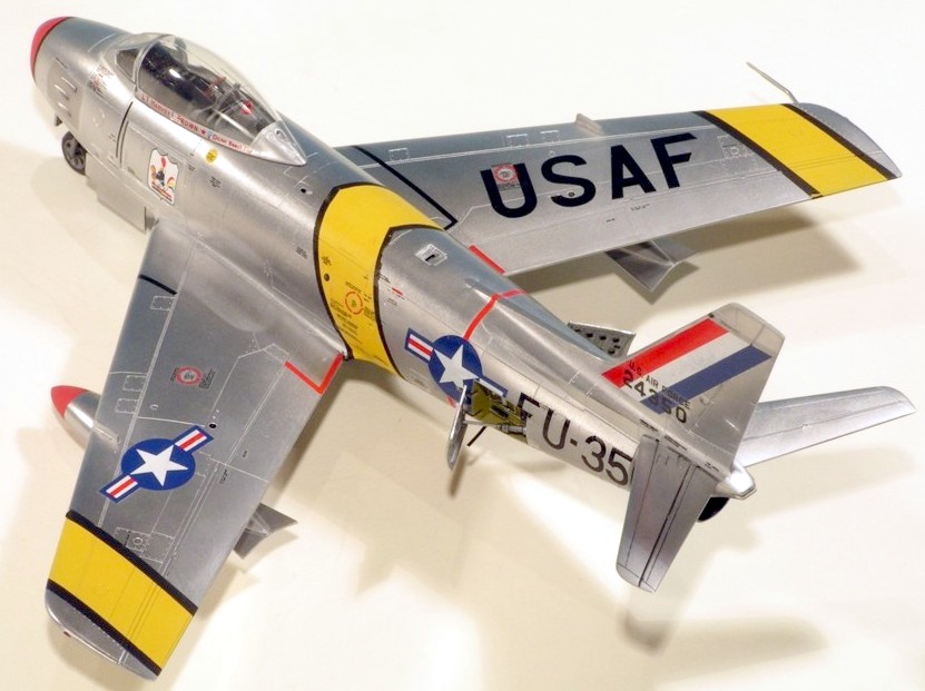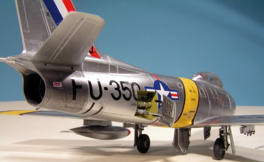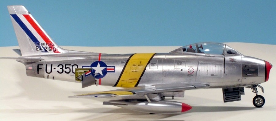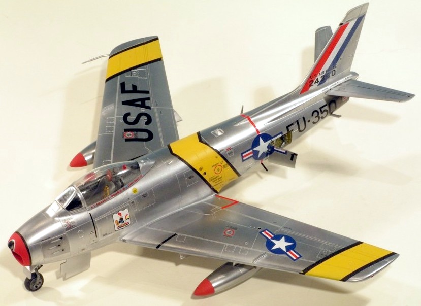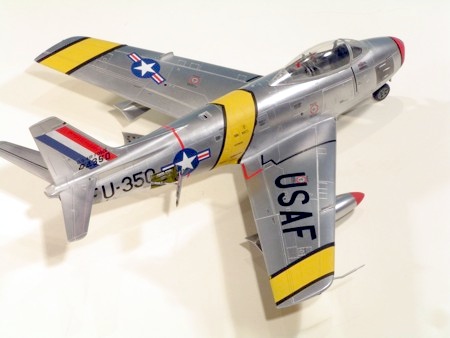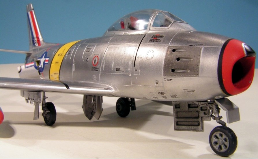 The second Sabre in this collection is Academy’s F-86F-30. The kit is very nice and goes together very straightforwardly. Full intake trunking is included, unlike Monogram’s Sabre, along with positionable flaps and a better detailed interior. I used SNJ for the second time to replicate the natural metal finish. The advantage of this NMF finish is that it needs no primer coat, can be masked, and can be polished using the aluminium powder to the desired shine. The disadvantages are that the paint is quite susceptible to being scratched when polished, and enamel paints do not adhere well to it. The big, big let-down with this kit are the decals. They look very nice, being thin (although significantly out-of-register; the other kit marking option was more affected by this than the one shown here) but have terrible adhesion. As you can see, several walkway markings have already flaked off, and the fin flash and national markings are flaking off on the kit. If I ever get round to it I should use some aftermarket decals to replace the missing ones – every time I look at this kit more markings have come off. I ditched the decals for the fuselage and wing stripes and painted these and the nose using Humbrol enamels.