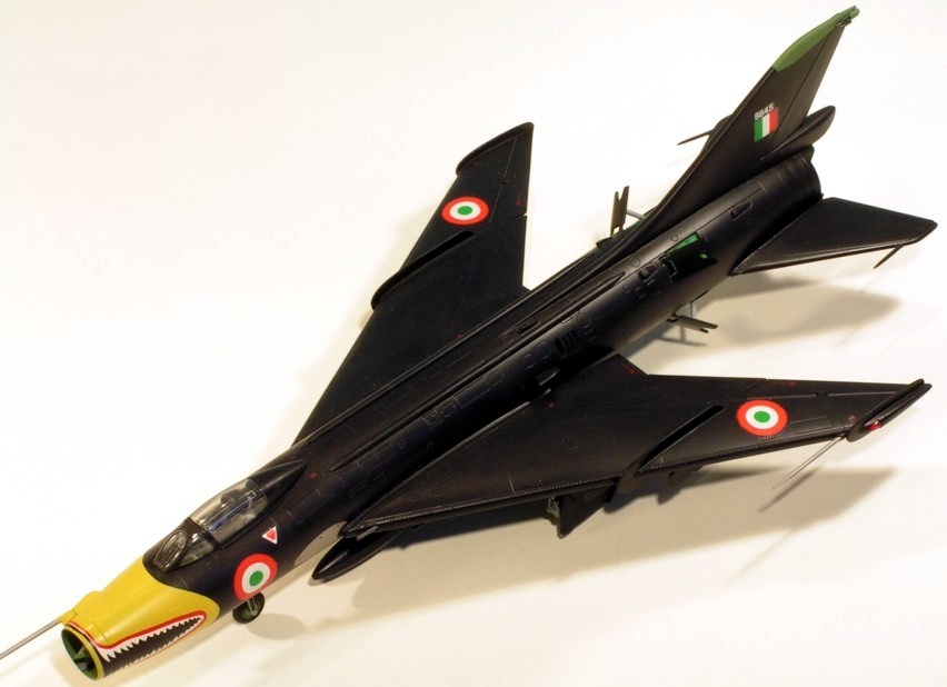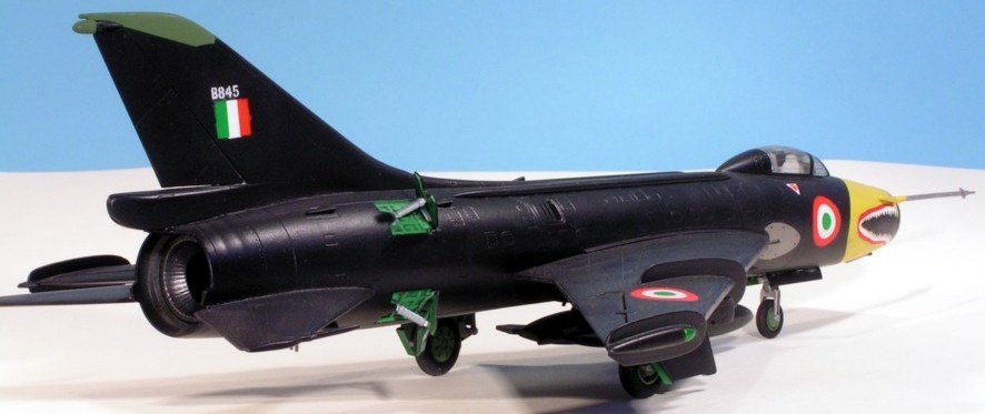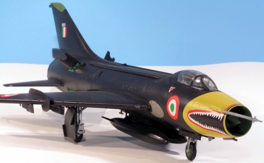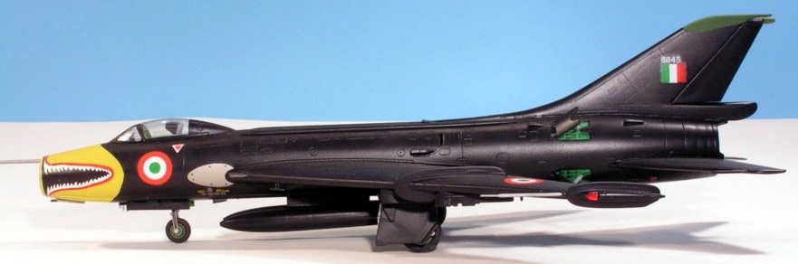 Following my penchant for making ‘planes with shark mouth markings, here is Revell’s (ex-OEZ) Su-7BMK ‘Fitter-A’. What aircraft this kit is is a bit confusing. The kit contains markings and alternative parts for what the instructions claim is an Indian Air Force Su-7BKL and an Egyptian Su-7BMK. Ken Duffey, in Scale Models International, pointed out that the Indian markings were actually applied to a lightened Su-7BMK. So, using his comments, this kit was built following most of the options for the BMK. The kit goes together ok. The fit of the tailplanes to the fuselage was awful, and that of the main wings not much better. The fuselage halves join nicely, but the drop tanks do not really fit in the space provided. Overall, the kit has a ‘clunky’ feel to it. The cockpit interior is very ropey, but not much can be seen through the very thick canopy! I think I used Halfords black spray paint for the finish over Humbrol enamel for the nose. Using these spray paints over enamel does not work and caused the underlying enamel to craze and crack. The bright green is Revell’s recommended paint, but seems a bit garish to me. Nose weight is needed for this model but is not mentioned in the instructions — I found out the hard way. Kit decals were used although the orange is too red and the white is slightly out of register. These were applied over Johnson’s Klear. It is quite a nice kit and I’ve often fancied giving it another go, or attempting KP’s Su-22 late-model Fitter.
