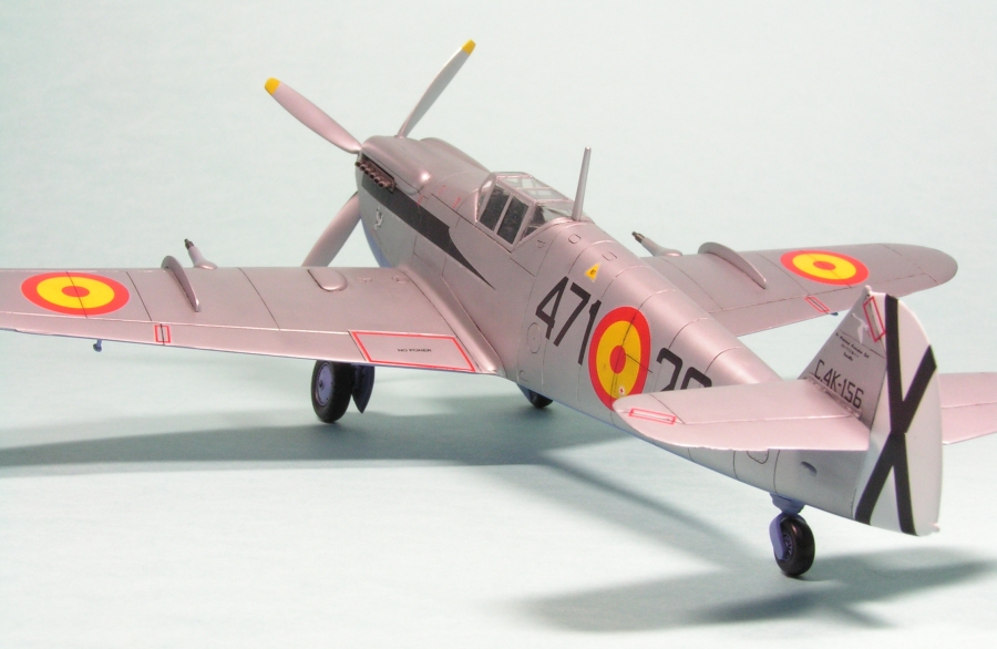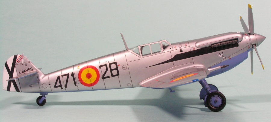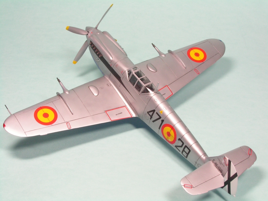 Constructed at the same time as my Hobbycraft Avia S-199 (which shares the same basic moulds), this Academy Hispano HA-1112-M1L is another post-war modification of the famous Messerschmidt Bf109. Comments on construction are the same as for the Avia, including the very badly fitting canopy. The only modifications to this kit were to replace the pitot tube with brass tube and wire and to drill out the gun barrels and engine exhausts. I did not attach the underfuselage housing provided in the kit since I couldn’t see this on the only pictures I could find of this aircraft (see the walkaround in the 109 Lair). These pictures also caused me to paint the prop and spinner silver, rather than brown for the former (as suggested by the instructions) or black for the latter (as on another museum aircraft photographed on Wikipedia). As with the Avia, I would have replaced the wingtip lights with clear plastic had it occurred to me before I painted the aircraft; as it is, I painted them to represent coloured lenses, which I believe is incorrect. Of note is that the instructions would have the builder place the wing guns in the wrong place; they should be further outboard so they don’t interfere with the wheel wells.