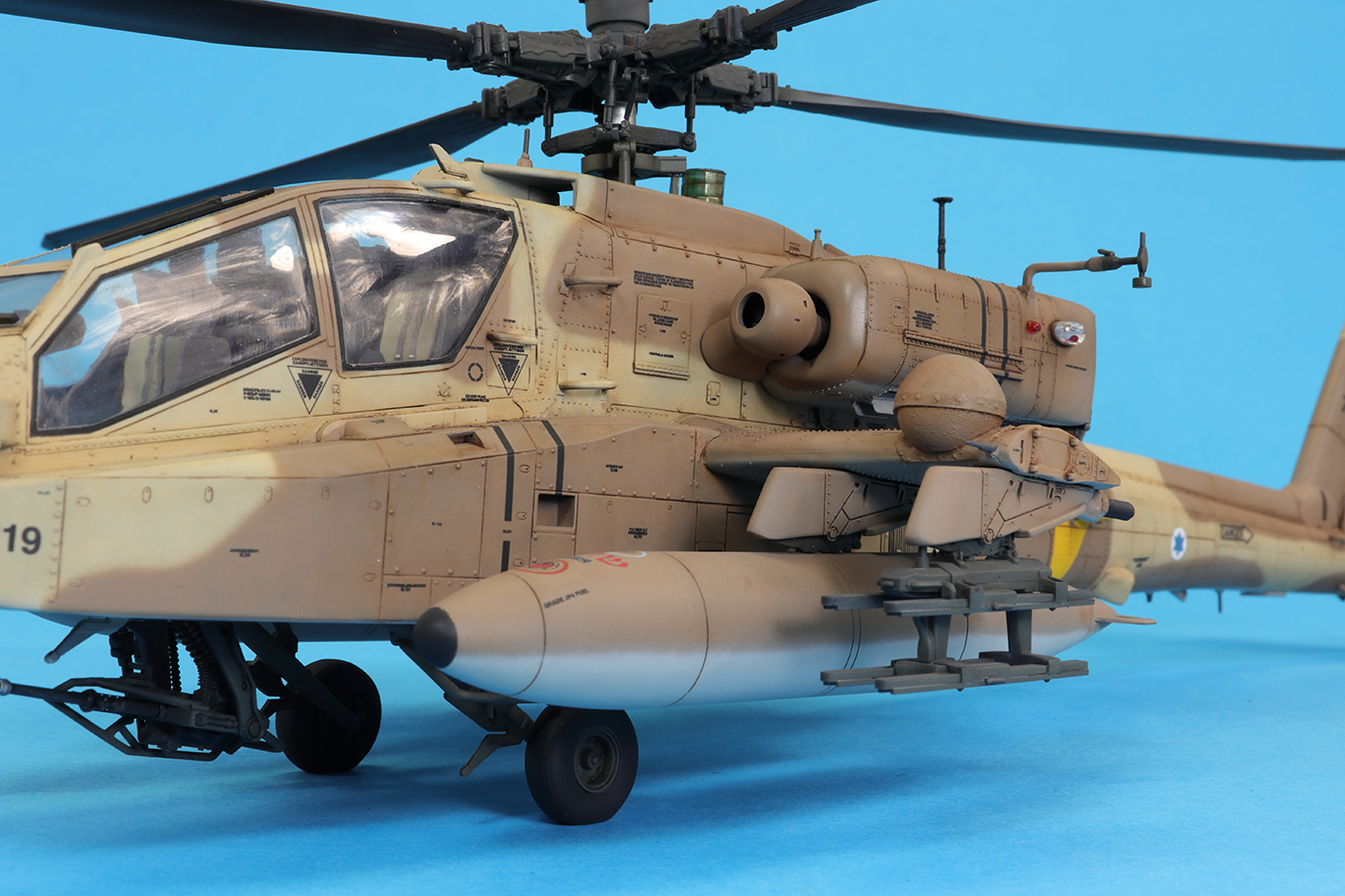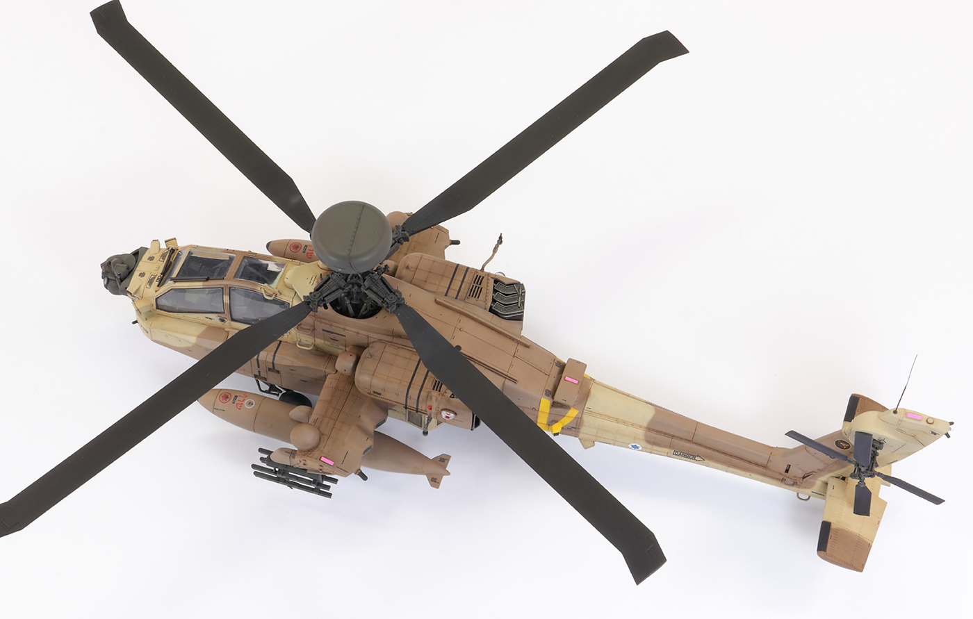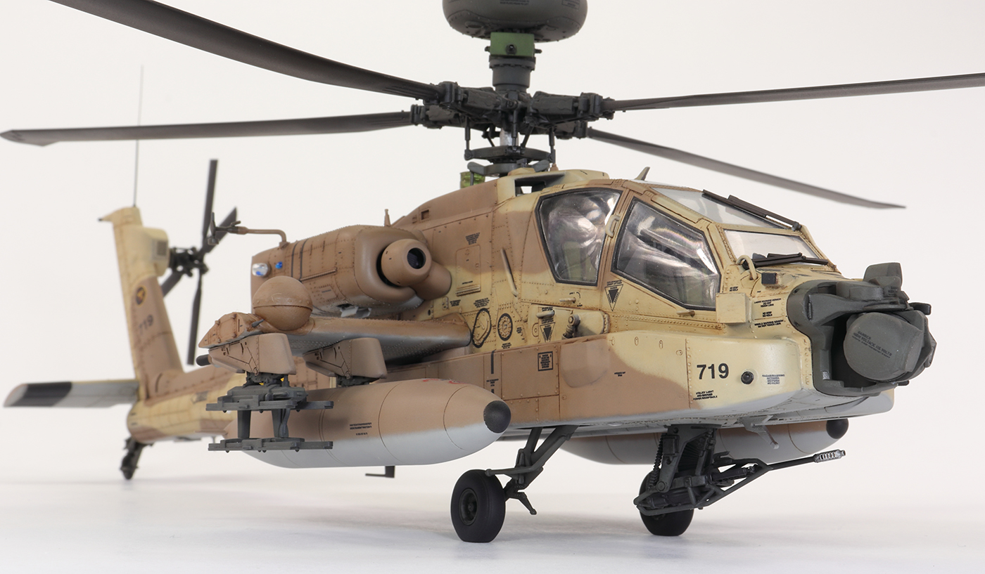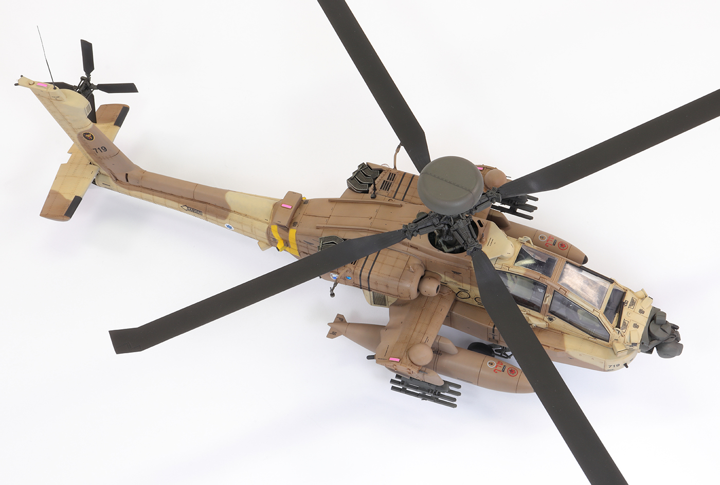 I have mixed feelings about the finished article. I really like the subject matter and it makes a great contrast to the dark green US Army Apache next to it in my display case. The base Hasegawa kit is great and I’ve had fun putting two of them together. However, the Wingman set is a bit of a disappointment, mainly because of the relatively poor casting quality but also because it was not quite complete and the fit rather poor. Were I after the perfect Saraf, I would try to get Hasegawa’s own AH-64D-I (sadly out of production) which I would expect to have better moulded resin for the main components. It would still need updating with the Wingman set to make up for some of what’s missing and would certainly be a very expensive project, but probably produce a better result.