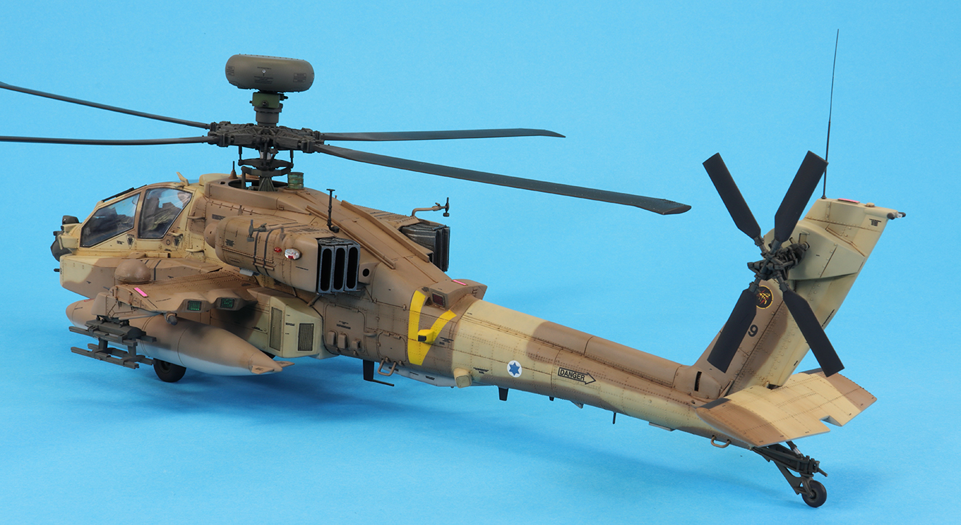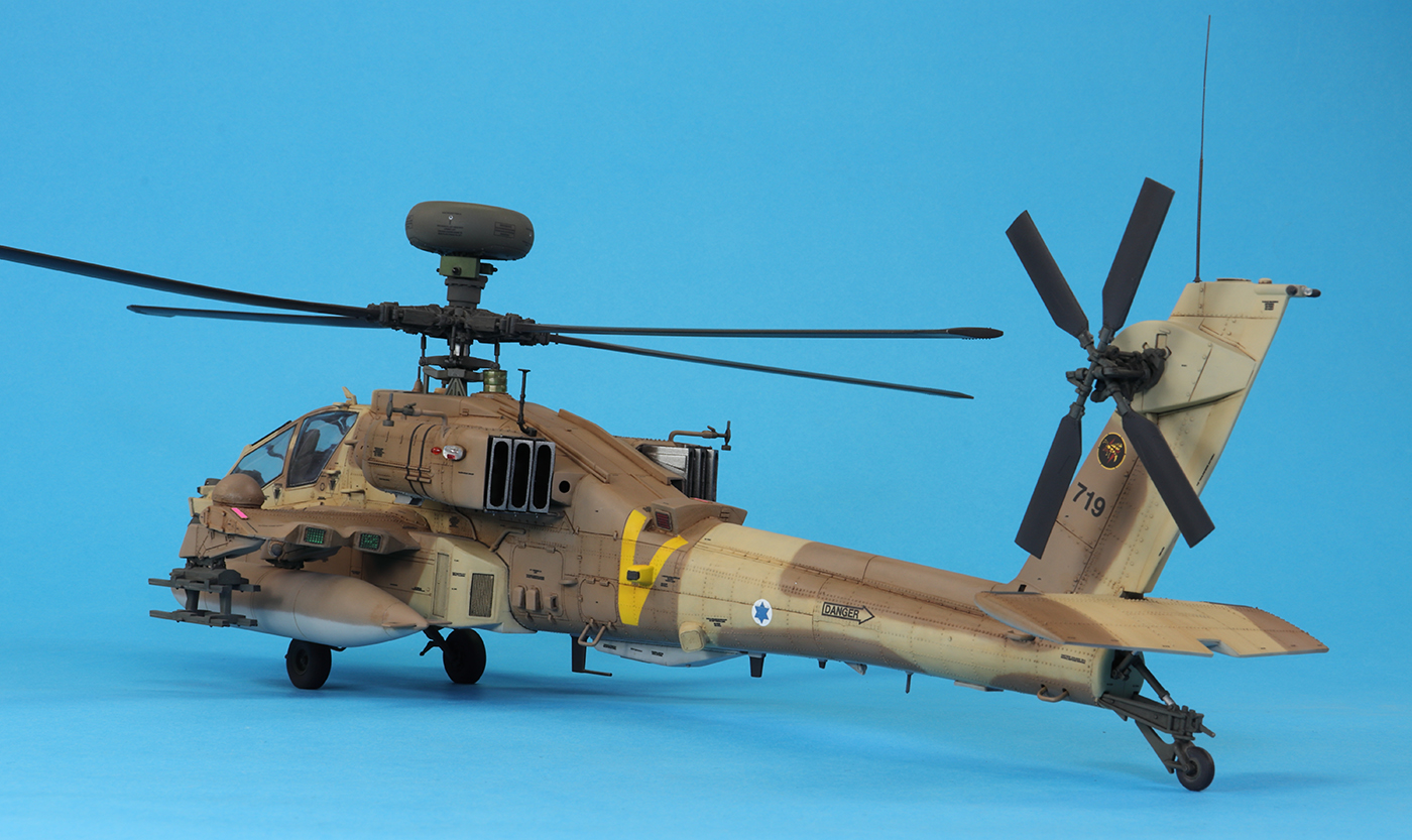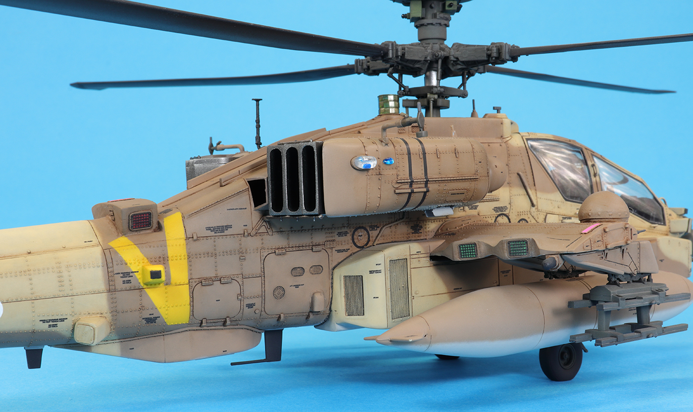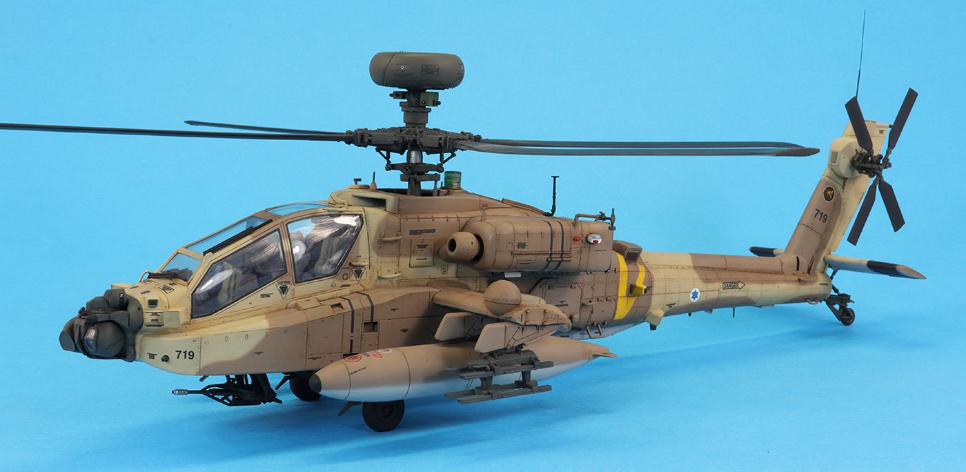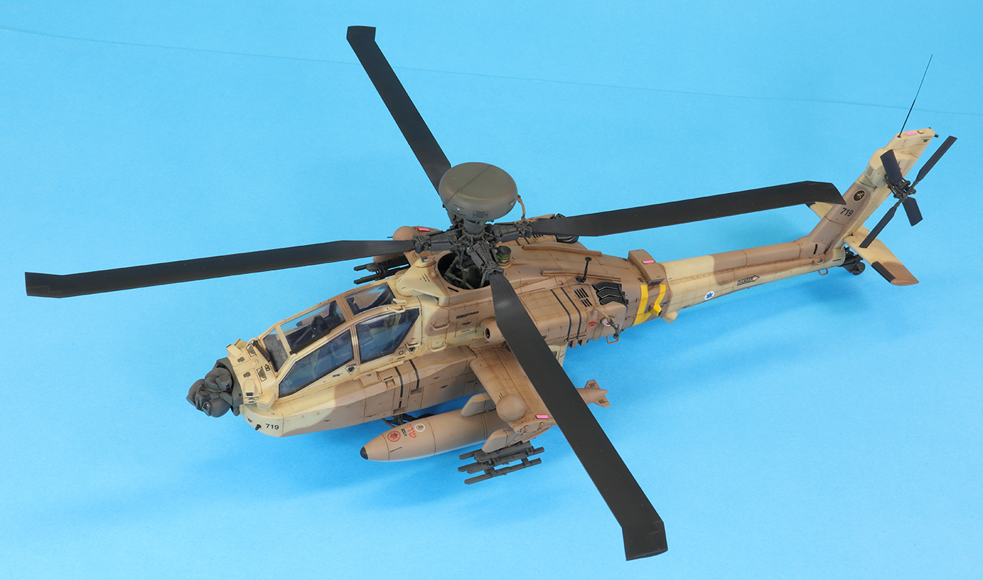 I have mixed feelings about the finished article. I really like the subject matter and it makes a great contrast to the dark green US Army Apache next to it in my display case. The base Hasegawa kit is great and I’ve had fun putting two of them together. However, the Wingman set is a bit of a disappointment, mainly because of the relatively poor casting quality but also because it was not quite complete and the fit rather poor. Were I after the perfect Saraf, I would try to get Hasegawa’s own AH-64D-I (sadly out of production) which I would expect to have better moulded resin for the main components. It would still need updating with the Wingman set to make up for some of what’s missing and would certainly be a very expensive project, but probably produce a better result.