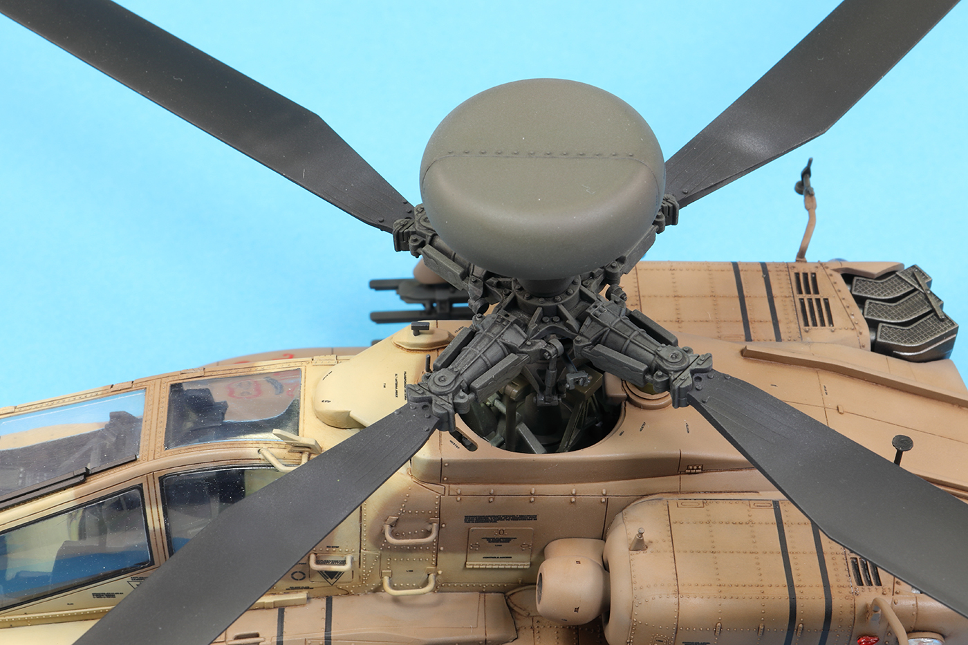 The de-icing wires for the main rotor blades (parts F1) are for earlier Apaches, so I left these parts off. The main rotors have a slight warp in them, unfortunately in the wrong direction, so they deflect up rather than down.