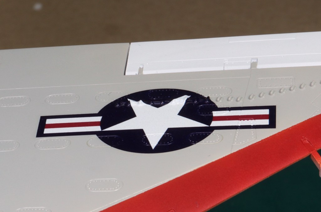 The big challenge with US Navy Skyhawks is getting the national insignia over the vortex generators on the wing. I applied it over a big puddle of Mr Mark Setter and then dumped a good quantity of Daco Red decal solvent on top of it. Beyond positioning *the decal was not touched* – no cotton bud to press it in place, no solution/water wicked away, etc. The decal was poked and prodded a bit with a brush laden with each solution. This was all done directly over the paint (no clear coat). After this, it looked like this: