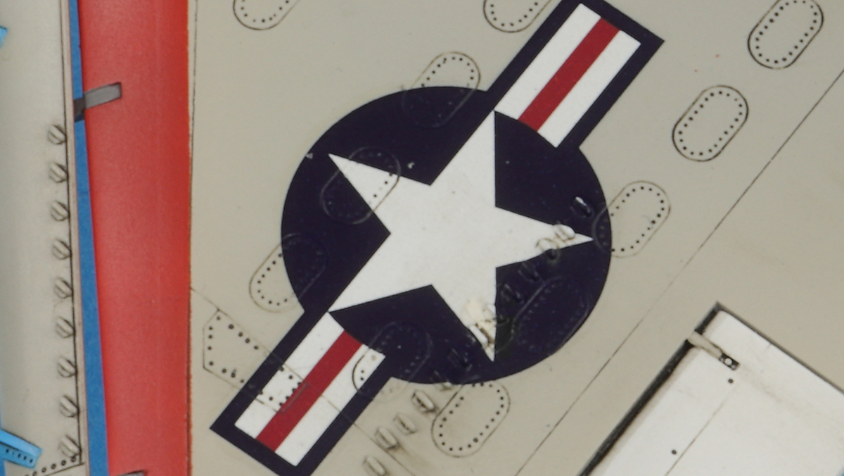 I was pretty impressed with this, but as you can see, all was not well. When poking and prodding the decal, I noted there was a ‘spongy’ section around one of the vortex generators. I decided to pick at it and, to my surprise, found that a section of blue backing paper had got under the decal – you can see it next to the decal on the wing. I ended up slicing some other decals to try and fix it. It isn’t perfect (especially under such magnification), but with the naked eye it’s acceptable:
