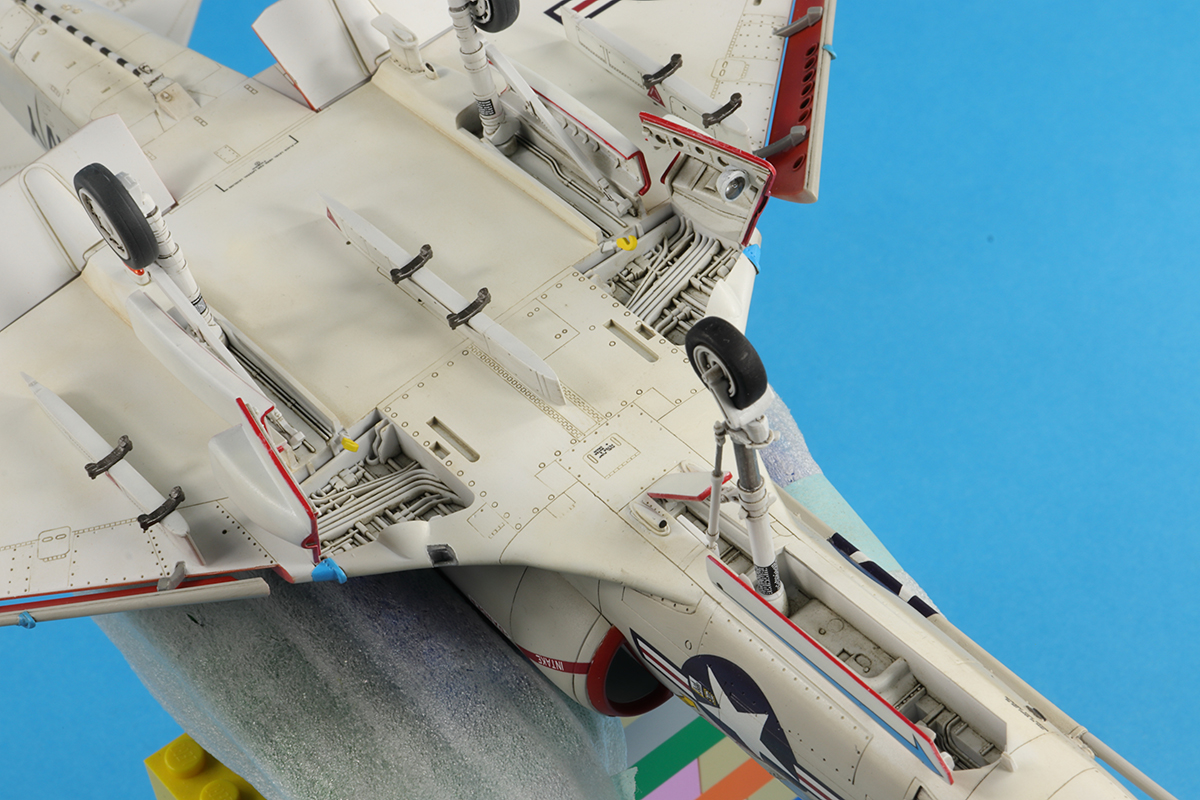 One of the big difficulties with USN subjects in this scheme is the red outlines to the undercarriage doors. I tried to deal with this by painting the interiors white first, followed by carefully hand painting the red under magnification. Once dry, I then sprayed the outer surfaces in white, angling the airbrush so that the red edges were preserved. I got the red outline on the nose door a little wrong.