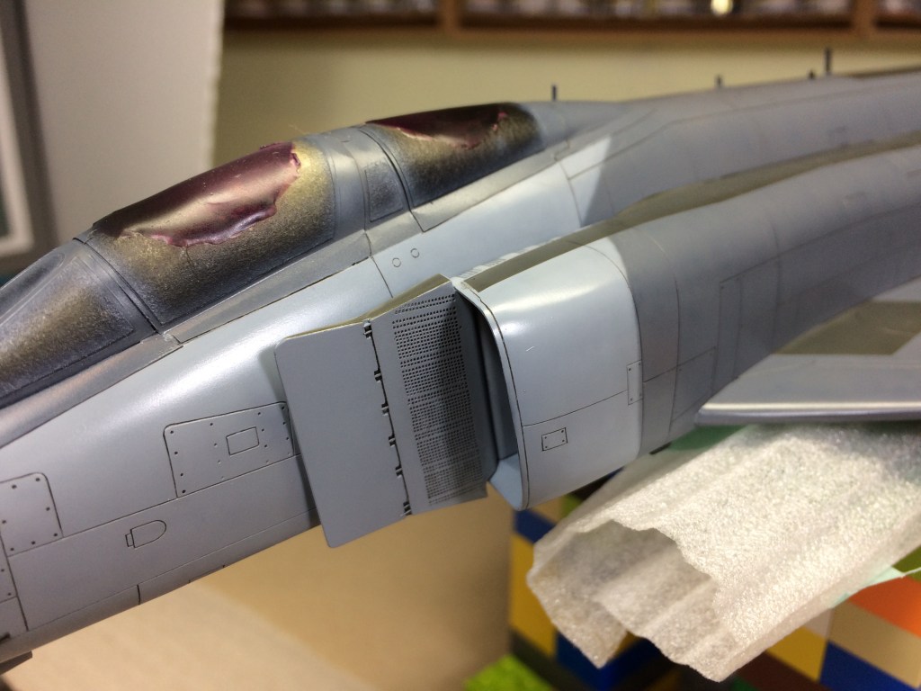 I’ve built a few Hasegawa Phantoms in 1/48 scale now (this is my 8th). Building three at one time showed me that there are some imperfections that I had always put down to careless construction on my behalf, but are actually mould imperfections as they appear on all the kits. I did not realise this until too late, but there are a few pits on the lower wings, a scratch in the plastic between the wing trailing edge and the exhaust, and an imperfection that runs along the centre line in between the forward Sparrow wells. These are on all the Hasegawa F-4s I have.