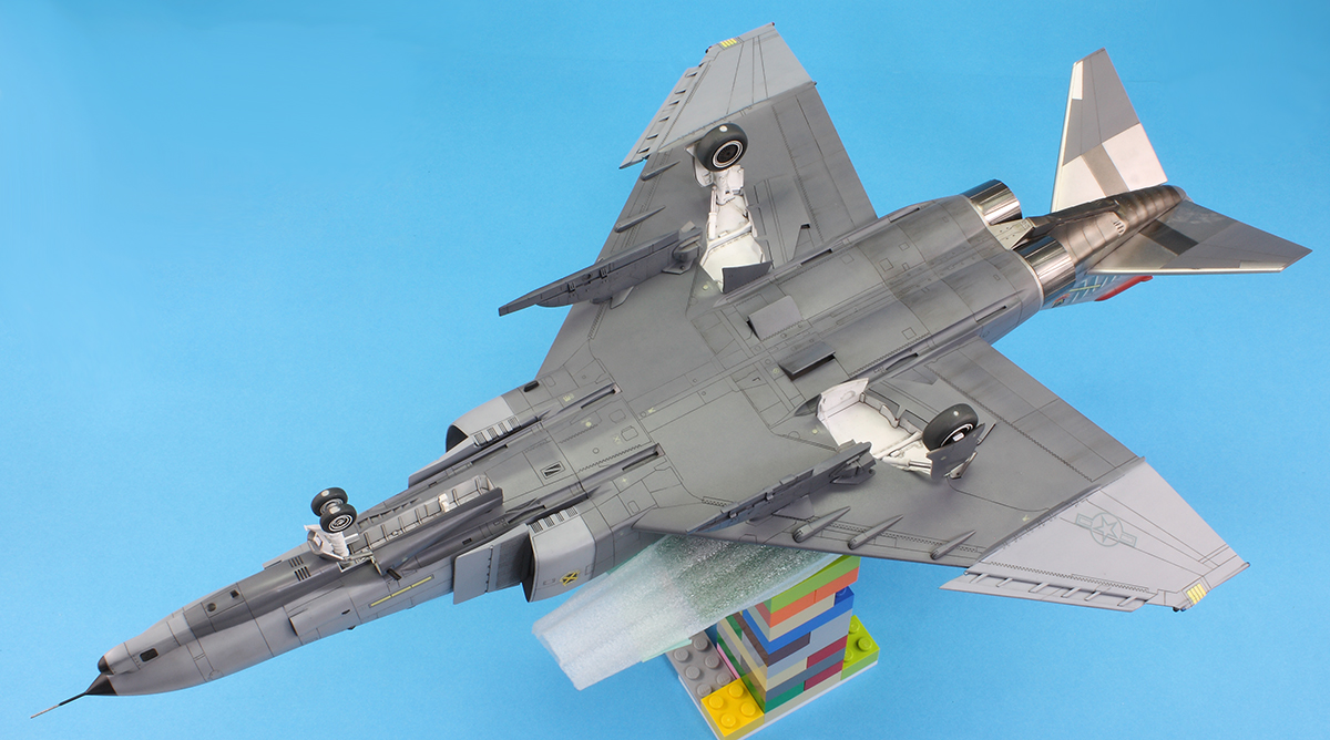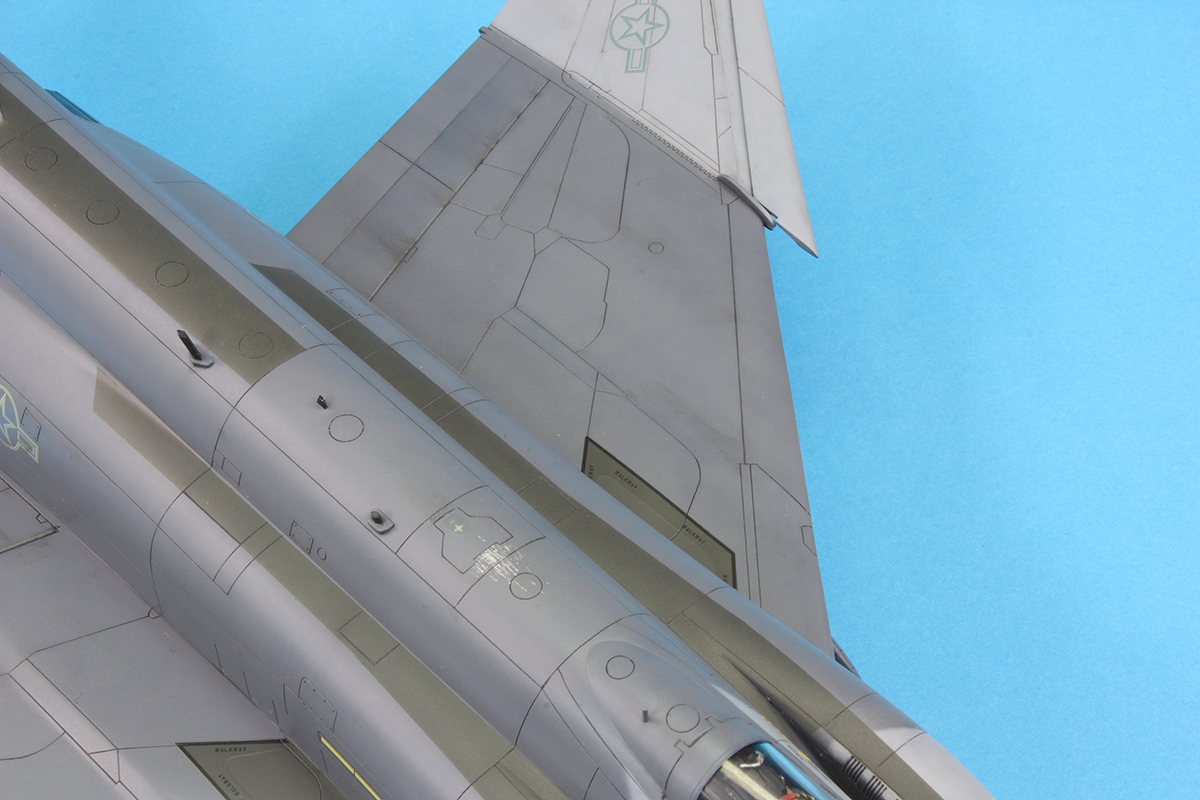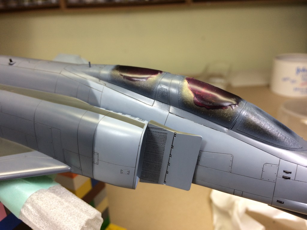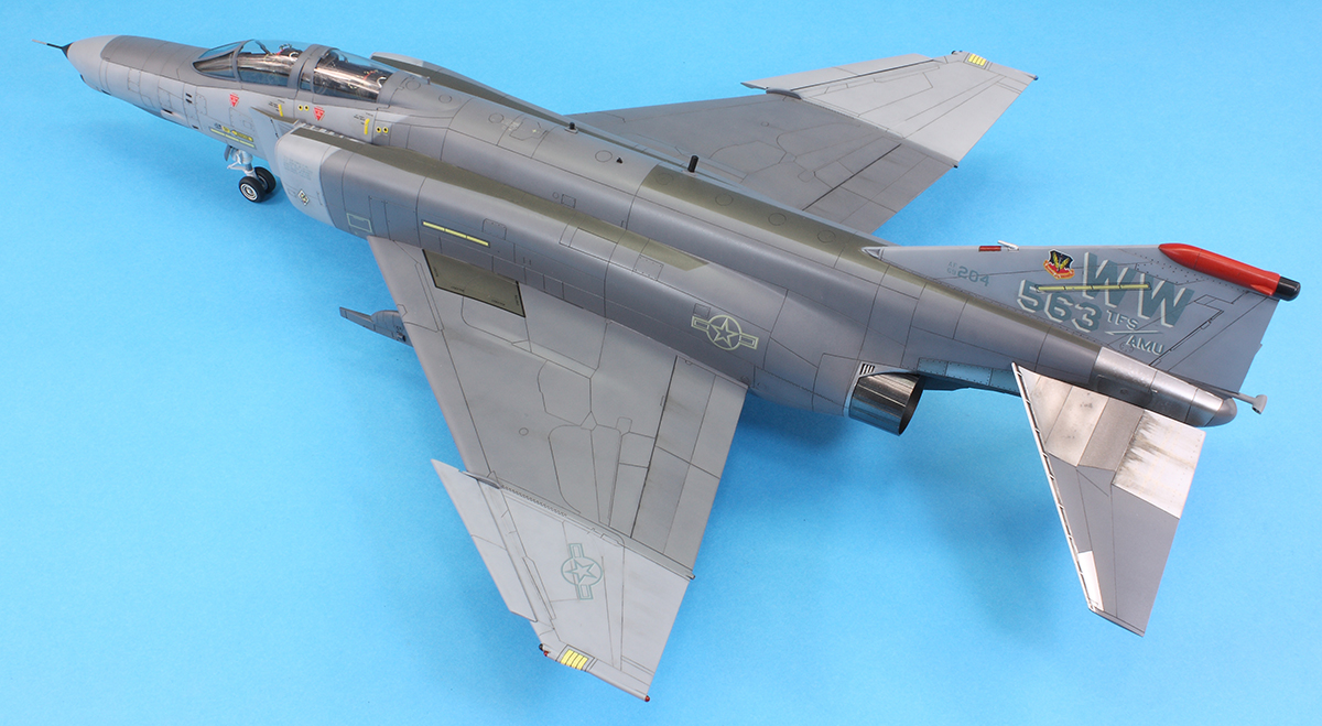 I kept weathering to a minimum, limiting it to a dark grey pin wash of oil paint and some streaking with the same paint mix. I had added an Alclad II aluminium undercoat just forward of the air-to-air refuelling door and scratched back the Mr Color 305 with a scalpel to create some scratches. I feel I did a better job this time than on my F-4E.