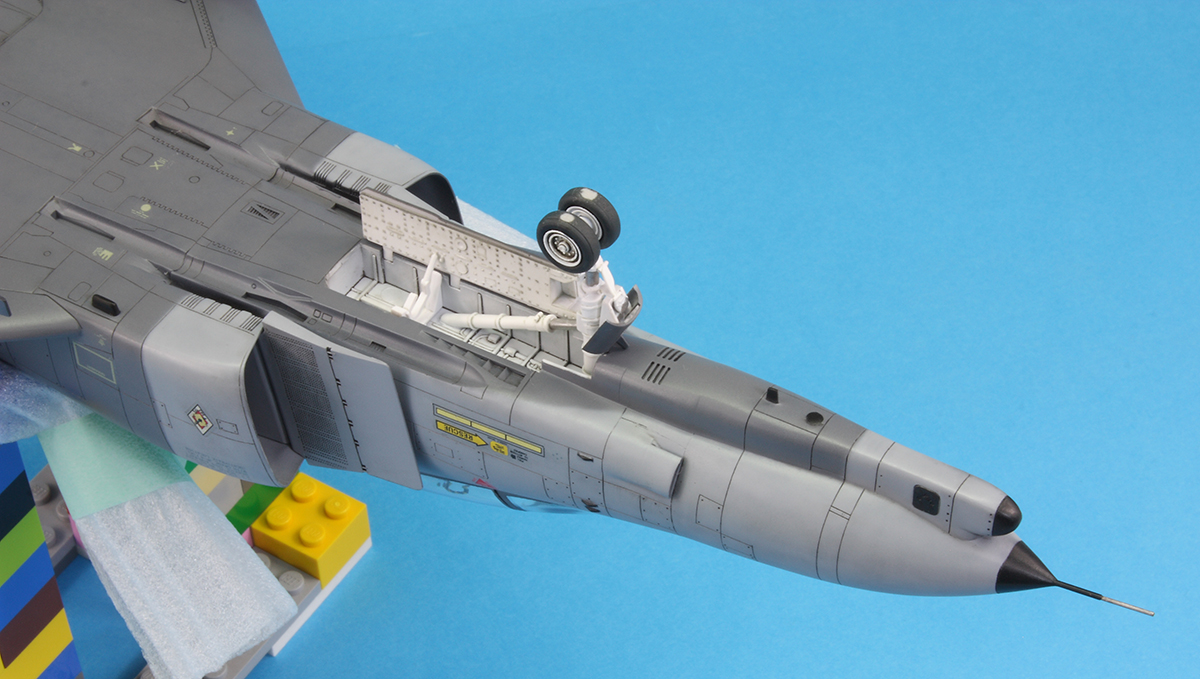 As mentioned above, I think the decals for the dark-grey walkways are not quite the right shape, so I masked them out and used Mr Color 301 instead. The black edging and ‘walkway’ text for the areas on the wing were added later using some spare decals from an F-4E. The exhaust areas were painted with various shades of Alclad II and the red fin tip with Mr Color 327. There are numerous black aerials that needed masking and spraying with Mr Color 33. When airbrushing Mr Color paints through the Custom Micron I thin the paint highly with Mr Leveling Thinner and add a few additional drops of Mr Retarder Mild. Whilst this method of painting is time consuming, it is efficient on paint: the whole airframe was painted with less than 1ml of 305 and 1ml of 306.