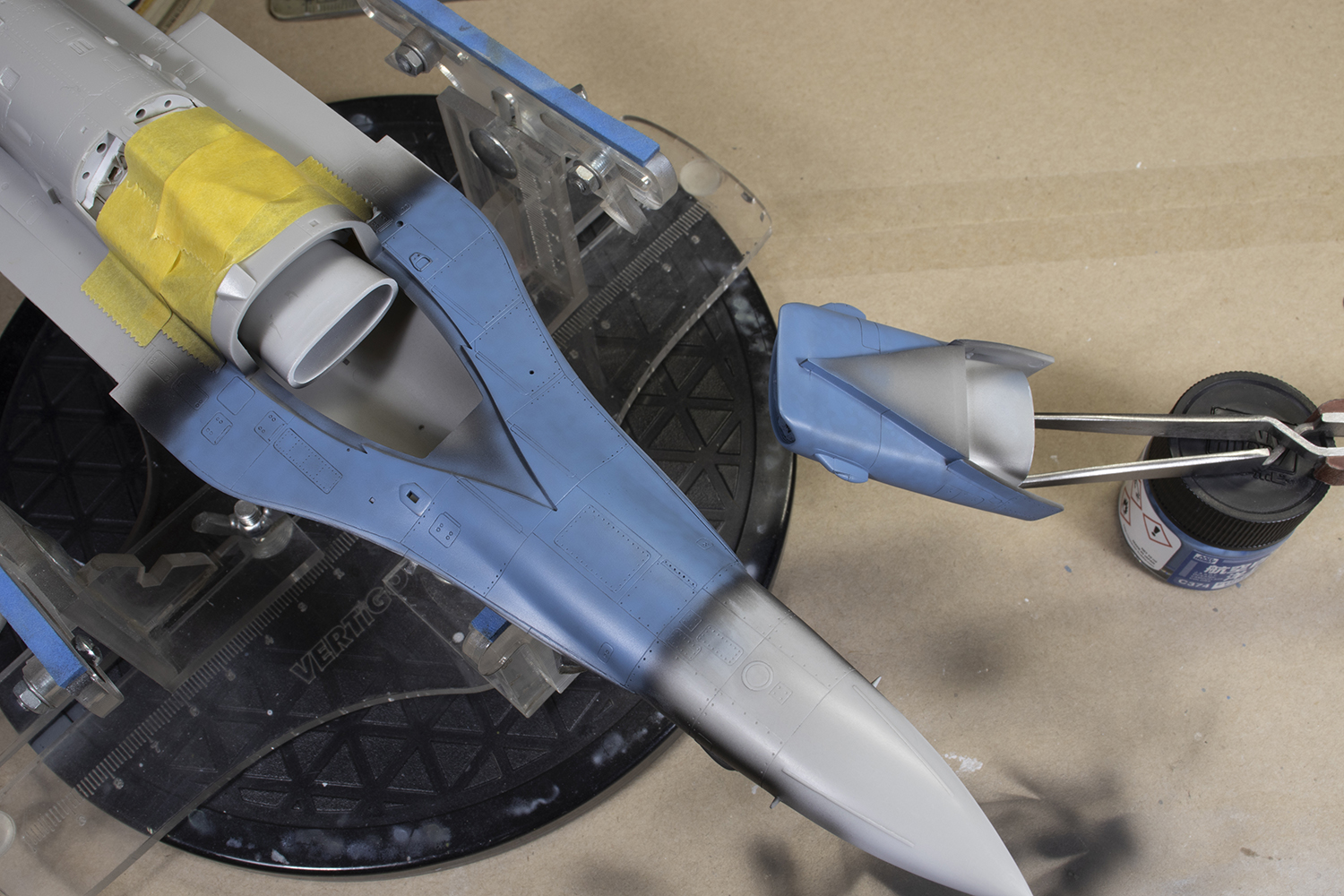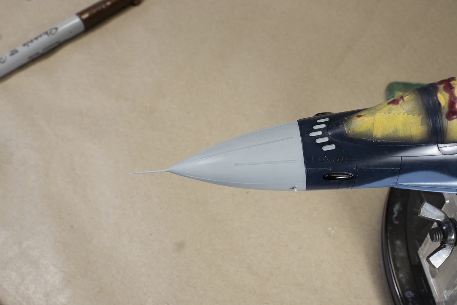In order to avoid gritty paint in the deep recess between the intake and the lower fuselage, I finished and painted up the intake first, and also the lower fuselage around the nose. I could then attach the intake without having to worry about painting this area later.