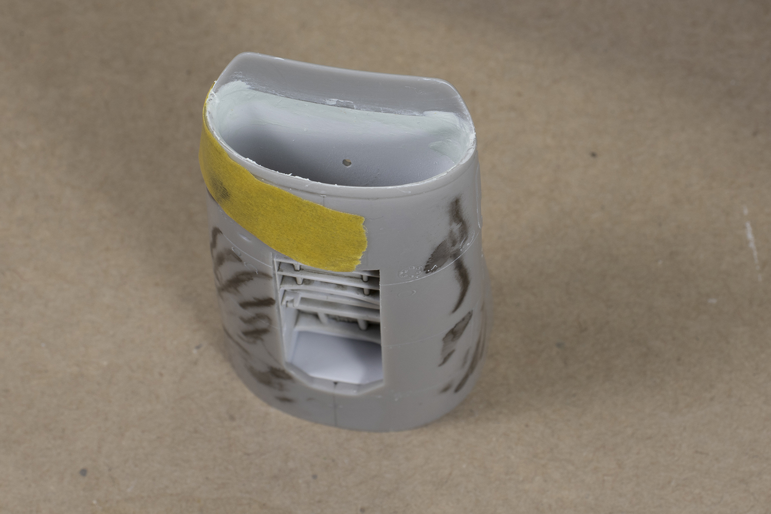 The inner seams were dealt with using Milliput Silver-Grey followed by applications of thickened Mr Surfacer 500 and super glue where required. This was an iterative process with multiple rounds of filling, sanding and painting until I was happy. For sanding the difficult-to-reach seams I used various sanding implements, most important of which were some butchered Infini sanding sponges. These can be gripped in reverse tweezers for access and are flexible enough to conform to the intake shape. It’s slow and tedious work, but necessary for such a focal point of the aircraft.