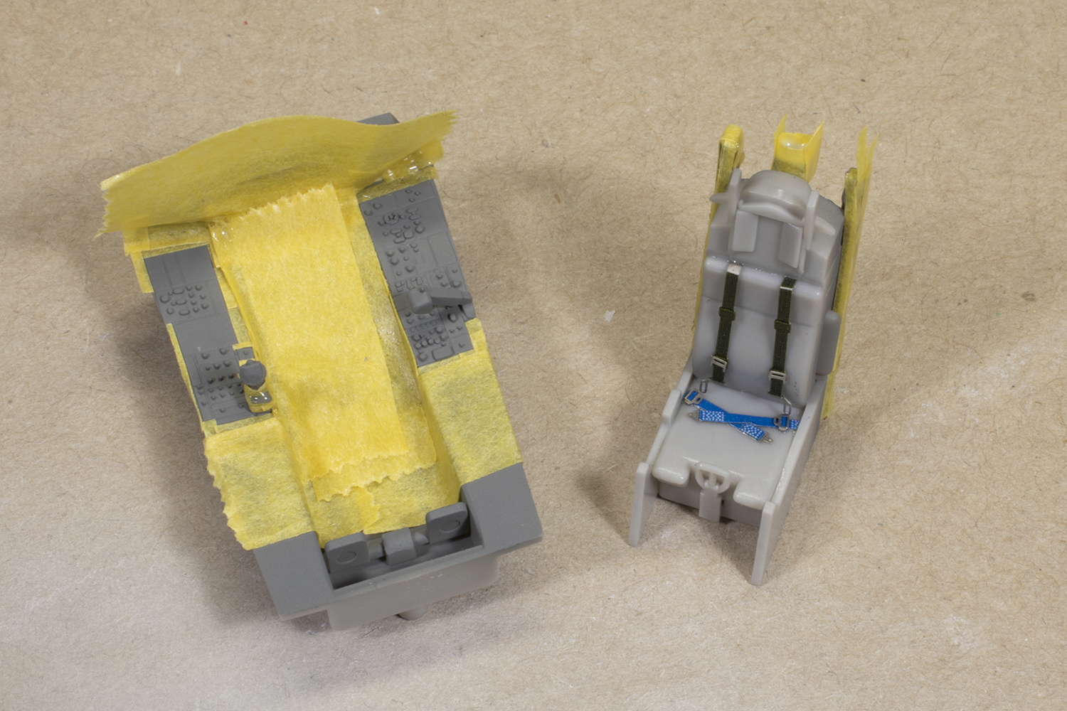 The cockpit is therefore as supplied by the big H, with only some seatbelts added from a spare Eduard etched set I had lying around. I used Mr Color 317 for the tub and back of the seat and masked it off before spraying the panels and rest of the seat in black. Mr Color is my staple paint, partly because I acquired most of the range when I lived in China, but also because it can be thinned heavily with Mr Color Leveling Thinners and therefore lasts for ages, sprays beautifully, and dries quickly and hard. Long gone are the days of waiting for enamels to dry – this stuff can be handled and masked in minutes.