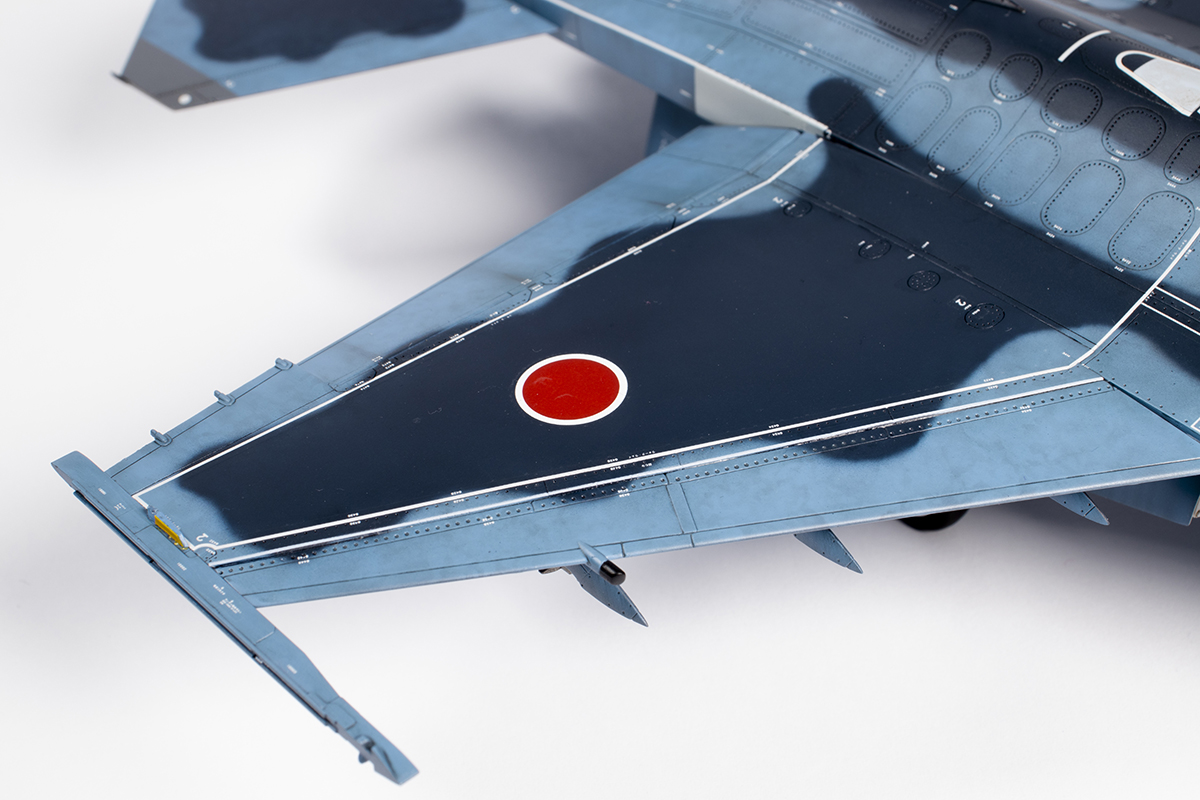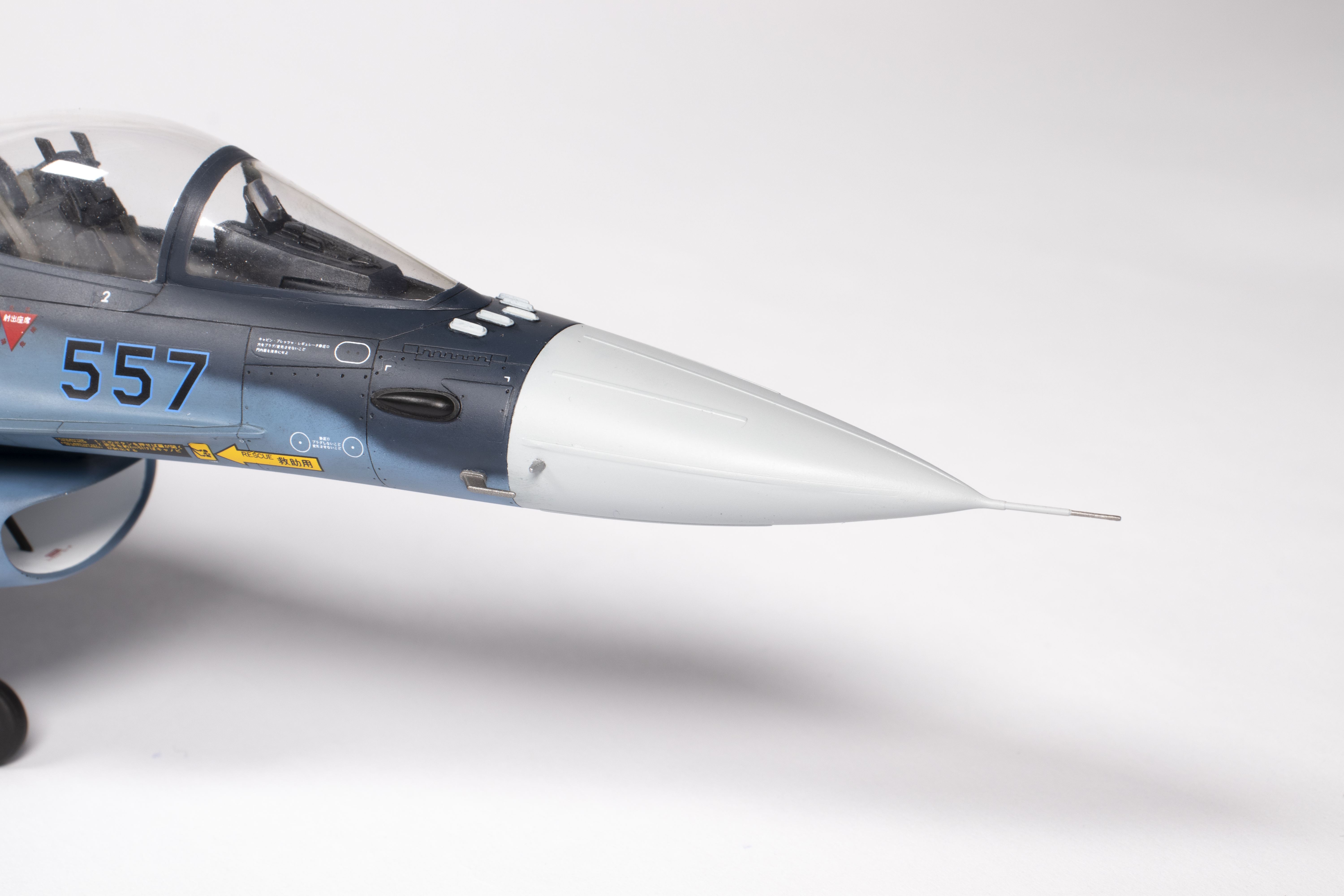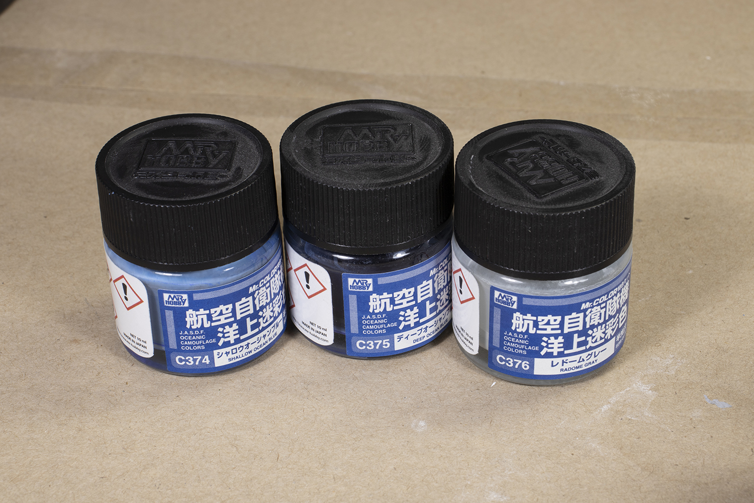 We might as well, then, talk about paint now. The F-2 only comes in one colour scheme, but what a scheme it is: two beautiful shades of blue offset by a smart grey radome. In recent years GSI Creos have come out with a dedicated set of Mr Color paint for this aircraft comprising two blues (C374 and C375) and light grey (C376) and the colours look excellent.