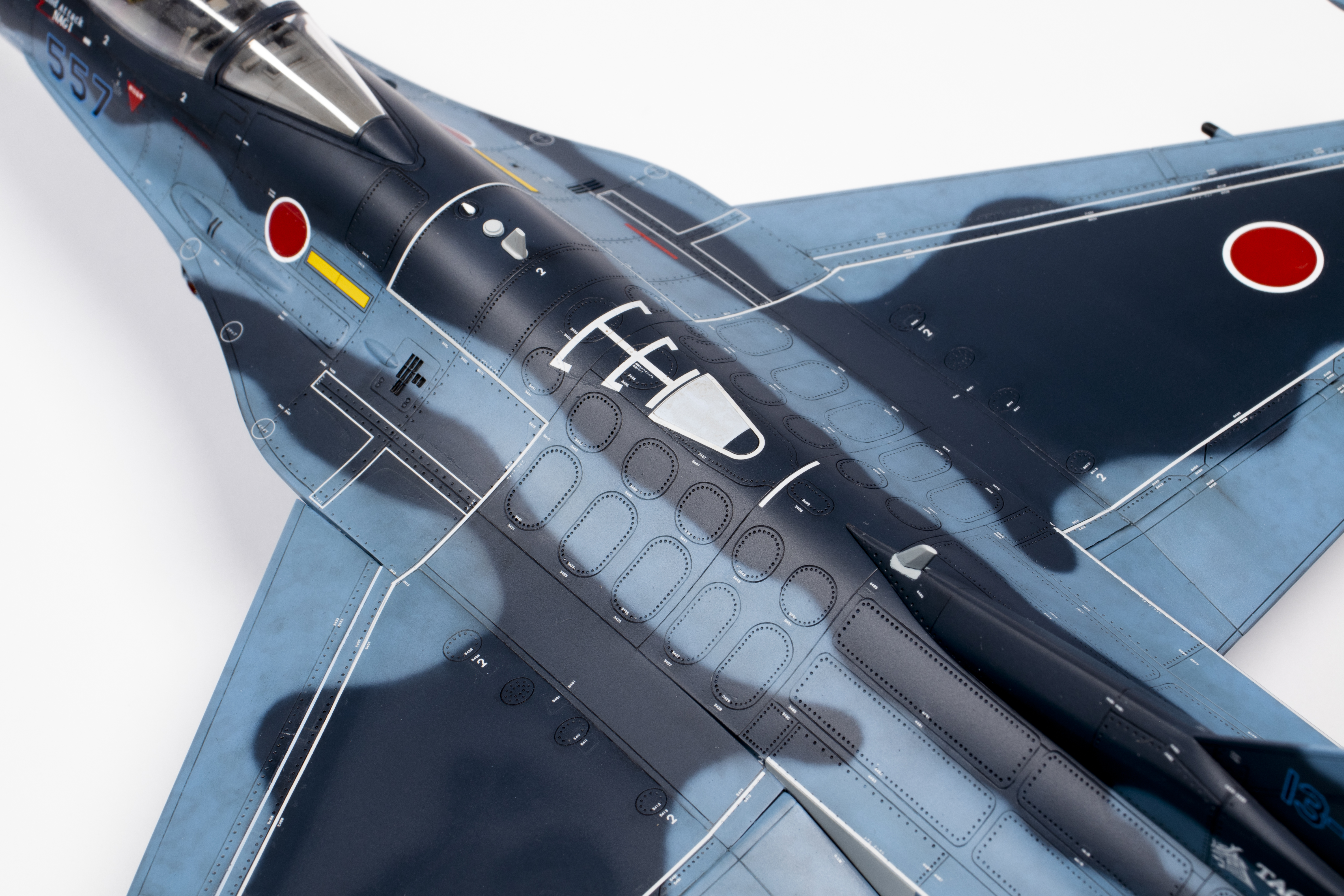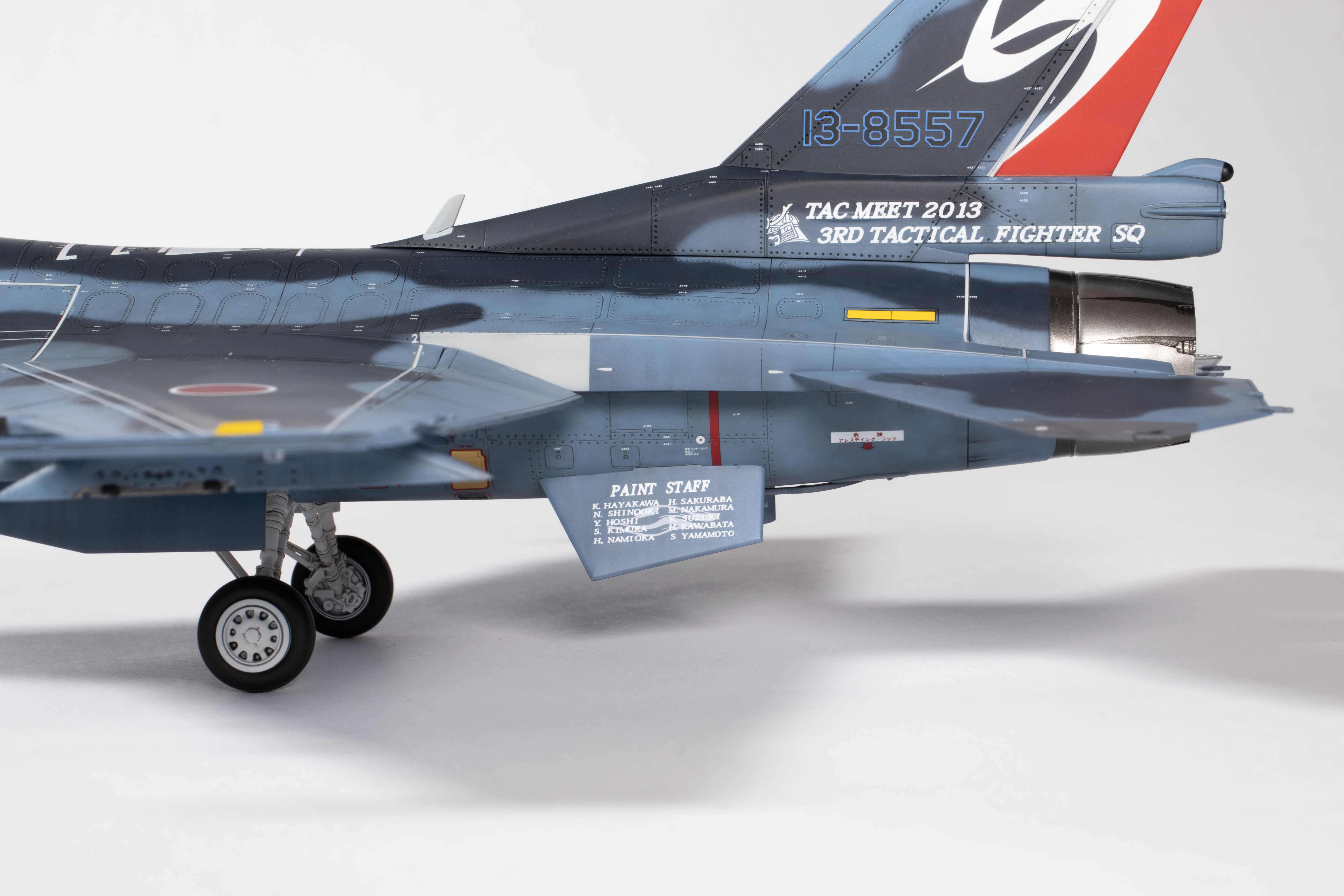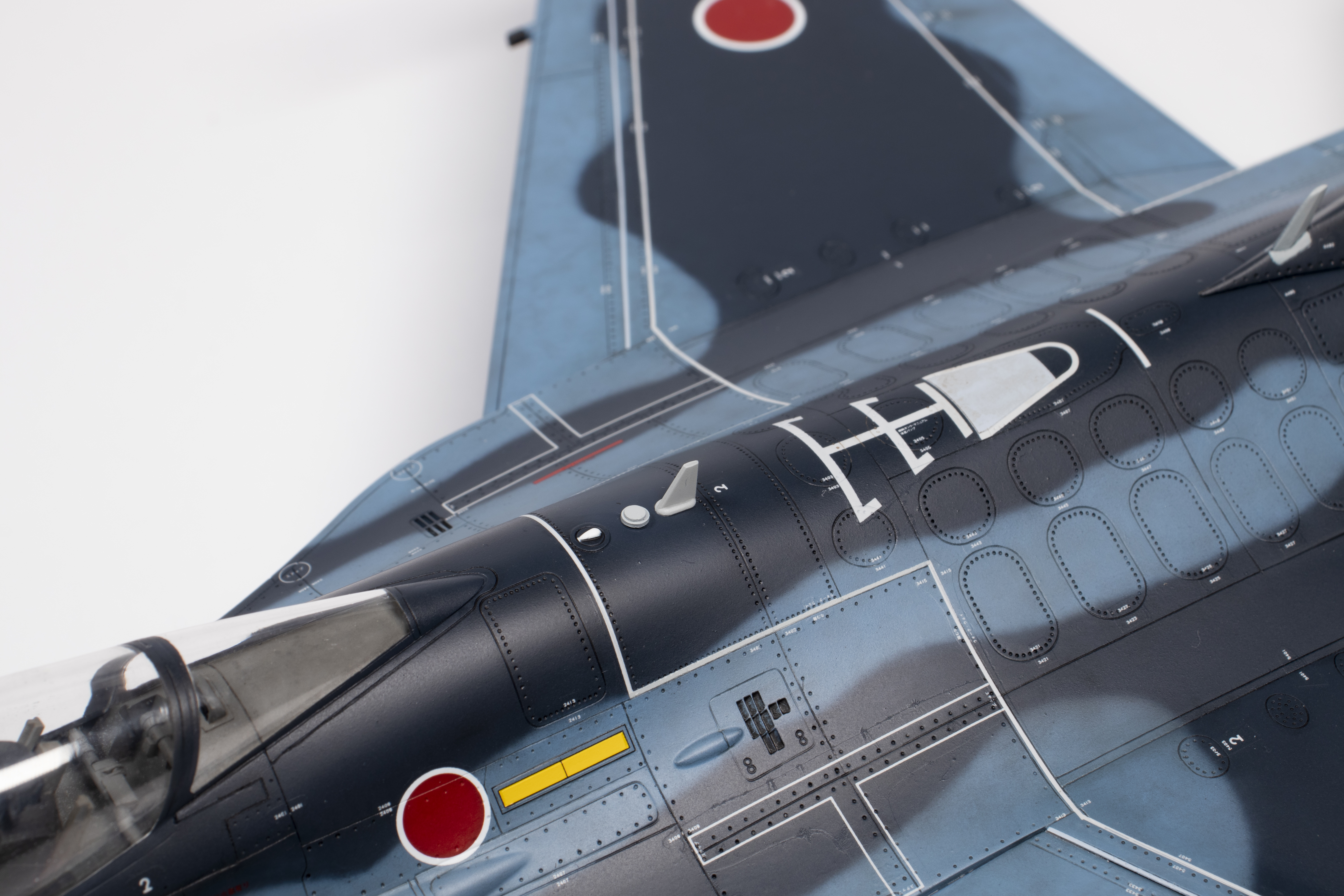 We might as well, then, talk about paint now. The F-2 only comes in one colour scheme, but what a scheme it is: two beautiful shades of blue offset by a smart grey radome. In recent years GSI Creos have come out with a dedicated set of Mr Color paint for this aircraft comprising two blues (C374 and C375) and light grey (C376) and the colours look excellent.