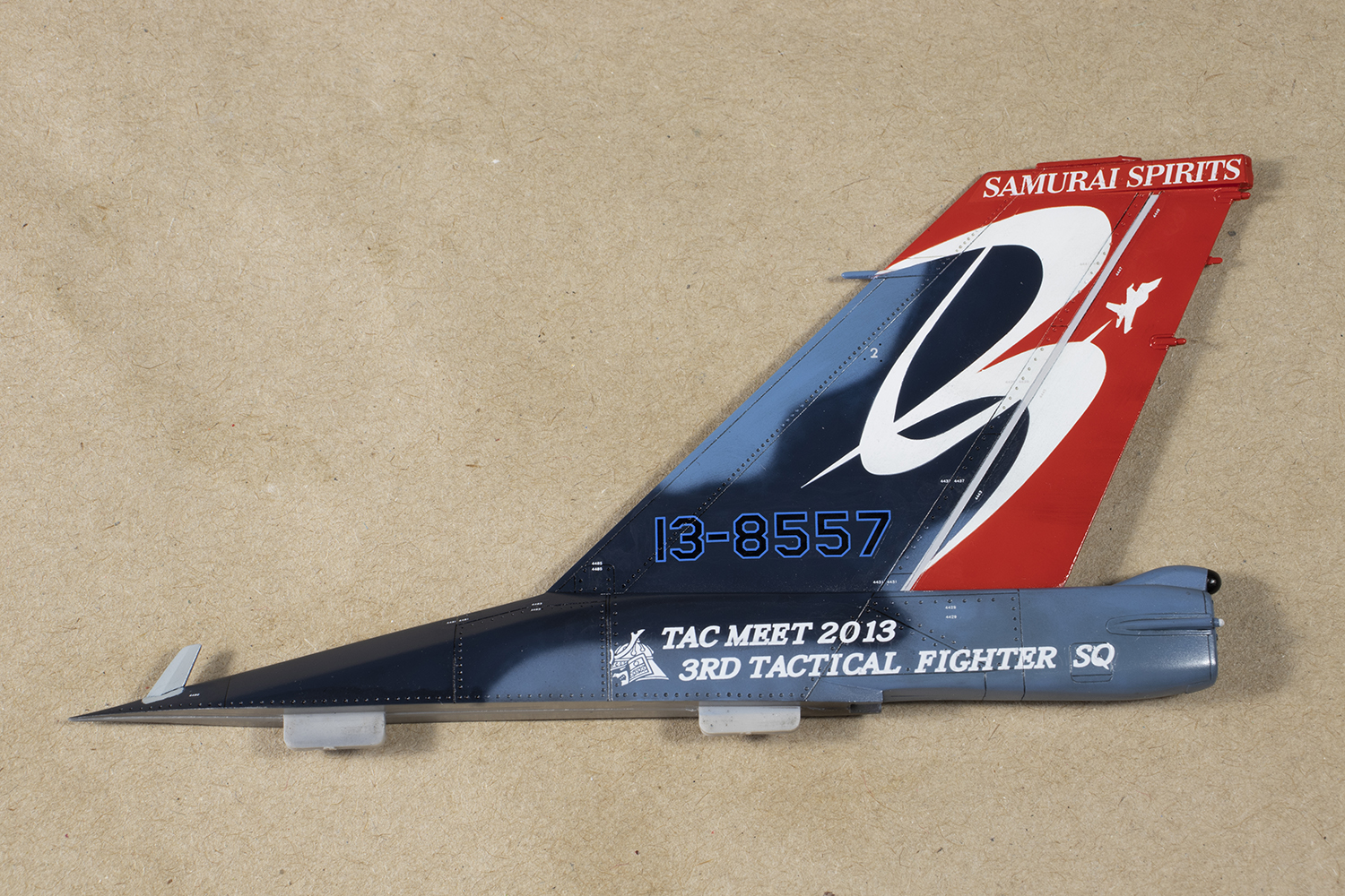 I dealt with the vertical tail in a completely different manner. The artwork is striking and supplied as a large decal. Such decals can be fraught with problems, not least the question of whether it would fit. I therefore decided to see if I could cut my own masks for the red and white areas. This would be a real challenge as the white silhouette of the F-2 in the image is pretty tiny. Nevertheless, I scanned the decals into Inkscape (a free vector graphics package) and traced the outlines. I then exported it as a .dxf file in the supplied program with my Silhouette Portrait 2 cutter. Using this machine, I cut the masks into vinyl. I was surprised at how well they came out, and the detail around the F-2 image was good enough. For those who are interested, the settings were Depth 2, Force 2, Speed 1, Overcut 0.01mm. I started with the white (Mr Color 1), masked this, then airbrushed the red. The problem was, I needed this to match the decals because I would be forced to use the red and white ‘SAMURAI SPIRITS’ logo at the top of the tail. I experimented with Tamiya X-7 Red and Mr Hobby Aqueous 14 Orange, eventually settling on a mix of about 75% red to 25% orange to match the vivid shade used by DXM. Last were the two shades of blue for the underlying finish.
