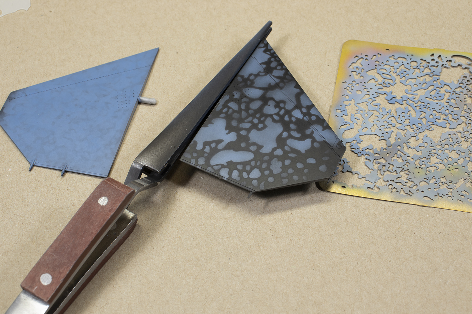 A lot of my weathering is oil-based. I like Abteilung 502 oil paints and used a variety of shades to mix some desaturated blues as a pin wash. I apply this directly on top of the paint, and thin the oils with Zippo lighter fluid. This evaporates very quickly, which is something I appreciate. Rather than use cotton buds to remove the excess, which tend to leave fibres everywhere, I do a lot of the work using some foam-tipped cleaning swabs. I rarely use any thinner on the swab. Once the basic wash was down, I focussed on some areas, like the flap hinges, to add some streaking and mottling.