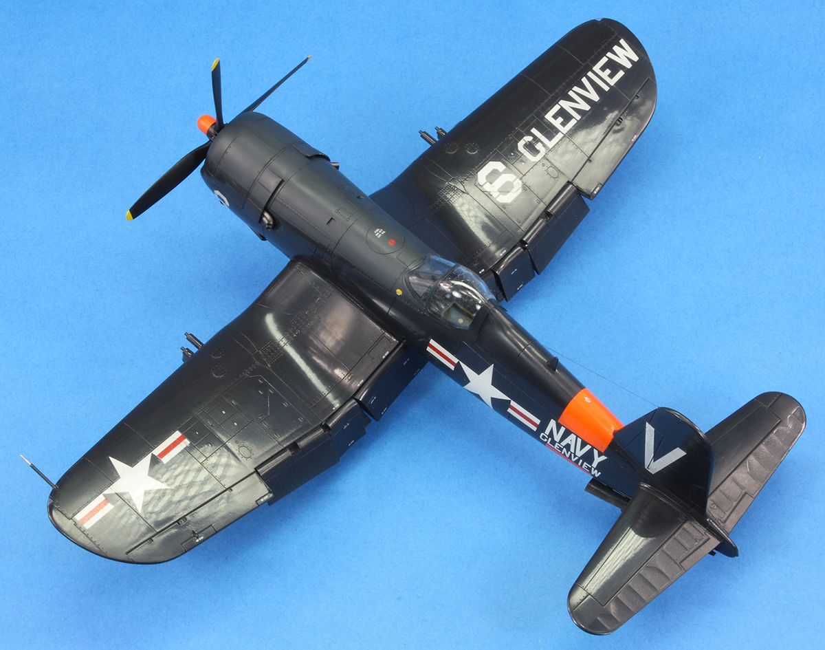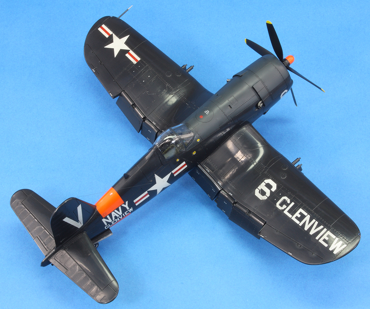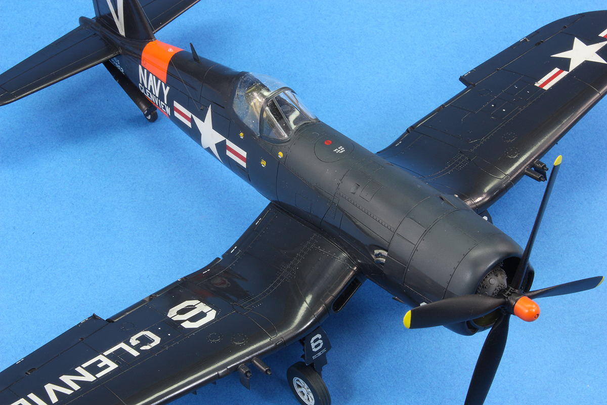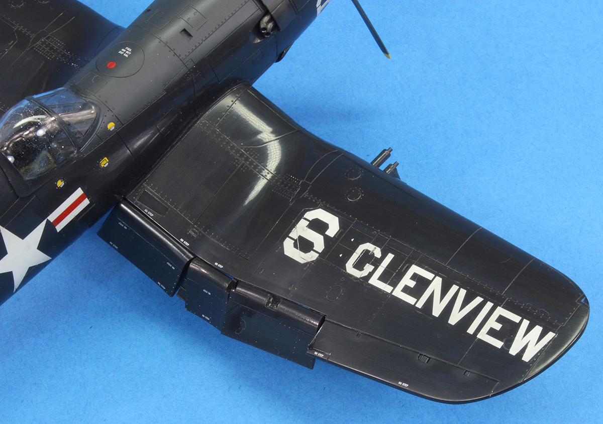 However, it also immediately revealed a few problems. First, Hasegawa suggest the anti-glare panel should be black. Clearly this is wrong, and I found out it should be non-specular Sea Blue. Second, the wheels in the kit are incorrect. Third, Hasegawa do not supply a number of white markings or stencils, such as those under the canopy. Fourth, the colour of the prop boss is ambiguous; Hasegawa suggest Orange. Fifth, this Corsair (and at least others at Glenview) had different exhaust pipes that bend outwards and down. On the other hand, the markings that are provided looked really well-designed, even if the decals were typical Hasegawa of the era: thick and translucent. It’s also worth noting that while many Glenview and other Reserve Corsairs had their tailhooks removed, this example still had it.
