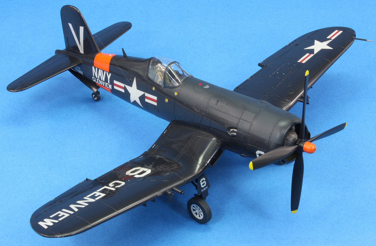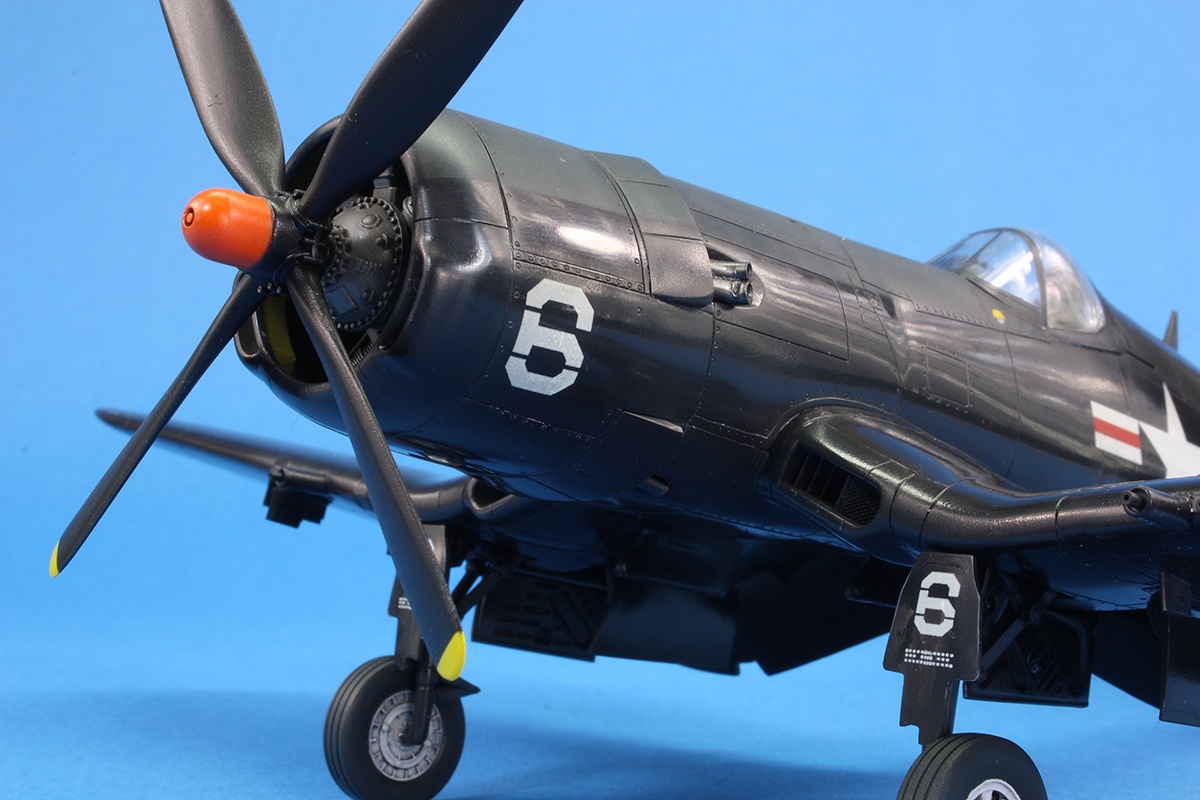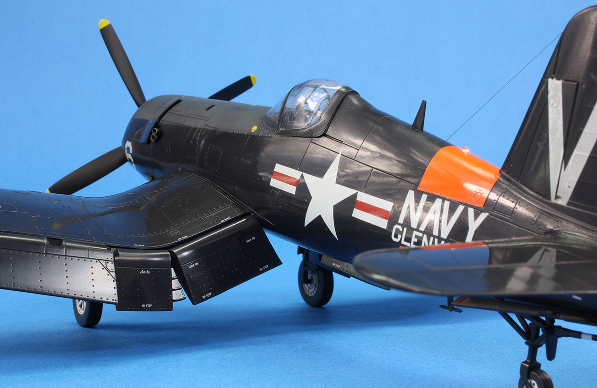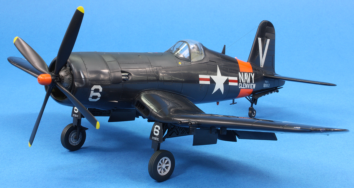 However, it also immediately revealed a few problems. First, Hasegawa suggest the anti-glare panel should be black. Clearly this is wrong, and I found out it should be non-specular Sea Blue. Second, the wheels in the kit are incorrect. Third, Hasegawa do not supply a number of white markings or stencils, such as those under the canopy. Fourth, the colour of the prop boss is ambiguous; Hasegawa suggest Orange. Fifth, this Corsair (and at least others at Glenview) had different exhaust pipes that bend outwards and down. On the other hand, the markings that are provided looked really well-designed, even if the decals were typical Hasegawa of the era: thick and translucent. It’s also worth noting that while many Glenview and other Reserve Corsairs had their tailhooks removed, this example still had it.