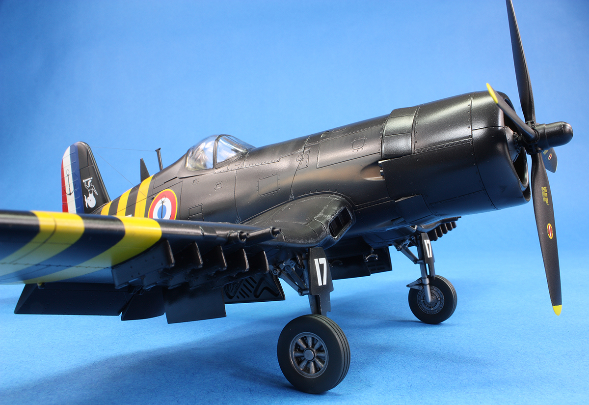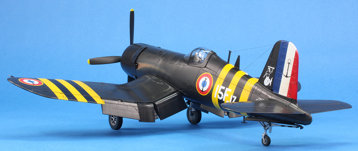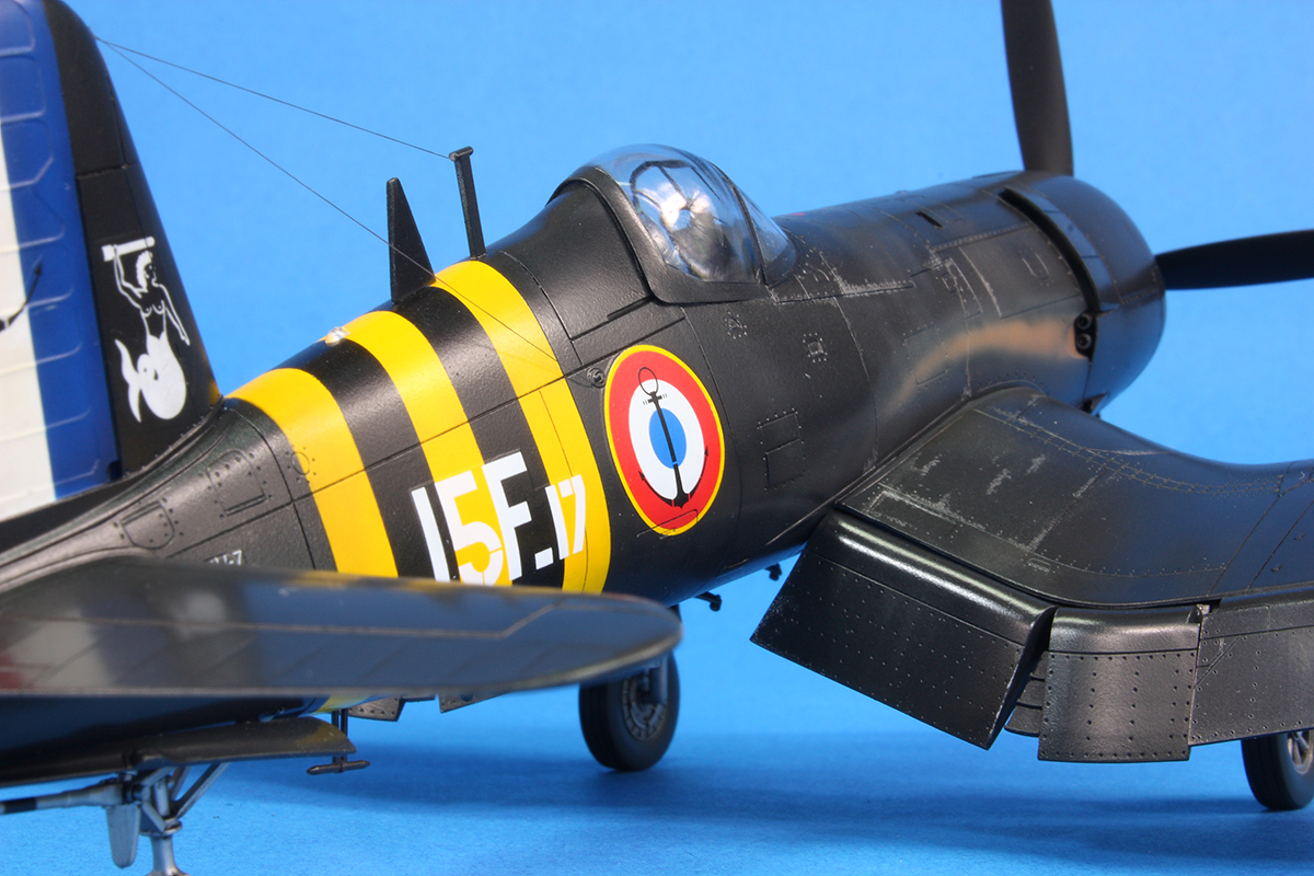 There are also several accuracy issues that vary with the variant. As soon as the kit was released there were comments that the wheels were too narrow. I had intended to replace them with some resin True Details wheels, and indeed found a good number of photos showing French Aéronavale Corsairs with the early style spoked wheels. However, right near the end of the build I stumbled upon a photo of a 15F Corsair in Suez stripes that had the later style wheels. I duly purchased a resin set from CMK to replace the kit wheels. These were nice, but it appears the masters were 3D printed and the wheels spokes are not perfectly smooth.
