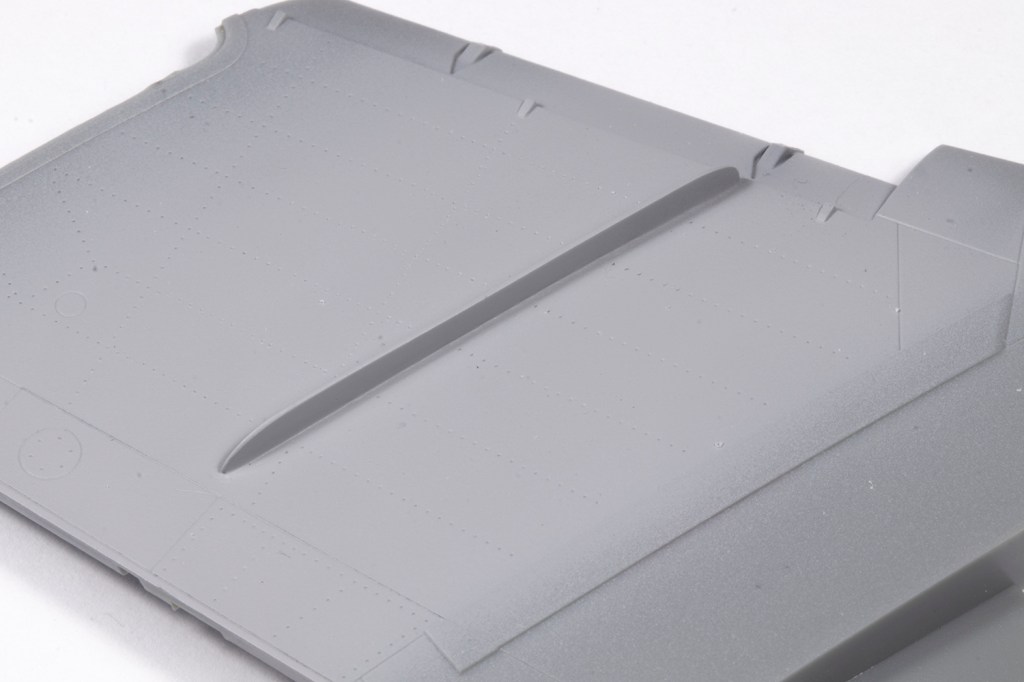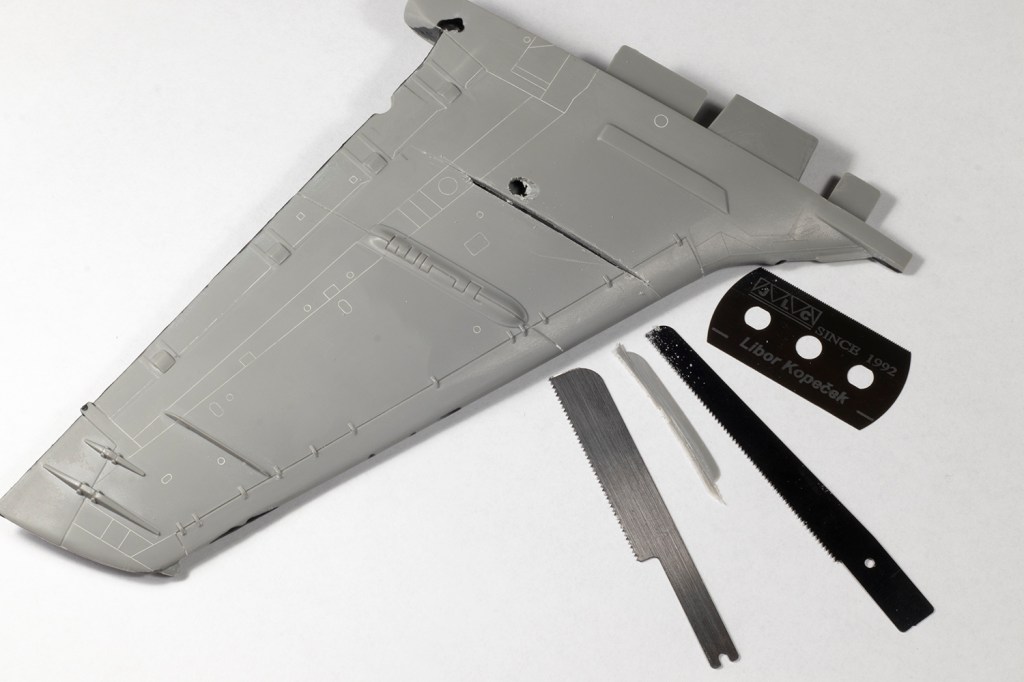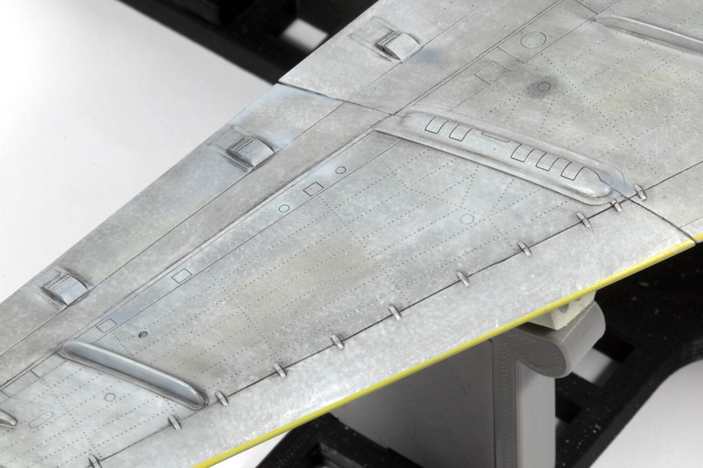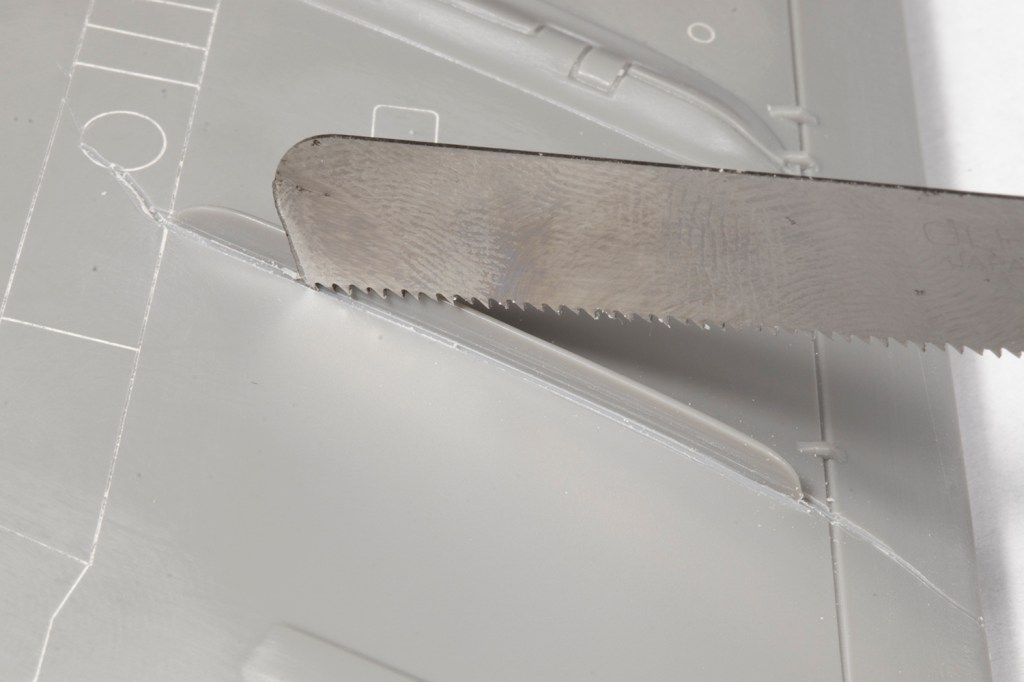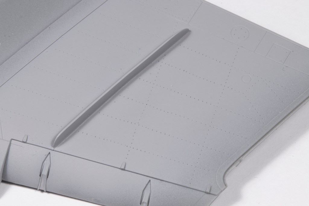Initially I was reluctant to make the change. It would be very finnicky to get a decent looking result and clearly almost no one knows about this inaccuracy, but in the end I gave in and decided to move the inner wing fences. They should be 7mm (give or take) closer inboard. Rather than try and remove and reuse the moulded inner wing fence, I decided to hack it out from my discarded Revell kit. This took a while as the plastic is very thick, but allowed me to simply cut away the Hobby Boss fence from the wing without having to save it. The Revell fence was not quite the right profile to fit the wing, so I stuck down some Infini self-adhesive 400 grit sanding paper to the wing and gently massaged the Revell fence over the top of it using some locking tweezers. Eventually I had a new inner wing fence that fitted nicely and could be glued down. Where the old fence had been removed I restored the rivet detail with a 0.75mm rivet wheel from RB Productions. Truth be told, the kit doesn’t need rivets and would be better without them, but filling and sanding them all down looked too tedious.