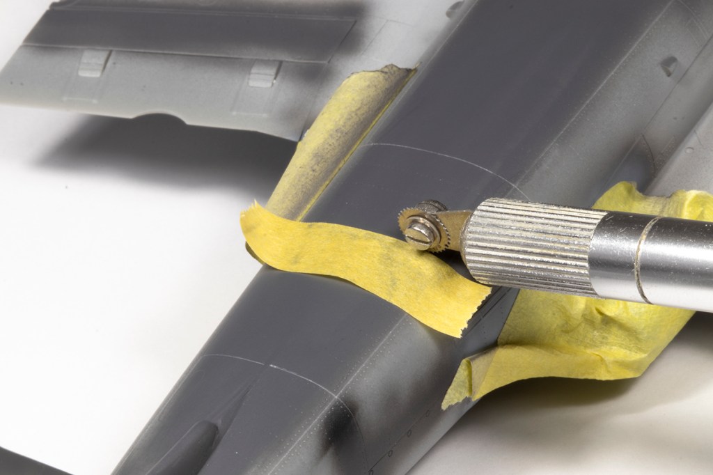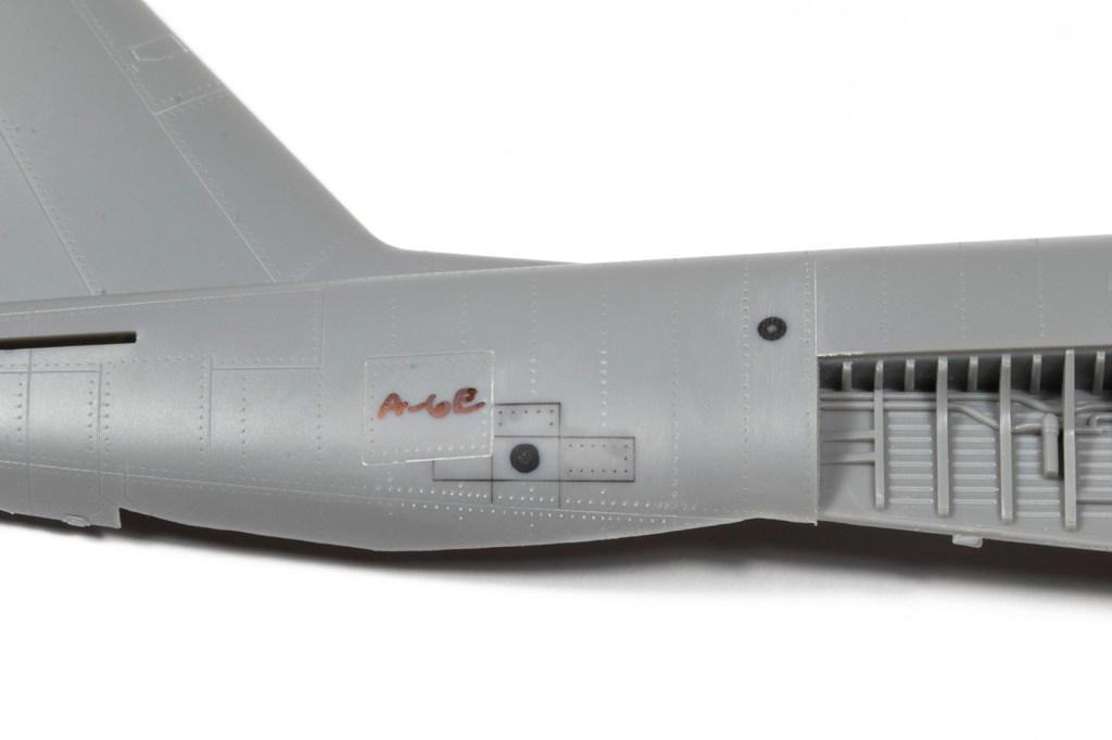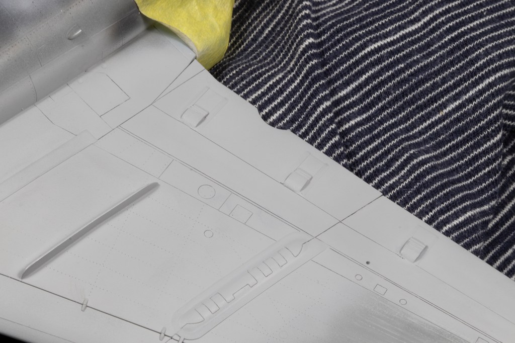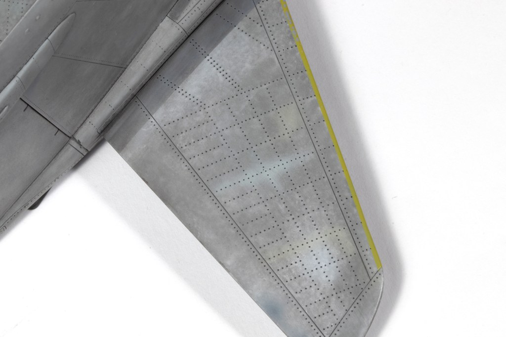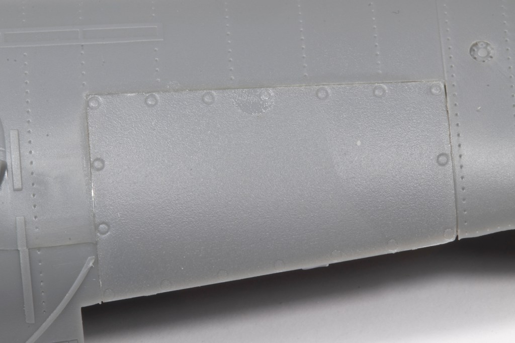 Initially I was reluctant to make the change. It would be very finnicky to get a decent looking result and clearly almost no one knows about this inaccuracy, but in the end I gave in and decided to move the inner wing fences. They should be 7mm (give or take) closer inboard. Rather than try and remove and reuse the moulded inner wing fence, I decided to hack it out from my discarded Revell kit. This took a while as the plastic is very thick, but allowed me to simply cut away the Hobby Boss fence from the wing without having to save it. The Revell fence was not quite the right profile to fit the wing, so I stuck down some Infini self-adhesive 400 grit sanding paper to the wing and gently massaged the Revell fence over the top of it using some locking tweezers. Eventually I had a new inner wing fence that fitted nicely and could be glued down. Where the old fence had been removed I restored the rivet detail with a 0.75mm rivet wheel from RB Productions. Truth be told, the kit doesn’t need rivets and would be better without them, but filling and sanding them all down looked too tedious.