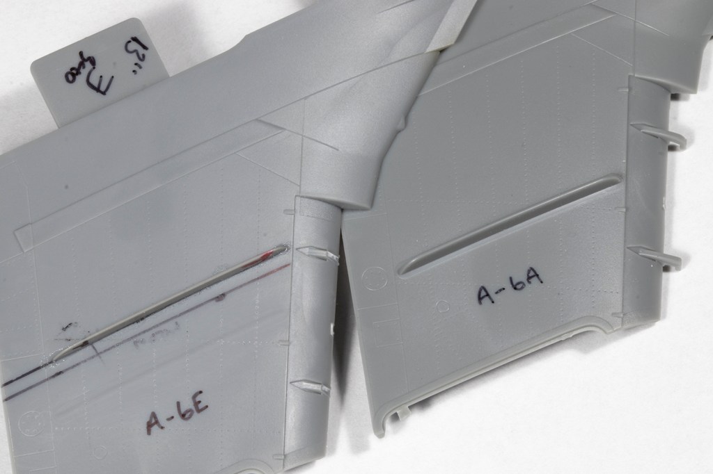 The Hobby Boss A-6E TRAM boxing takes care of a lot of the changes from the A-6A, but not all of them. Distinguishing A-6 variants is not easy, and alterations were made without a change in designation for both the A and the E. My guides to the necessary alterations would be Tommy Thomason via his peerless ‘Tailspin Topics’ blog, and the AOA instructions. When I opened the box, I was unreasonably happy to find that the leading edges of the inner wings were correctly shaped for the E; I had assumed that since they shared part numbers with the A model that I would have to scratch build these.