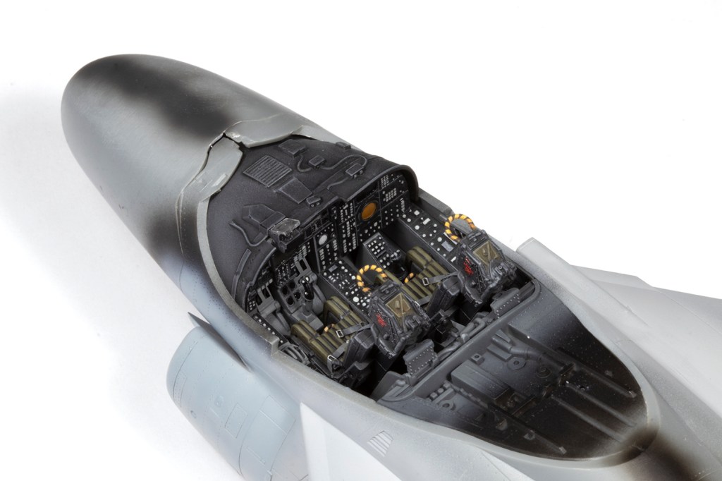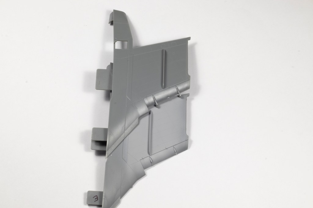 There are a lot of parts in the box, even after all the ordnance was immediately consigned to the spares bin. Hobby Boss have moulded every control surface separately and deployable, including the wingtip airbrakes, as well as folding wings and a nose that can be opened to display a complete radar. The moulding quality is generally good (slightly better than the earlier A boxing, in fact), but does have some weak areas: inconsistent surface smoothness and scratches on some sections of the fuselage halves, some mould slip which is a pain to clean away, very rough intake splitter plates and a bit of flash and surprisingly chunky sprue gates.