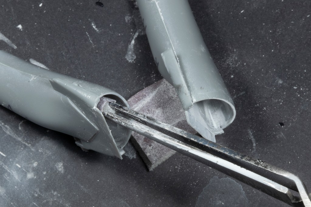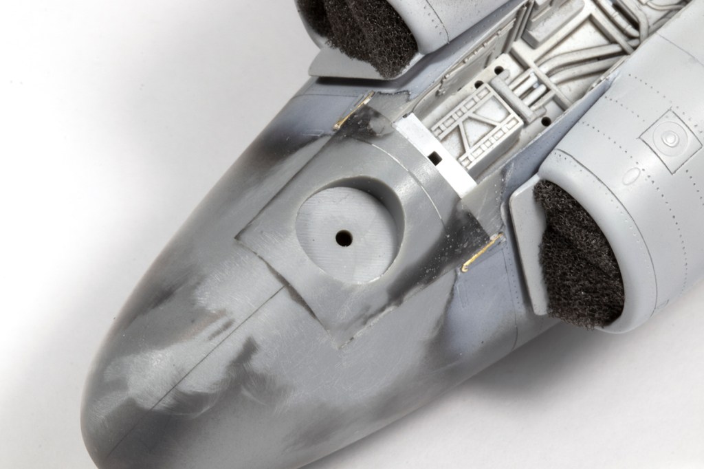 The intakes also need to be added before the fuselage halves are closed, and I’m a sucker for making these seamless. This is a lengthy and iterative process requiring CA and filler powder to first eliminate the ejector pin marks, followed by assembling the intakes and using more CA and filler powder to fill the gaps. Inevitably, after sanding, the first application is revealed to be inadequate, and a second round required. Then it all needs to be painted white, which is difficult down the length of a long tube. In this instance I used Mr Basic White 1000 sprayed very generously so it could be sanded down later with fine grit Infini sanding sponge to get a smooth inner surface.