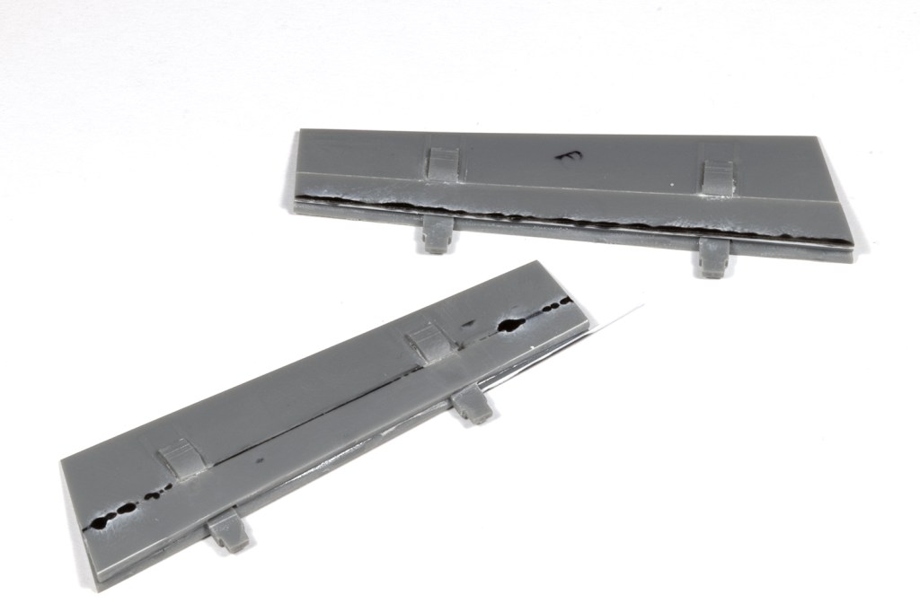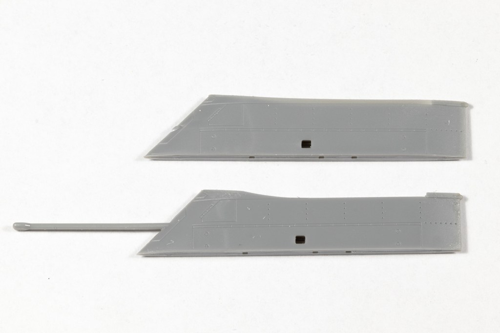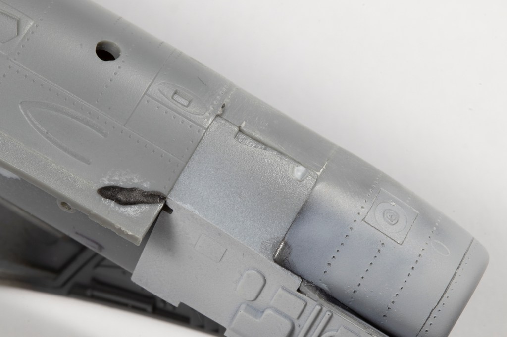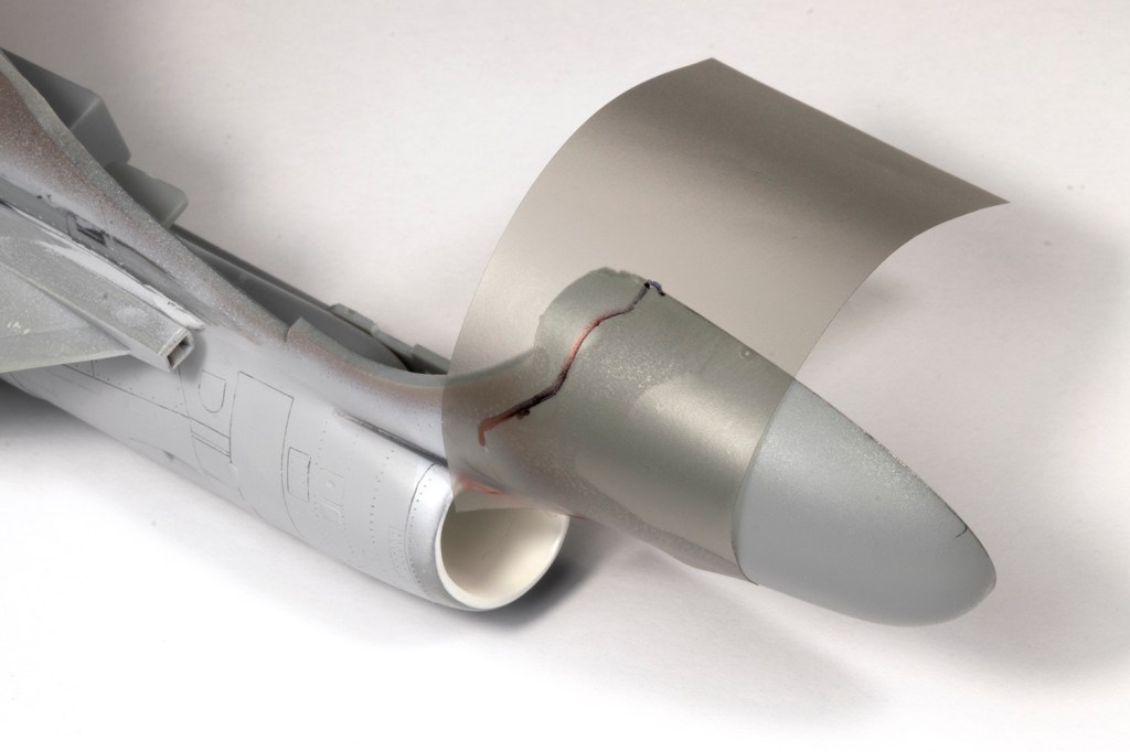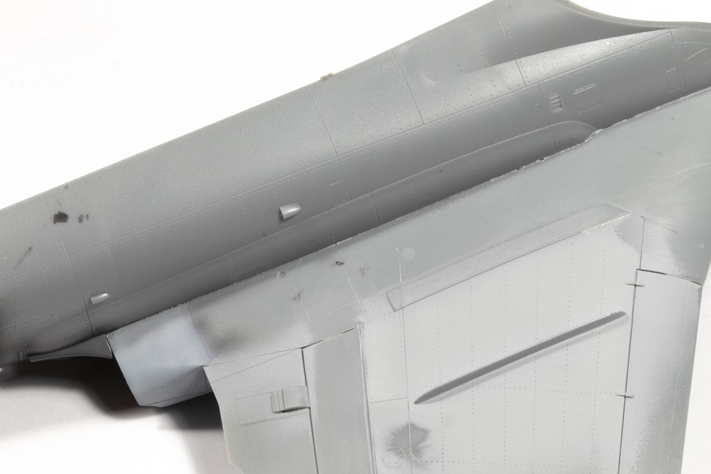 The first step was to use a black CA and filler powder mix to fill some surface details not applicable to this model: the vent exhaust hole and surrounding panel lines behind the airbrake on the right side. ECM parts for the trailing edges of the wings (L17/18) were not required for this airframe, and similarly the DECM ALQ-100 booms can be cut away from the inner pylon leading edges and the gaps filled. The biggest change, however, were the wing fences.