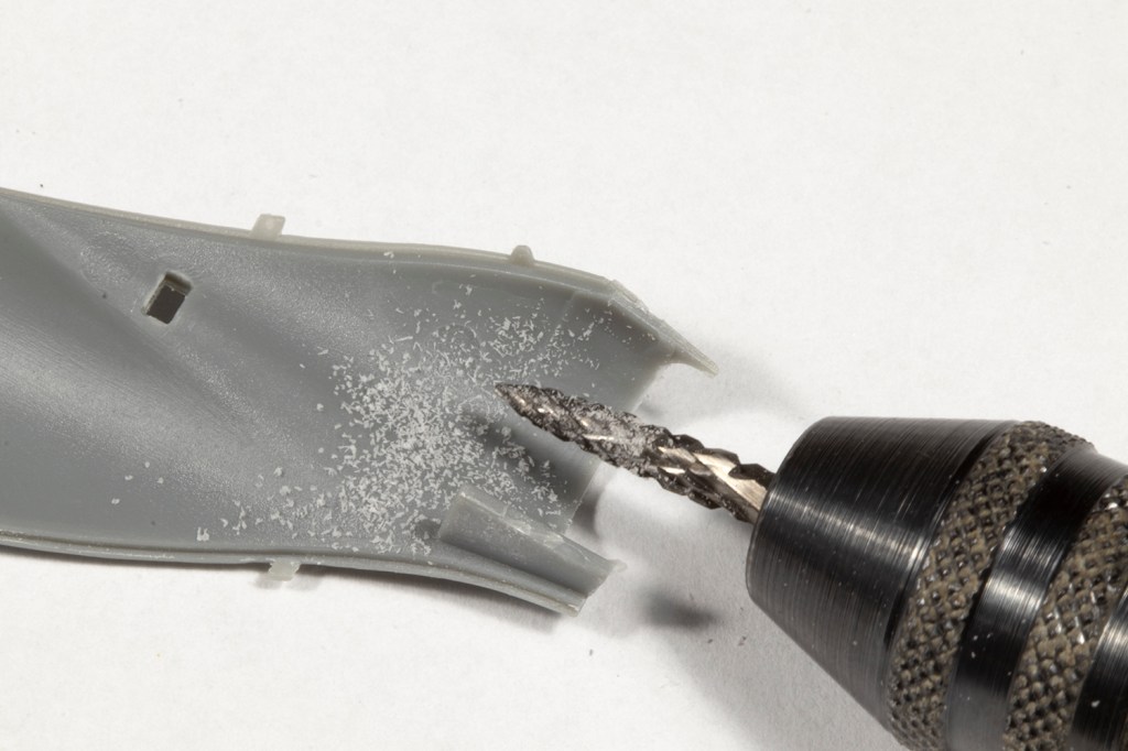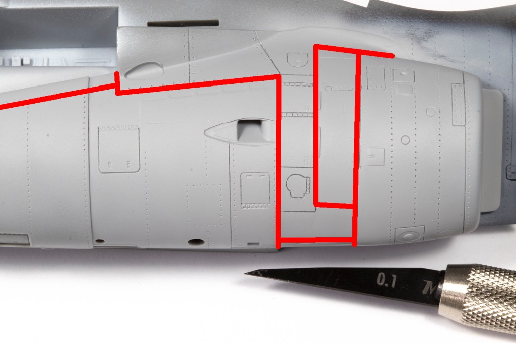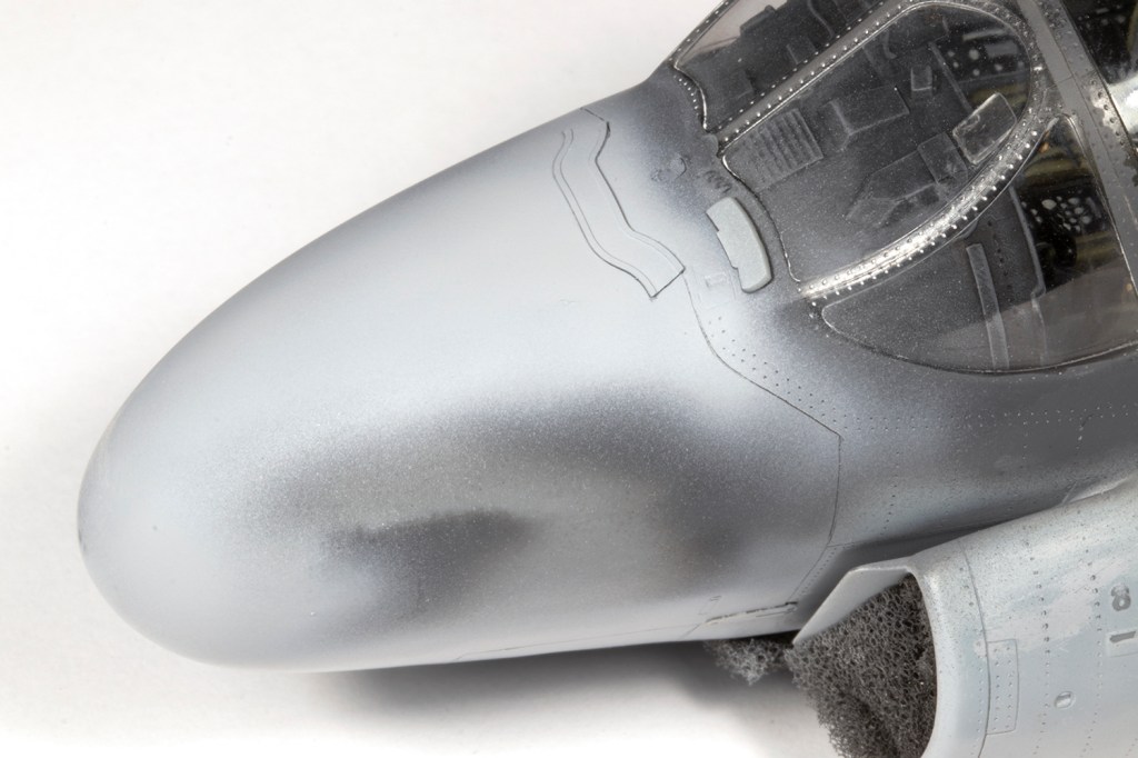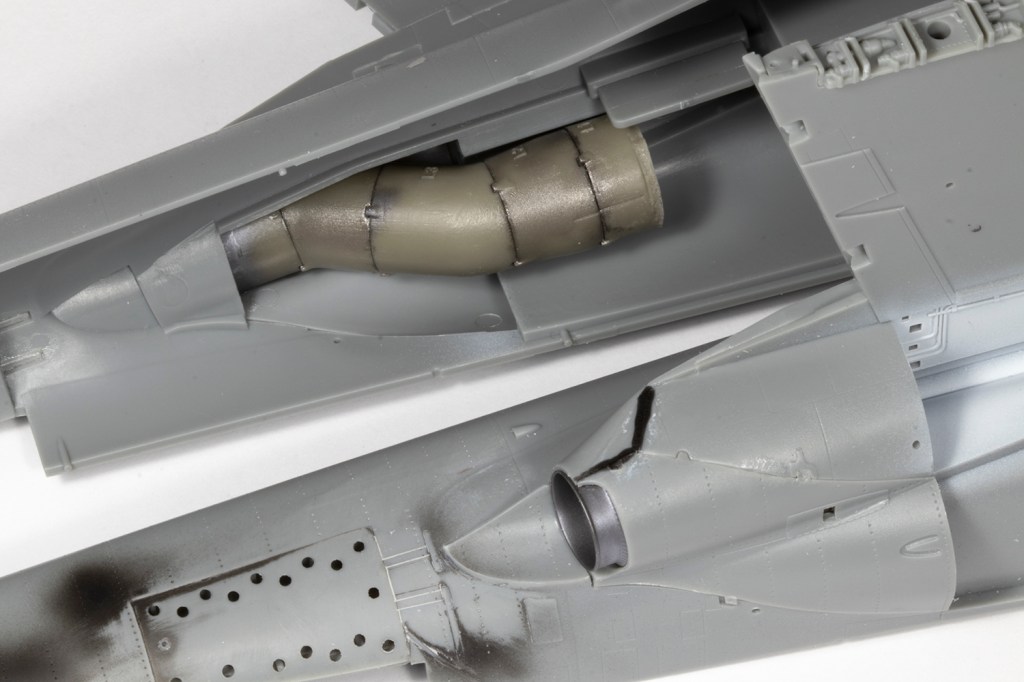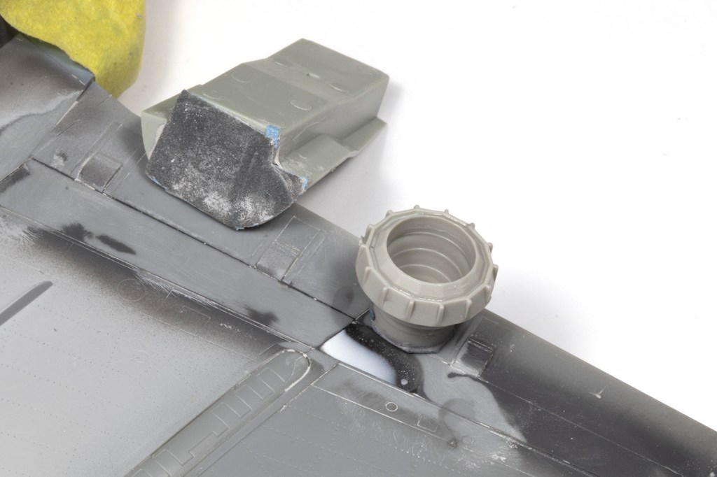 The first step was to use a black CA and filler powder mix to fill some surface details not applicable to this model: the vent exhaust hole and surrounding panel lines behind the airbrake on the right side. ECM parts for the trailing edges of the wings (L17/18) were not required for this airframe, and similarly the DECM ALQ-100 booms can be cut away from the inner pylon leading edges and the gaps filled. The biggest change, however, were the wing fences.