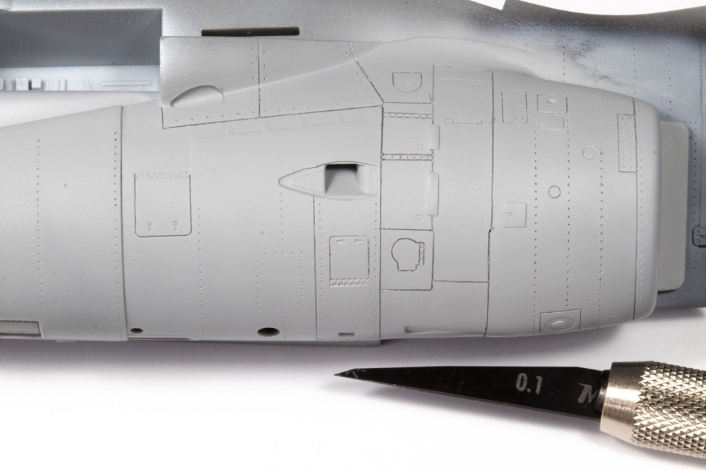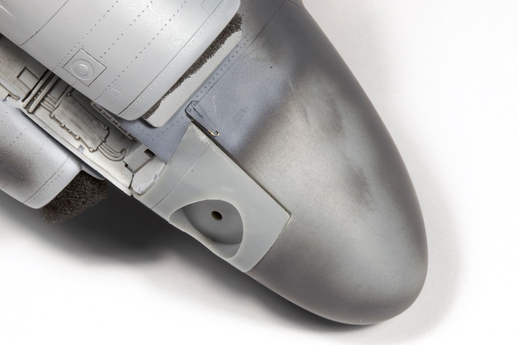 Some more comments on accuracy. Hobby Boss mould locations for lights under the main intakes, but don’t provide actual parts. These were sourced from the spares box as was a replacement for the red light on the nose ahead of the pilot (a red clear resin part from a Quickboost set for the Supermarine Walrus). For this airframe, the plinth on the nose gear door had to be removed. I think the blast plates behind the exhaust are not a very good shape (in my opinion they should be much more triangular) but this was a modification too far, and what you see is what the kit gives. Hypersonic draw your attention to some inaccurate panel lines ahead of the exhausts, and I did replace these angular lines with a nice curved panel line as instructed.