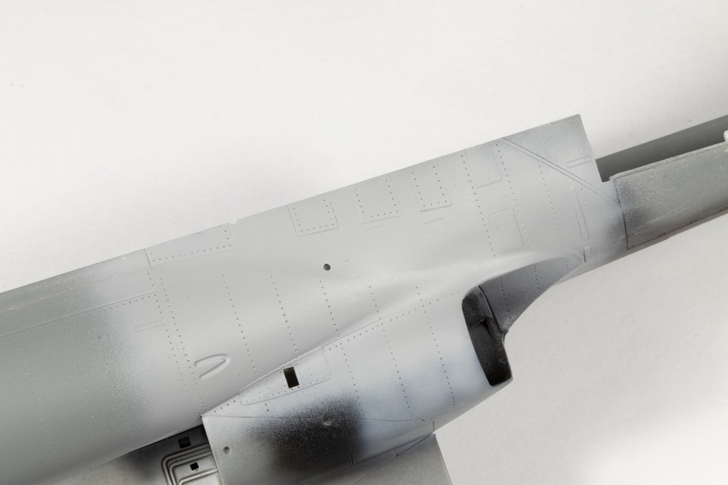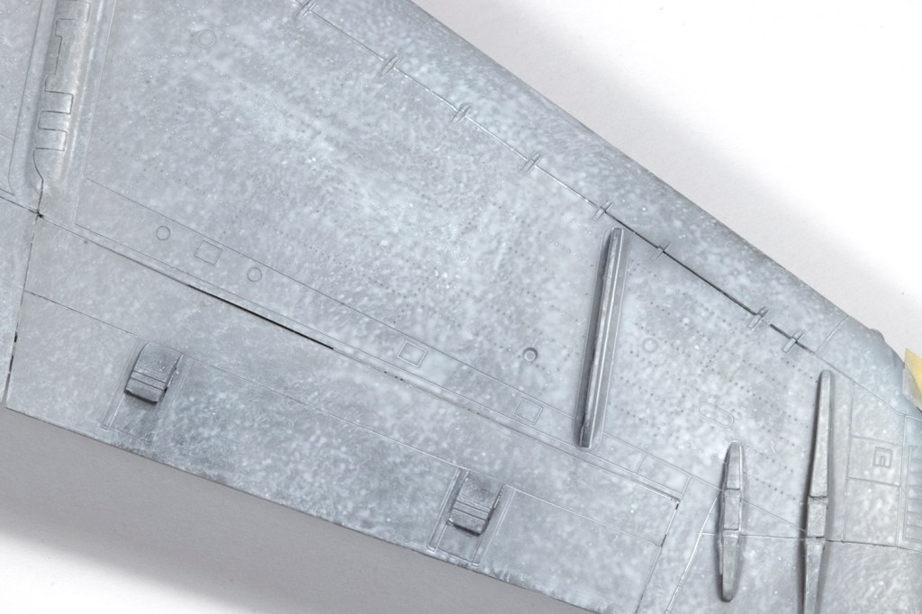 Now, over this you are supposed to moisten the surface again with X-20A and brush on a coat of dark grey Liquitex ink, which is then gently removed with cotton buds dipped in 50-70% isopropyl alcohol. I tried this and it did not work at all. The alcohol lifted the underlying paint and the dark ink was extremely difficult to remove. I tried a variety of different matt coats and differing strengths of alcohol, but still the same result. Fortunately I had not covered the entire model in this stuff, and the sides and upper surfaces were still grey, so rather than using a dark grey ink, I switched to a layer of moderately thinned dark grey oil paint. This worked wonders and gave me a finish I was very excited about. It doesn’t look great up close, but from a normal viewing distance I had exactly the kind of grotty texture I was looking for. I enhanced this by spraying small areas of the airframe with spots of different grey paints to represent touch-ups common to this kind of scheme.