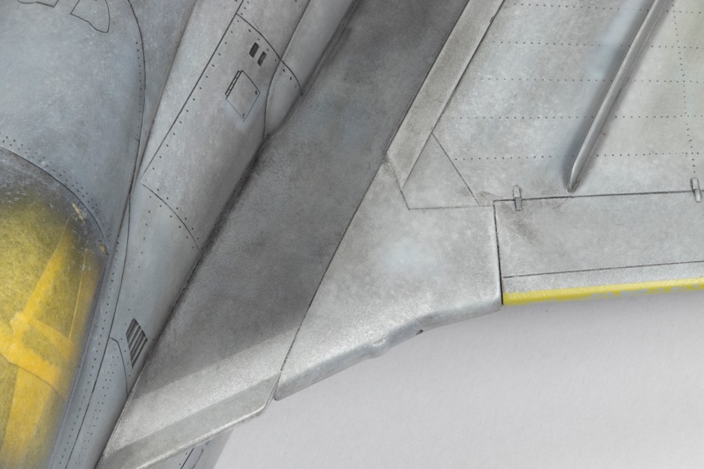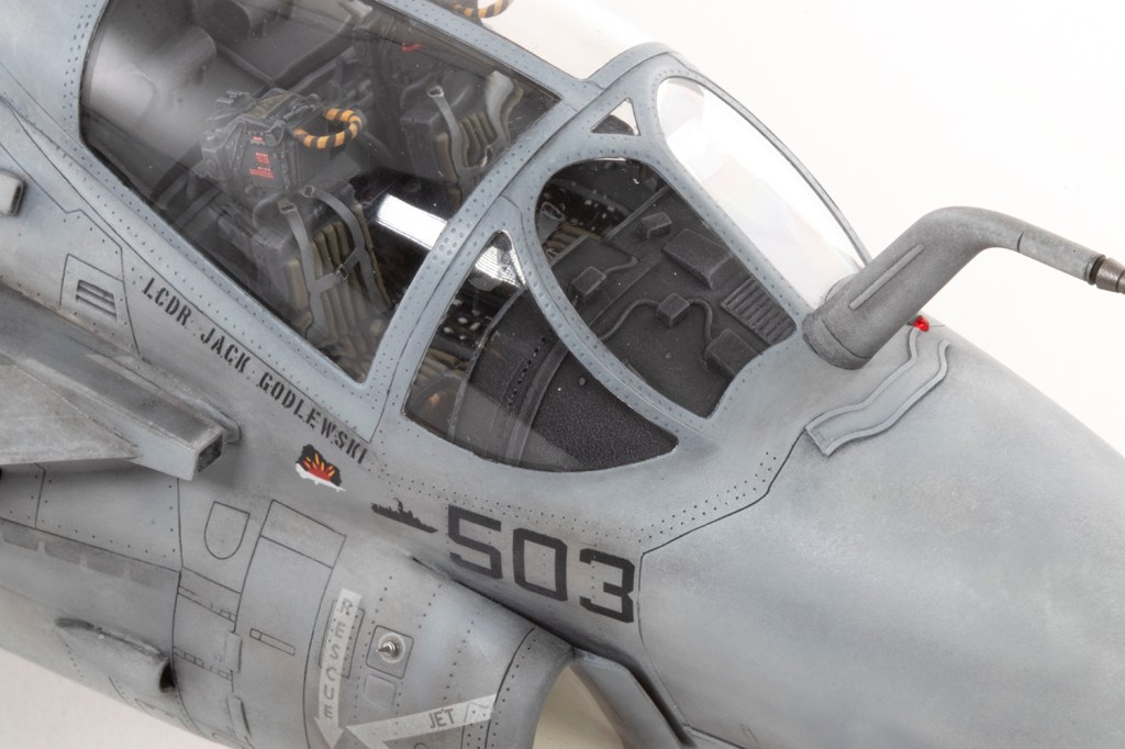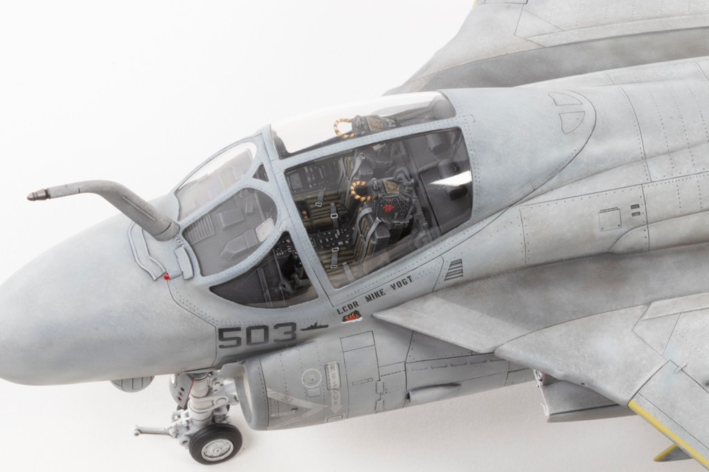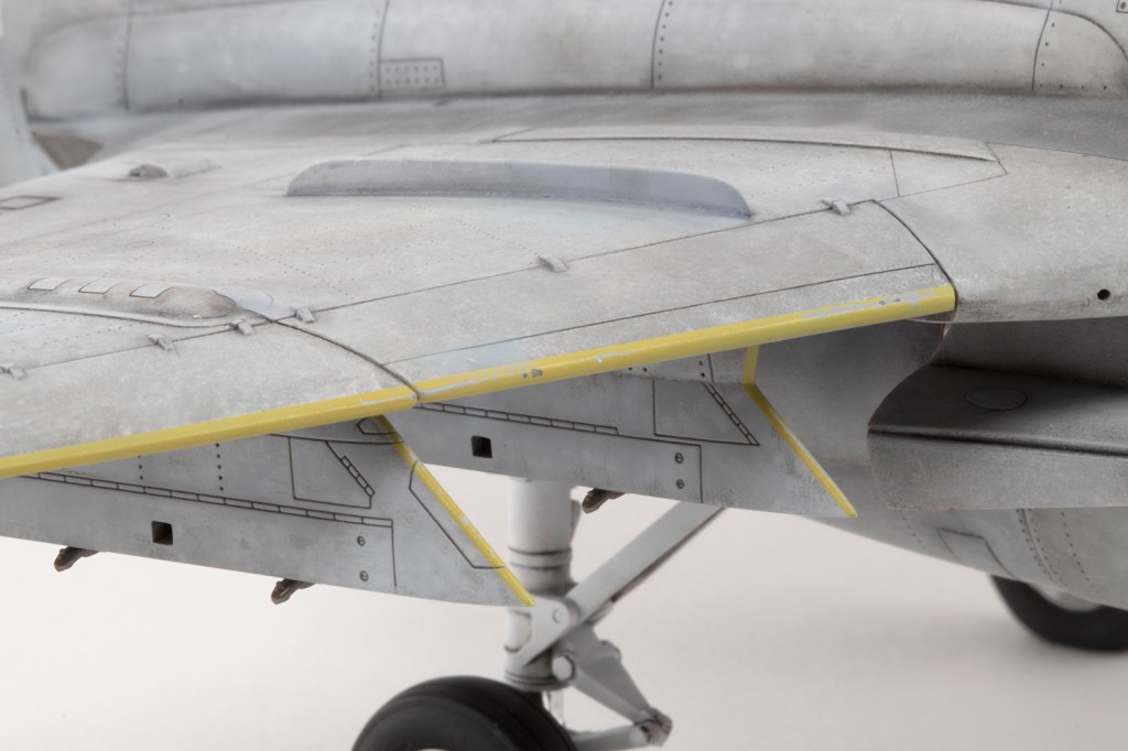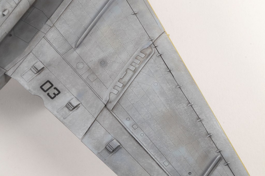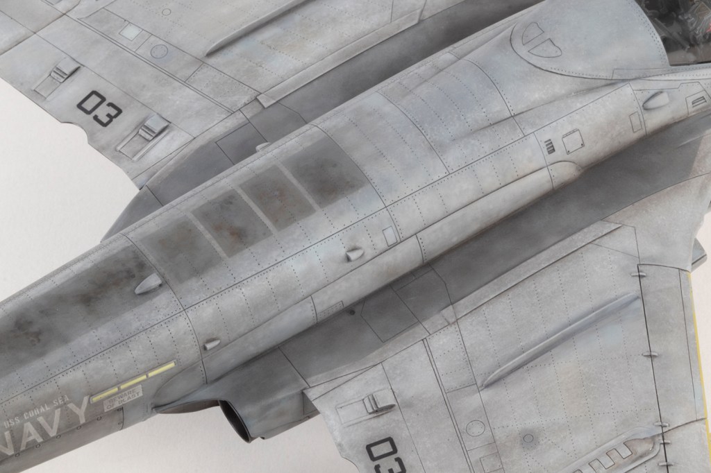 For nostalgic reasons (harking back to a Hasegawa 1/72 A-6E I made in the late 1980s), it was important to me that I model a scheme with the ochre yellow tape applied on the leading edges, in this case painted with Mr Hobby H34. This seemed to weather away pretty quicky, so I used some hairspray as an undercoat so I could chip it back. It’s a bit paler than I would like, but adds some interest to the very grey scheme. Walkways were all airbrushed on with dark shades of grey and weathered with oils, AK weathering pencils and Gunze Real Touch Markers.