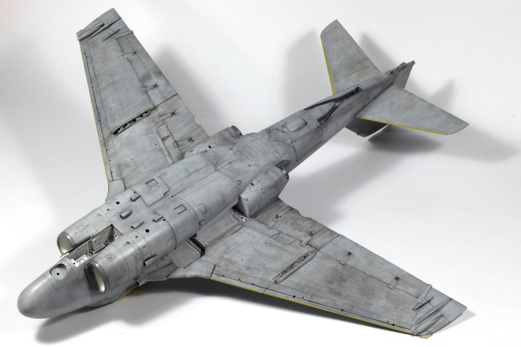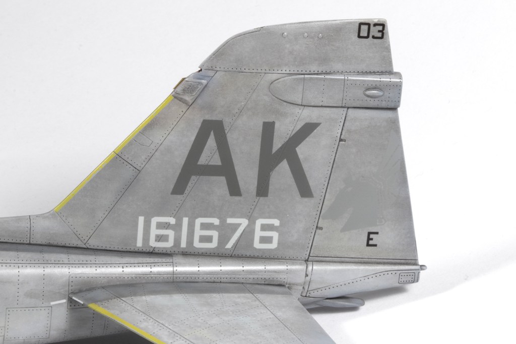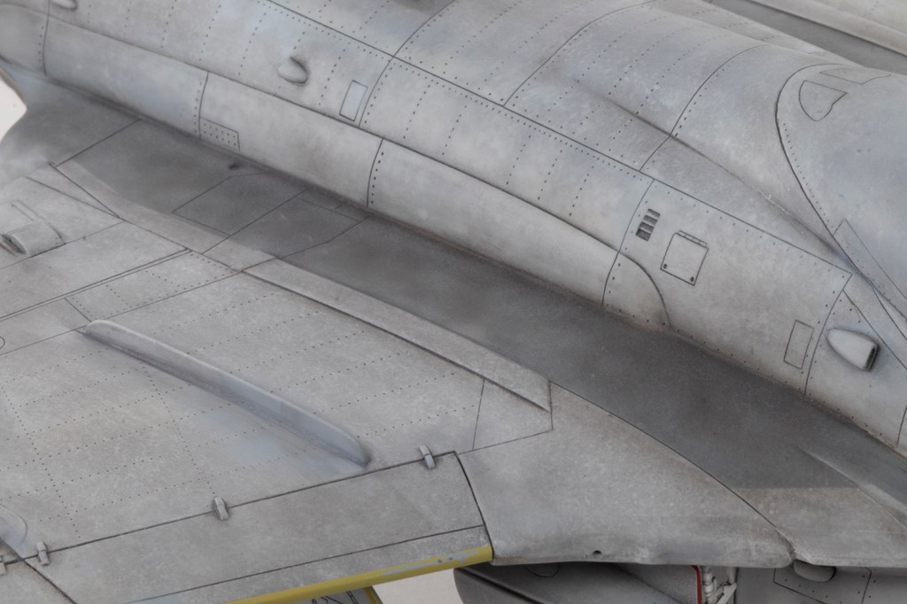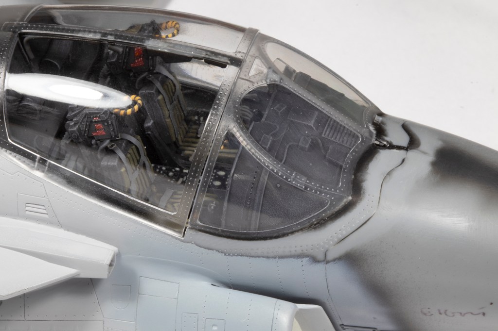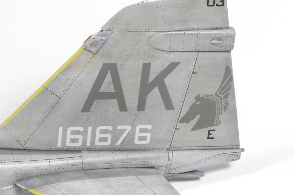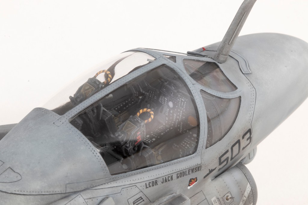 For nostalgic reasons (harking back to a Hasegawa 1/72 A-6E I made in the late 1980s), it was important to me that I model a scheme with the ochre yellow tape applied on the leading edges, in this case painted with Mr Hobby H34. This seemed to weather away pretty quicky, so I used some hairspray as an undercoat so I could chip it back. It’s a bit paler than I would like, but adds some interest to the very grey scheme. Walkways were all airbrushed on with dark shades of grey and weathered with oils, AK weathering pencils and Gunze Real Touch Markers.