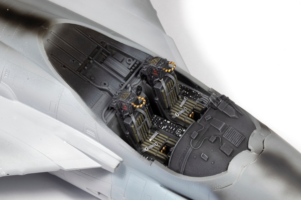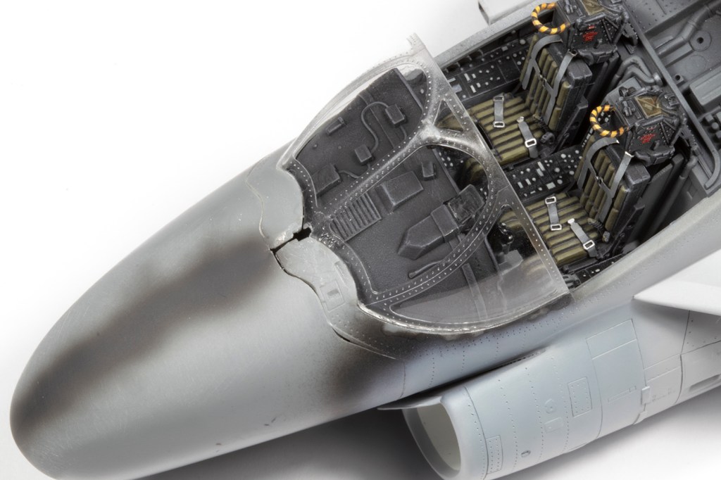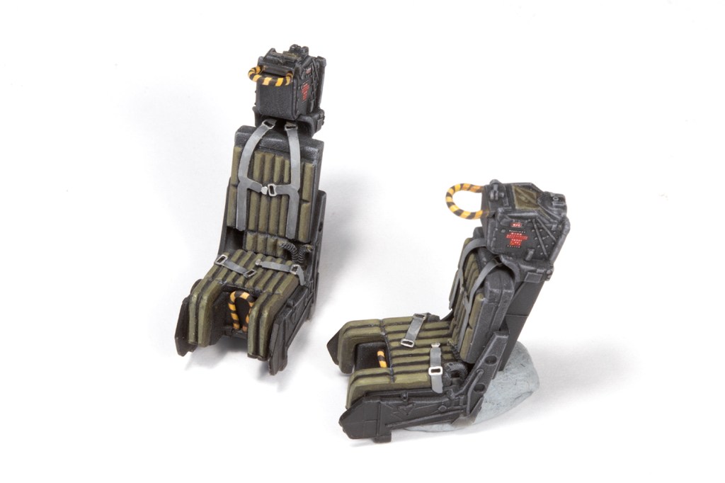 I like to dry brush the black areas with oil paints, mixed to increasingly lighter shades of grey from black and white. After each application I airbrush a coat of MRP Flat Clear to lock the oils in place before dry brushing the next layer. I accept this isn’t terribly realistic, but I think it looks cool. With the ejection handles on the seats I tried masking the black stripes with 0.4mm strips of Tamiya tape. This works okay, but 0.4mm is still too wide and next time I’ll try using finer strips.