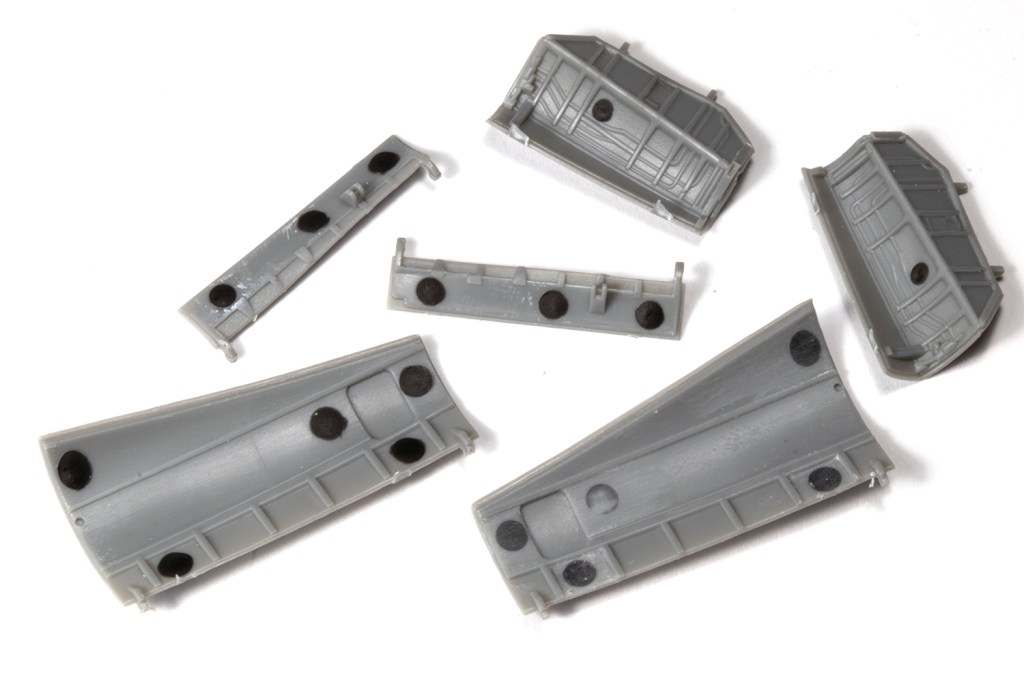Even without this work, the wings will absorb a lot of your time. With everything closed up, I counted 24 parts per wing, plus the optional sensor housings. That’s a lot of parts! If you want an easy life, I recommend modelling the flaps and slats all open and the wings folded. My sense of aesthetics drove me to want all the control surfaces neutral, and that made for a hard life. None of them fit particularly well and it takes a lot of fettling of various hinges, strips of plastic card added here and there, and many applications of superglue filler before the wings even started to look acceptable to my eyes.