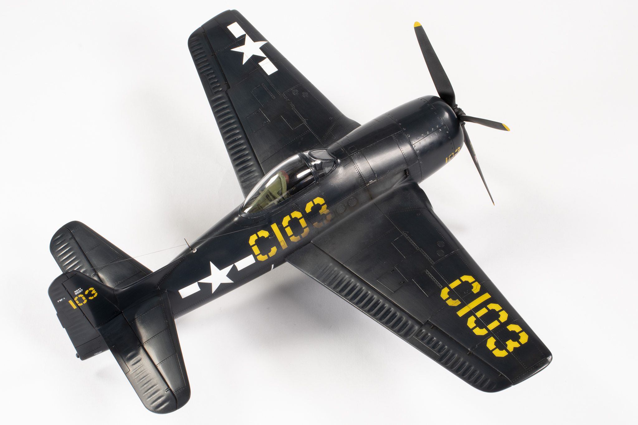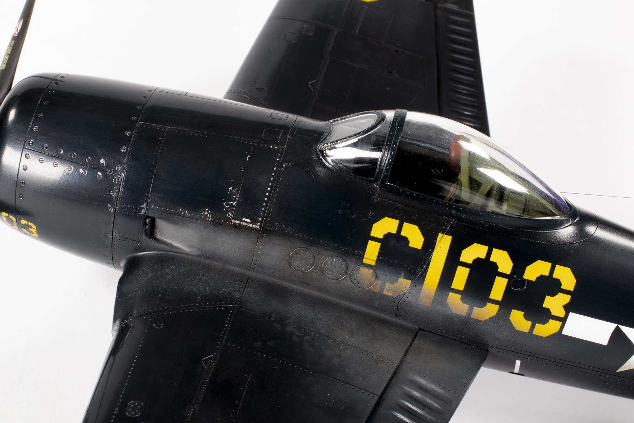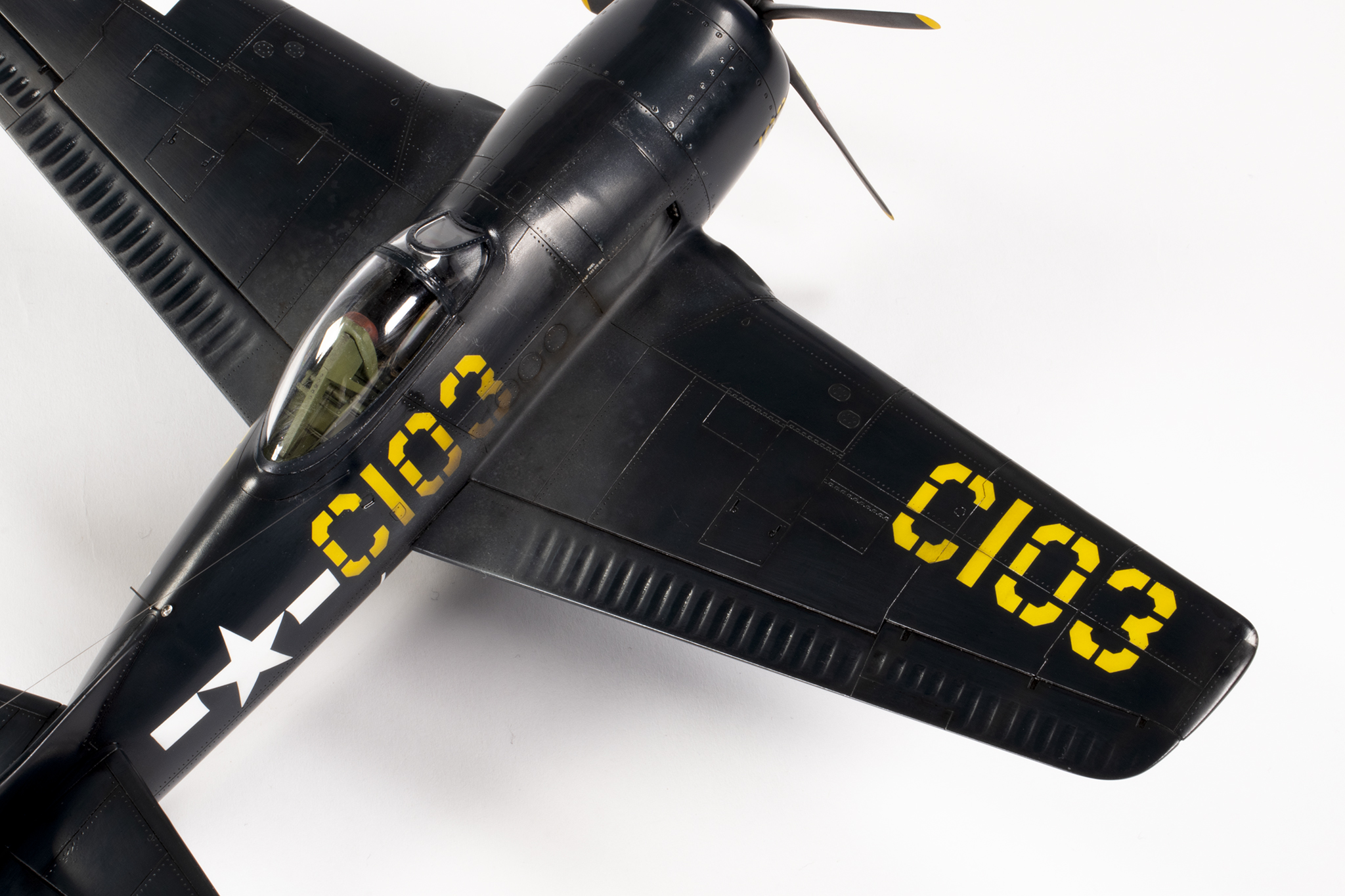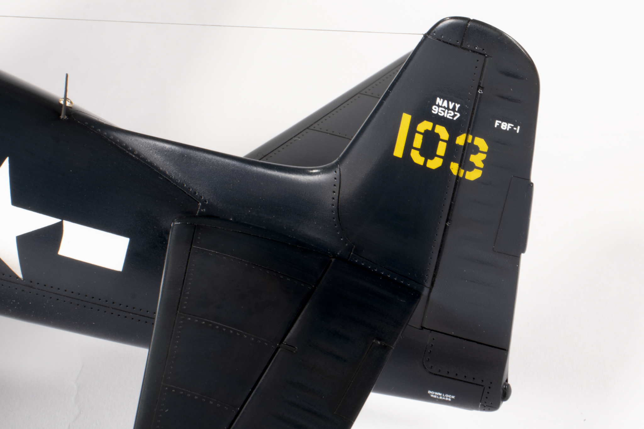 The masks worked pretty well and did not require any touch ups. I doctored the Superscale tail decals to read ‘F8F-1’ and applied those, along with a couple of stencils from the HobbyBoss sheet that seemed to be present on C103. After the markings were done, there were a total of ten very small decals on the model, plus the prop markings from the HB sheet (which were unfortunately out of register). Only four decals were actually used from the Superscale sheet…