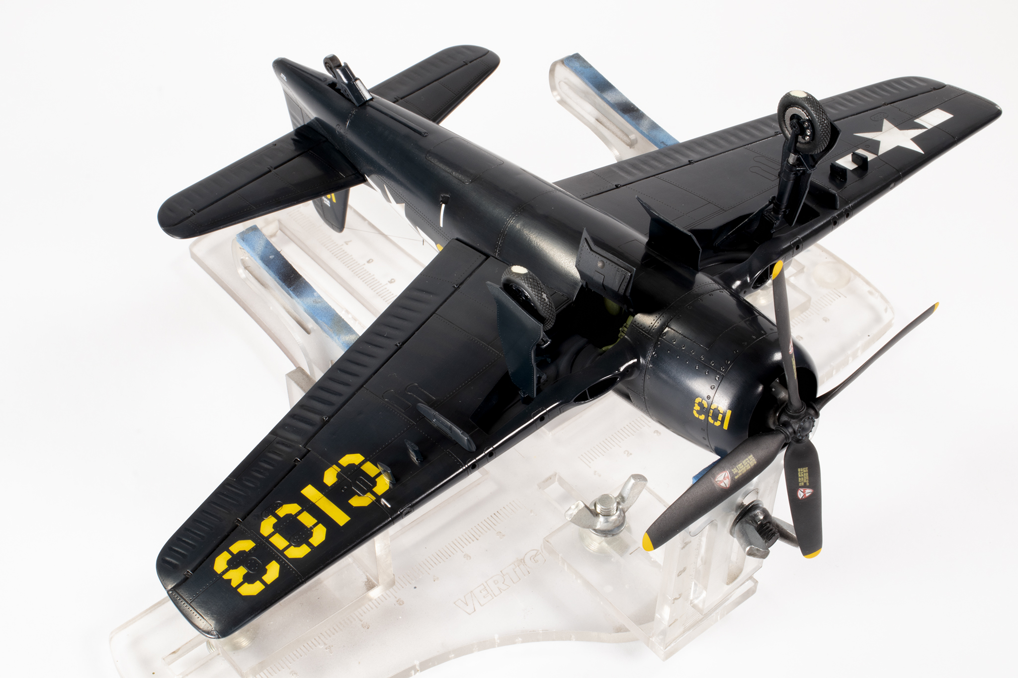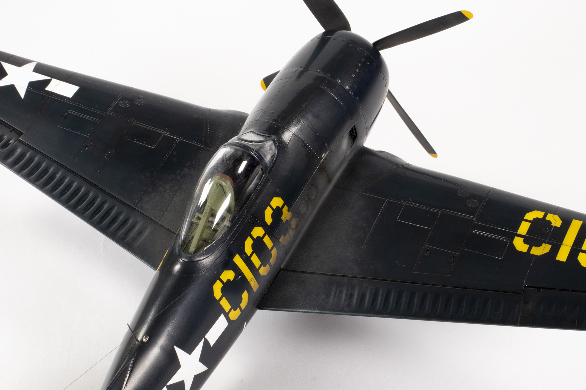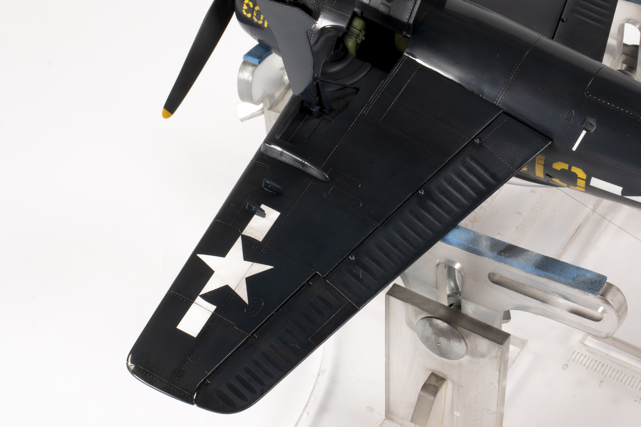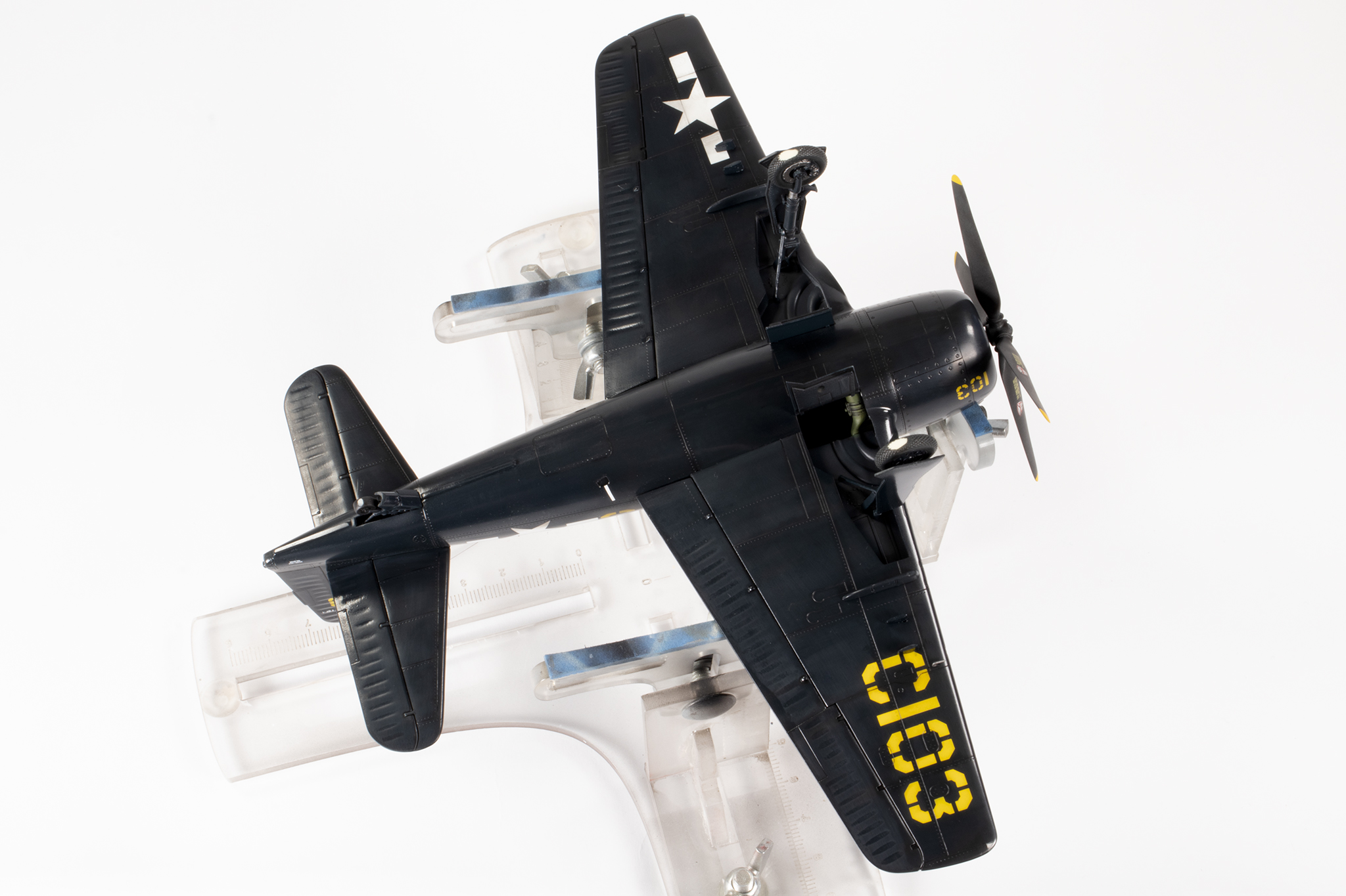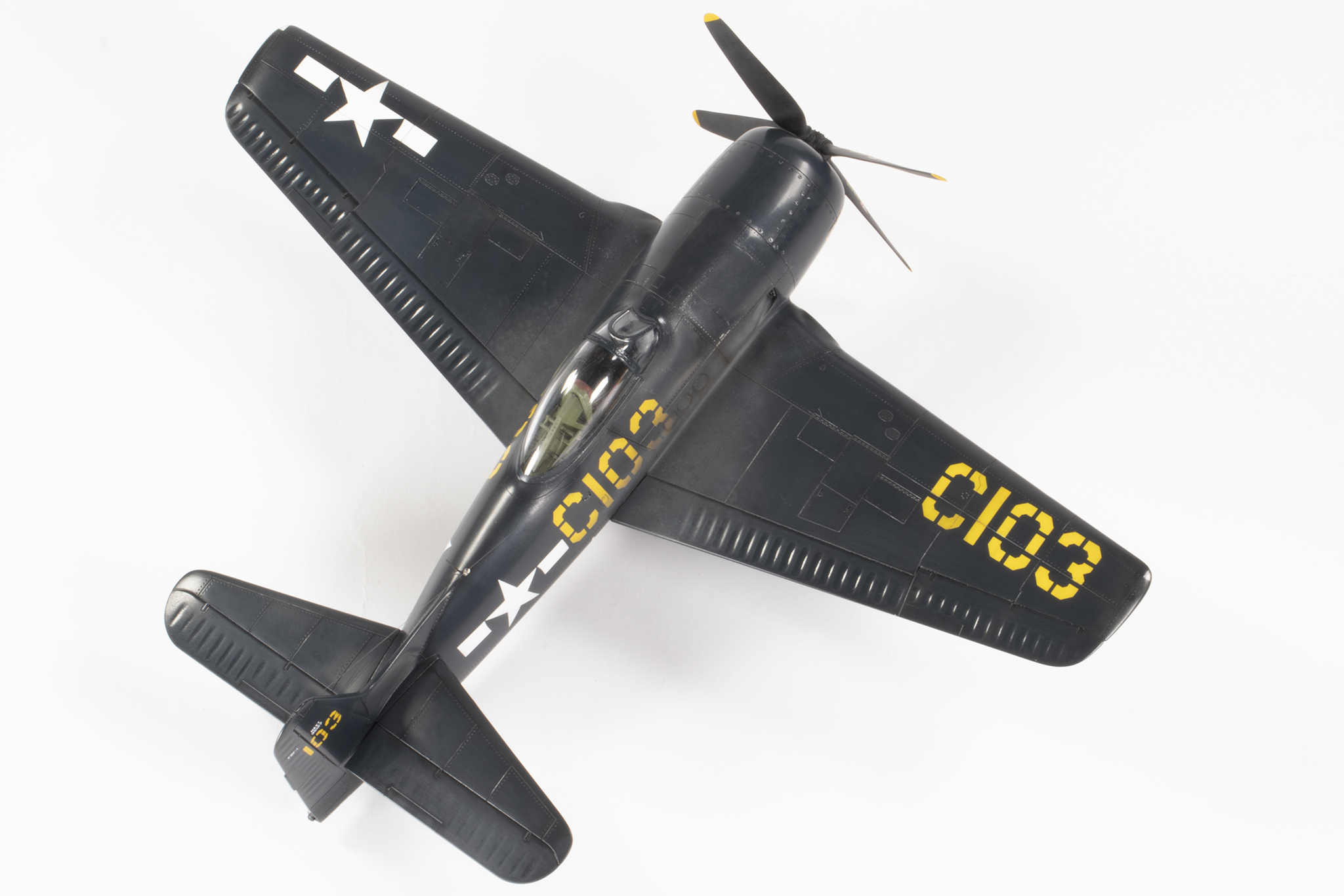 The masks worked pretty well and did not require any touch ups. I doctored the Superscale tail decals to read ‘F8F-1’ and applied those, along with a couple of stencils from the HobbyBoss sheet that seemed to be present on C103. After the markings were done, there were a total of ten very small decals on the model, plus the prop markings from the HB sheet (which were unfortunately out of register). Only four decals were actually used from the Superscale sheet…