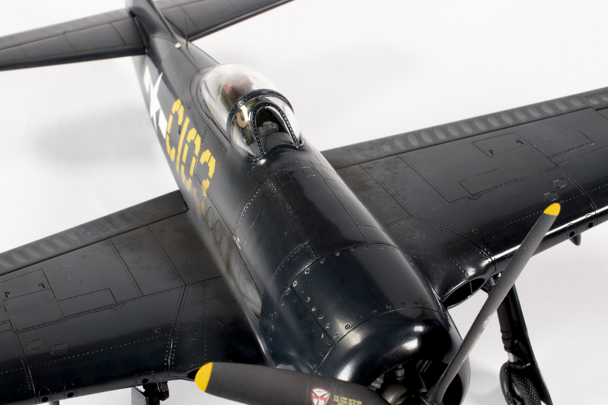 My thoughts now turned to the final finish. The real thing was clearly very glossy, going from the reflections visible on the upper wing. This needed to be combined with some heavy exhaust staining, which seemed to characterise most Bearcats, even those flown by the Blue Angels. My plan of attack was to apply some heavy wet coats of Mr Color GX100 Clear Gloss. This obliterated all of my lovely tonal variation in the paint work. After a day or so to dry, I rubbed the airframe down with Infini 2500 grit elastic sanding film and sponge to flatten out the gloss coat, followed by a good polish with 4000 grit sanding sponges. I like this finish as it’s very smooth and quite glossy, but in a subdued manner, not like a car finish.