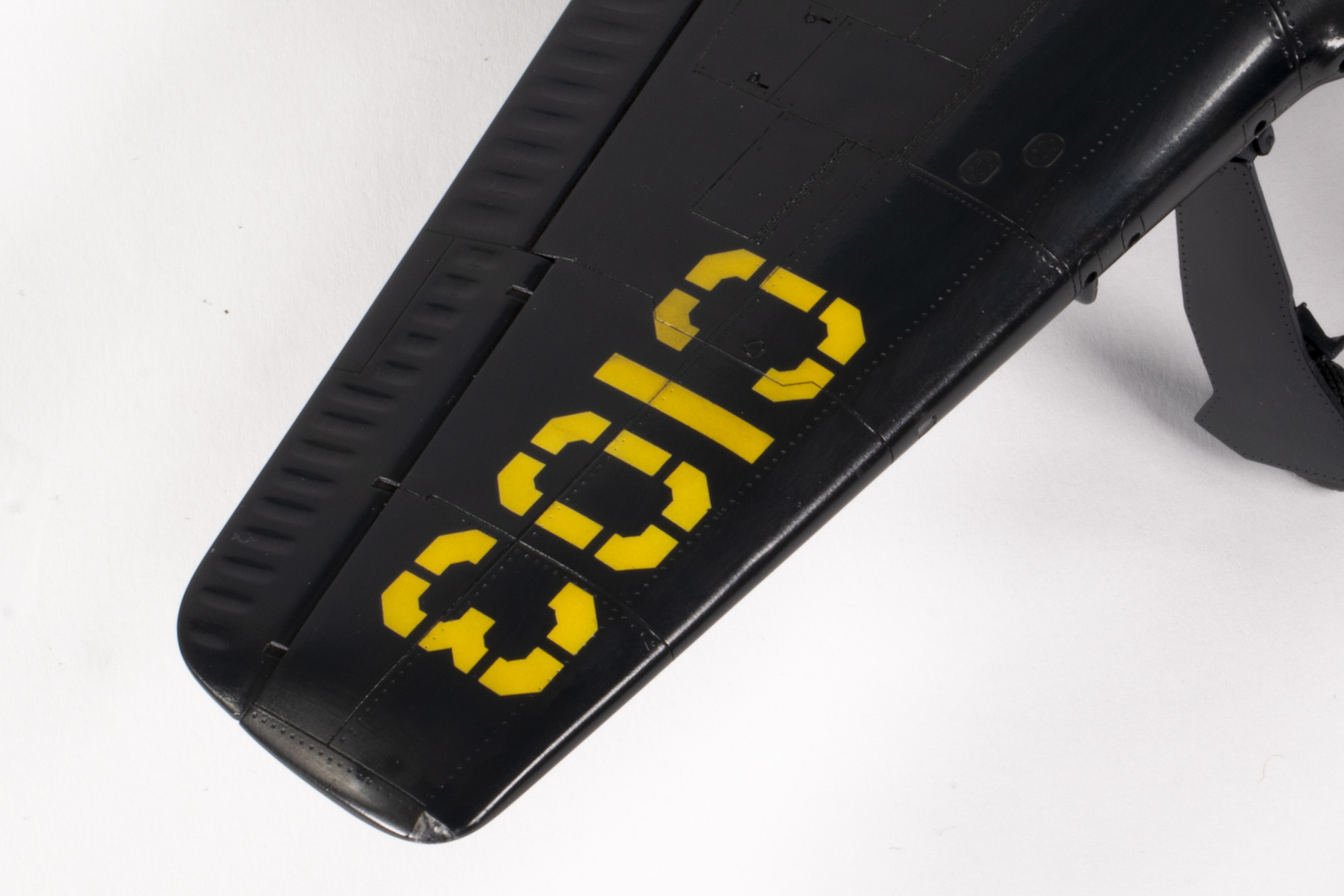 Neither do I think C103 belonged to VF-17. I’m on less certain ground here, but the excellent Ginter book on the Bearcat shows no VF-17 F8Fs that are marked up remotely like this airframe, nor any other fleet squadrons. What the Ginter book does have, however, are a couple of photos of airframes C99, 100, C101 and C57, all very similar to C103 and also from late 1945 and 1946. (Although these codes are not segmented, they clearly were at one point). These all belonged to Carrier Air Service Unit 5, which makes far more sense of the non-fleet style markings they are carrying. I therefore concluded I was making an F8F-1 from CASU-5, not an F8F-1B from VF-17. Further errors in the decals will be highlighted later on…