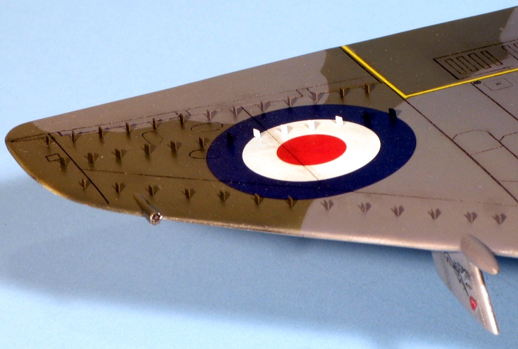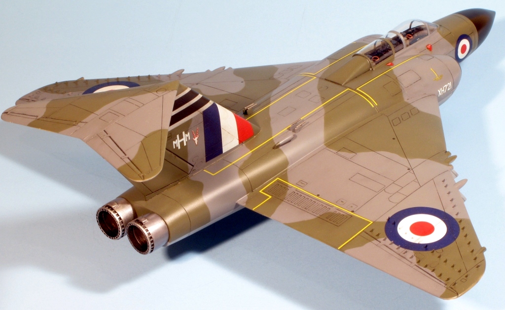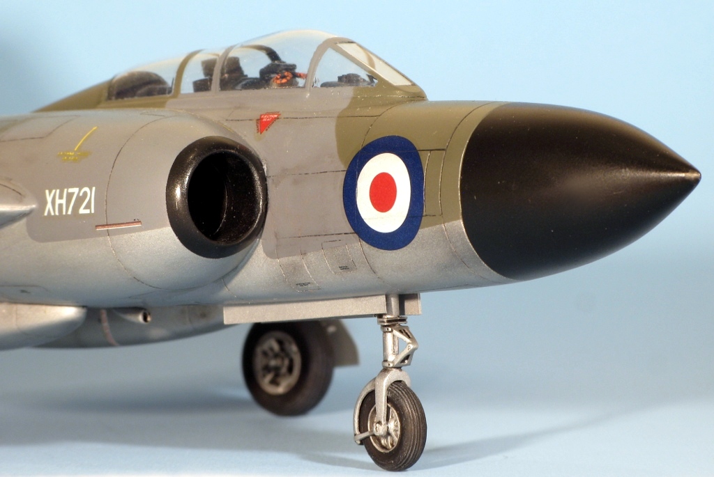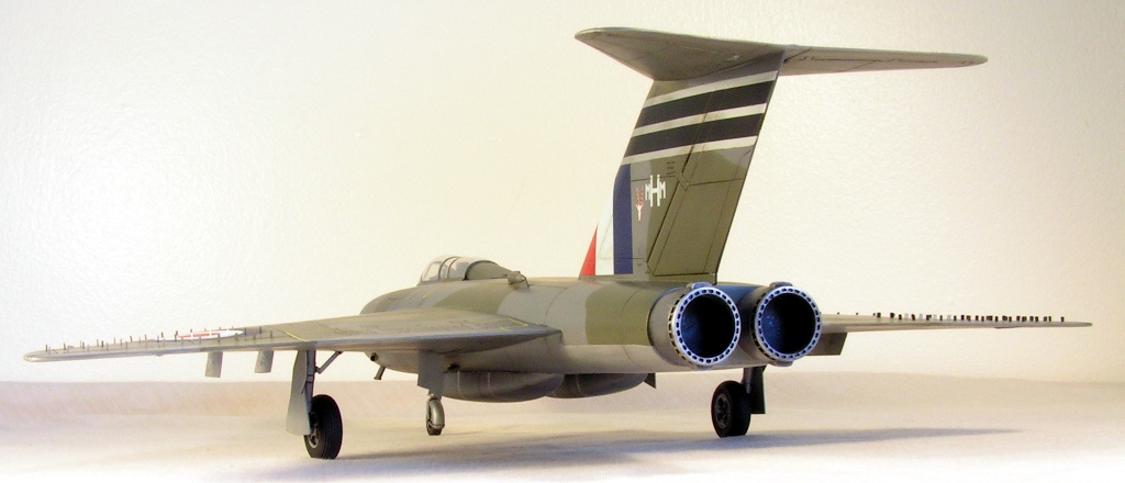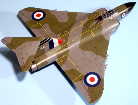 Painting followed: Humbrol was used exclusively with aluminium (56) used on the undersides and dark green (163) and dark grey (164) on the upper surfaces. The kit decals were applied over a coat of Johnson’s Klear and they responded beautifully to Microsol. The kit decals were thin and had very good opacity and a very complete selection of stencils is provided. The only problem is that the carrier film is quite visible. Fitting the fin flash was difficult and I got it wrong on the starboard side — if I were to do it again I’d cut it into two pieces. At least some aircraft from 60 Squadron had wonky tail markings, but not as much as mine! Once the decals were on, the wing photo-etch vortex generators (which had been pre-painted) were added and they look great! Application of the Pollyscale satin/flat coat revealed some minor silvering of the decals, and then the undercarriage was added (it’s massive — look at the size of those wheels!). I’ve not yet added the pitot tubes (they keep snapping off) and, when I’ve painted them, I’ll add some Airfix Firestreak missiles under the wings. This is a very well-designed kit that went together much more easily than I thought it would. It takes care and there are lots of gaps to fill, but nothing that doesn’t disappear with a small amount of work. The main problem is that the seats seem to be far too low in the cockpit — unfortunately I’ve no idea why.