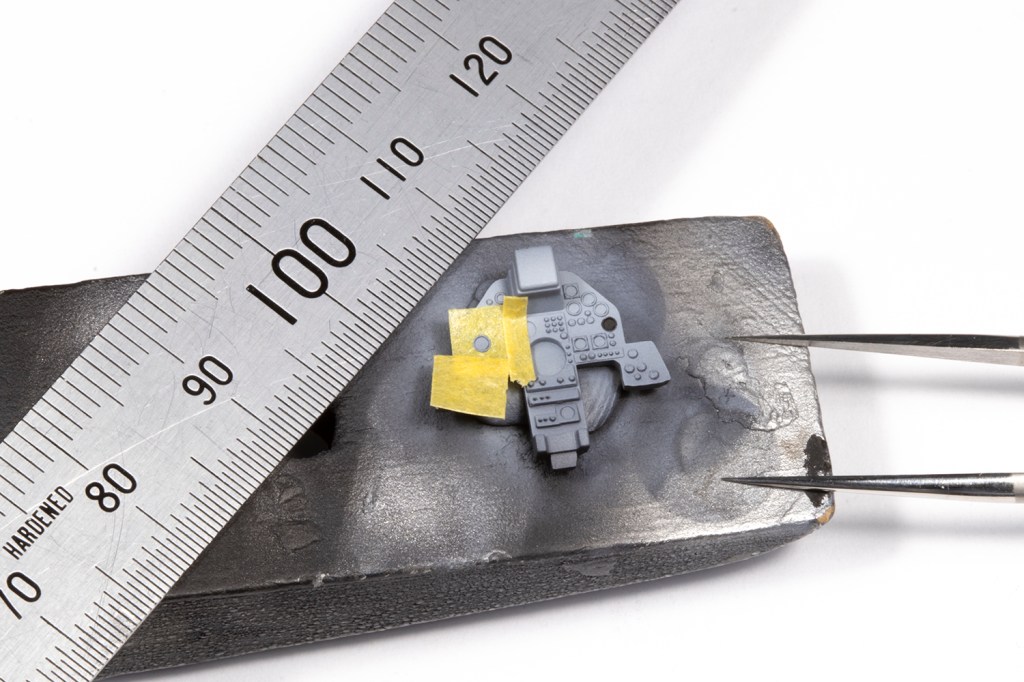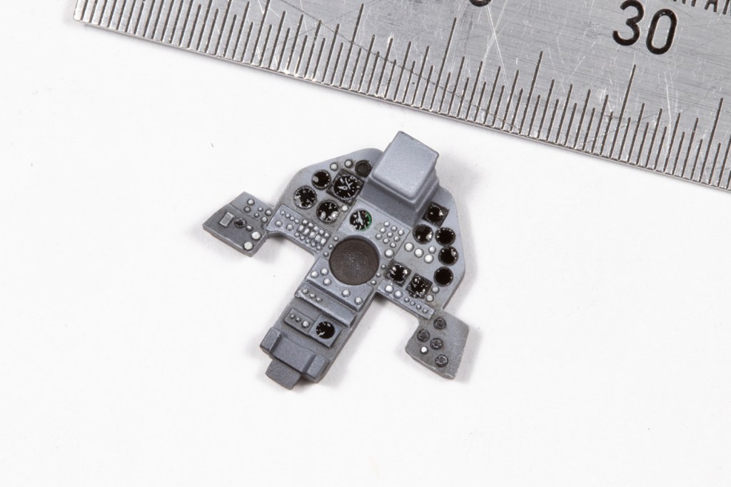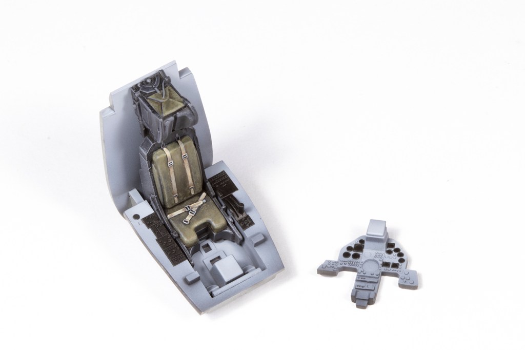 On to happier matters. The cockpit was perfectly fine for me from the box, including the seat which was adorned with PE straps from the kit. The tub is nicely detailed and I airbrushed it a generic mid-grey (in this case Mr Color 306) and masked the panels off so I could spray them black. I did the same with the instrument panel, but used some HIQ die cut circle masks to allow the dials to be individually airbrushed. I really enjoy painting all the raised detail in a light grey colour and used some generic Airscale decals for spurious instrument gauges.