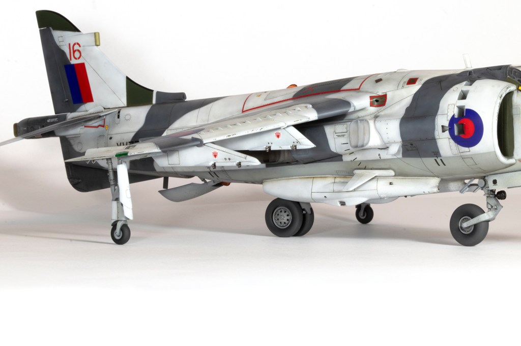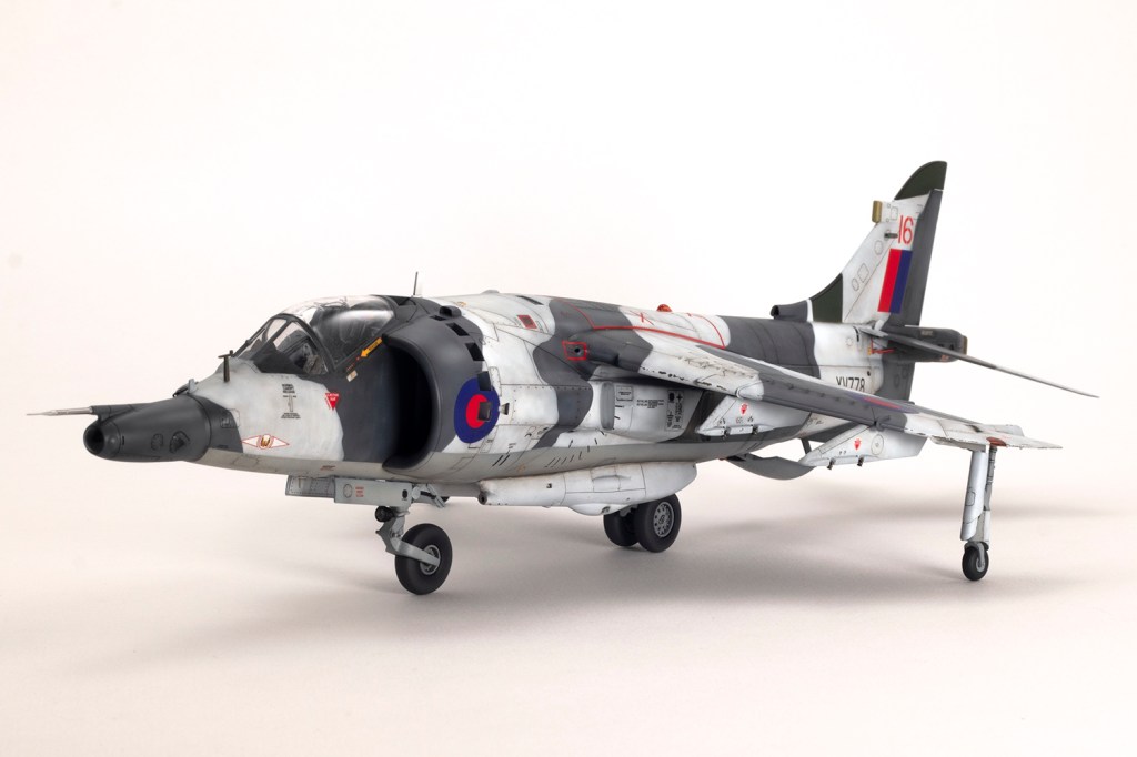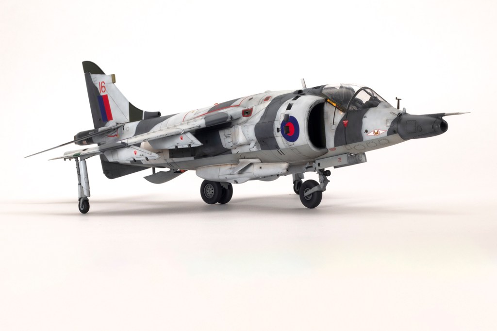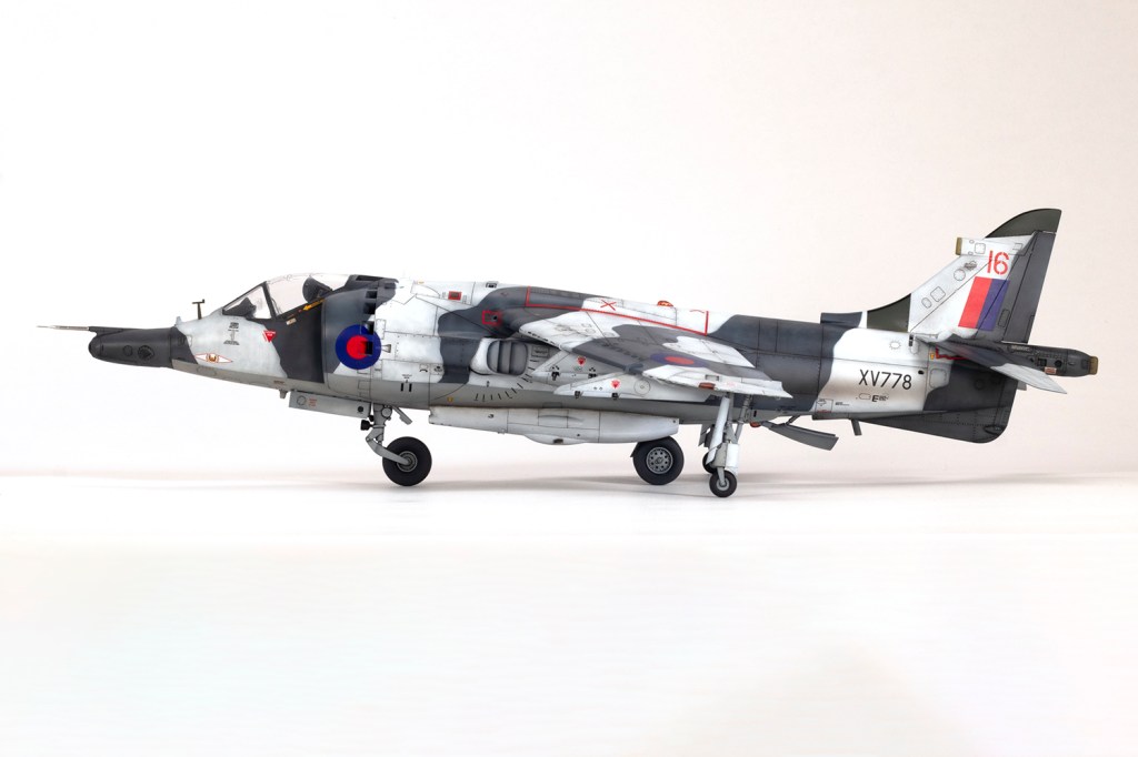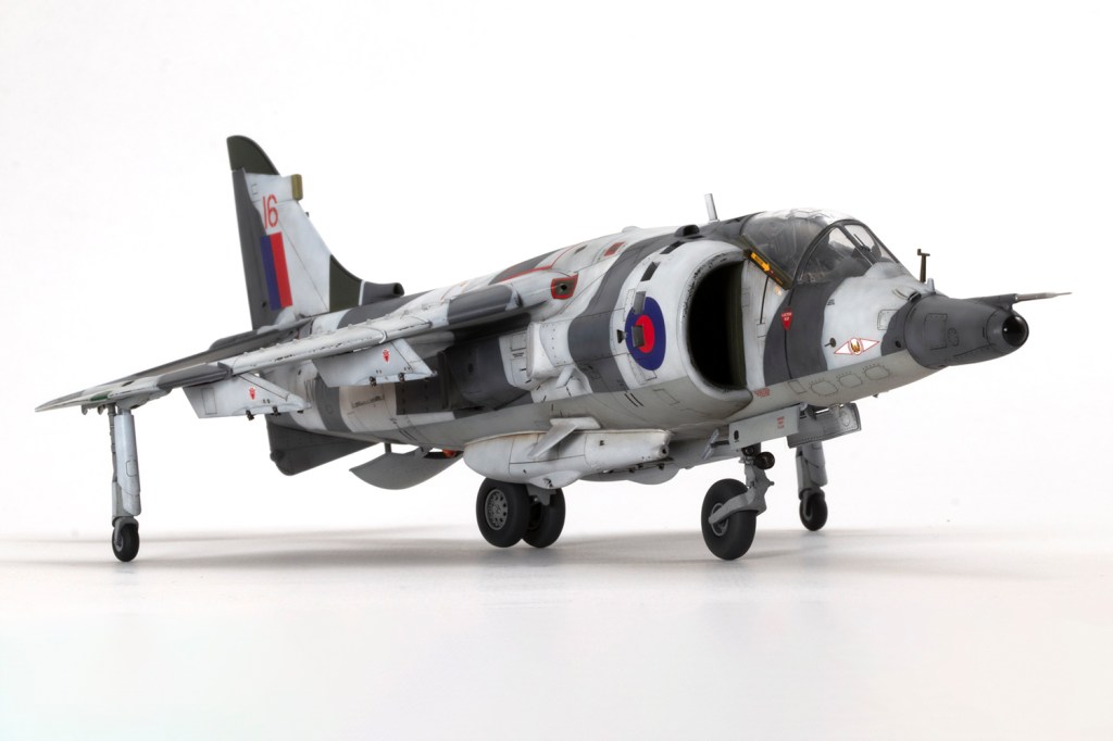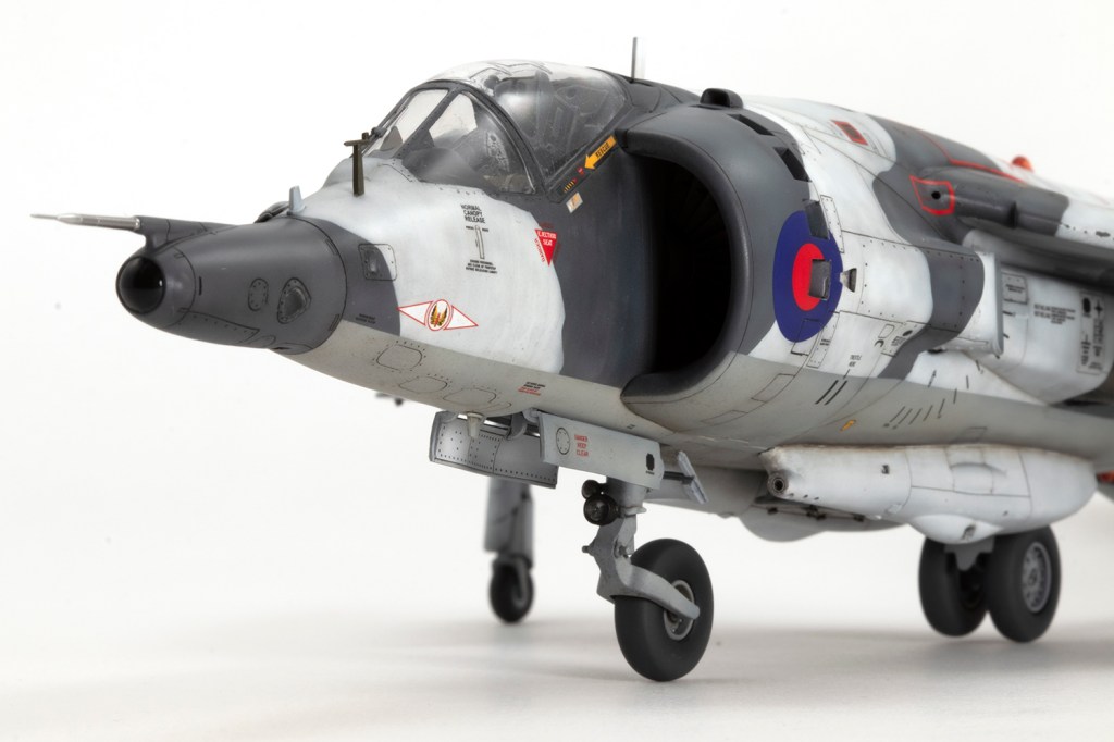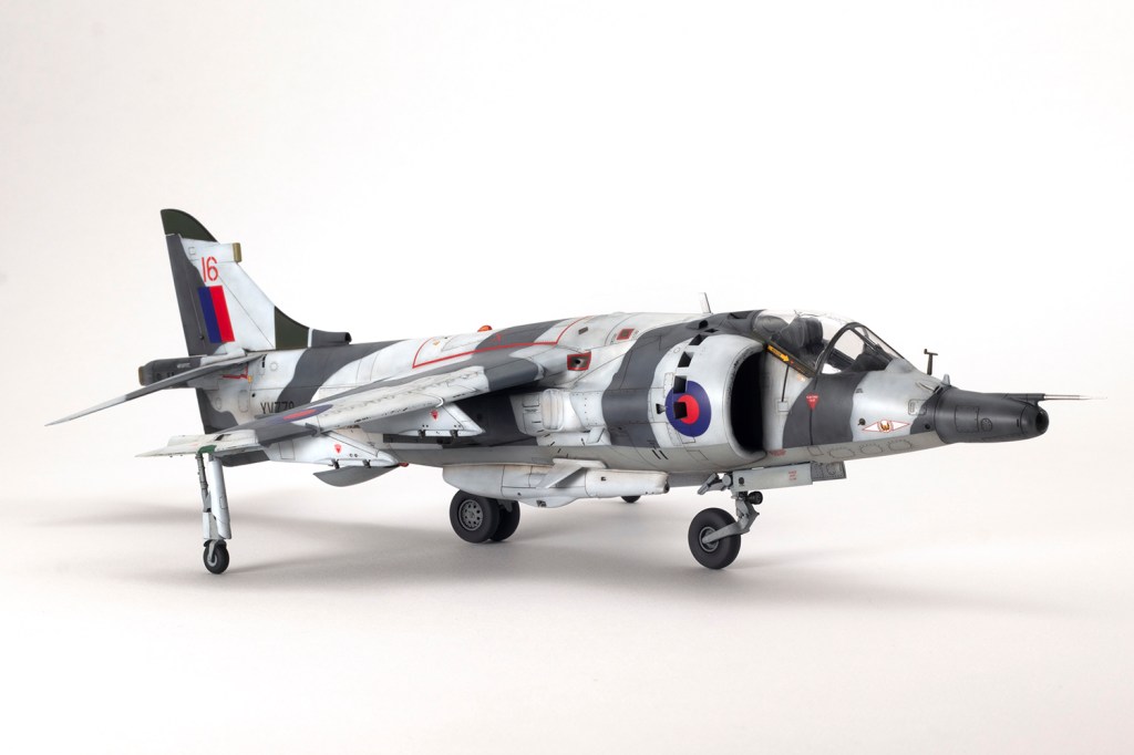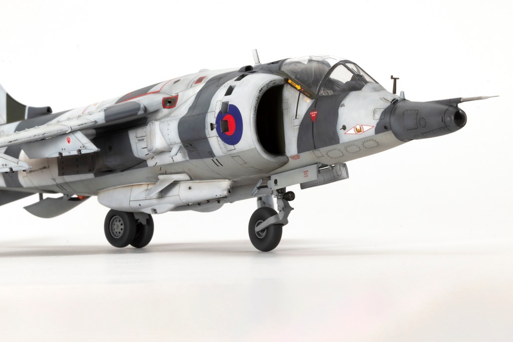 One of my vivid mental images from growing up in the 1980s, surrounded by models and posters of jets, is of first generation Harriers flying at low level over Norwegian snow in winter camouflage. I’m sure I had an Airfix kit in the white and grey scheme, and whilst I think the Snoopy-nosed GR.3 makes a rather pretty aeroplane an ugly one, when Kinetic released their kit back in 2020 I knew I’d be making it in this scheme.