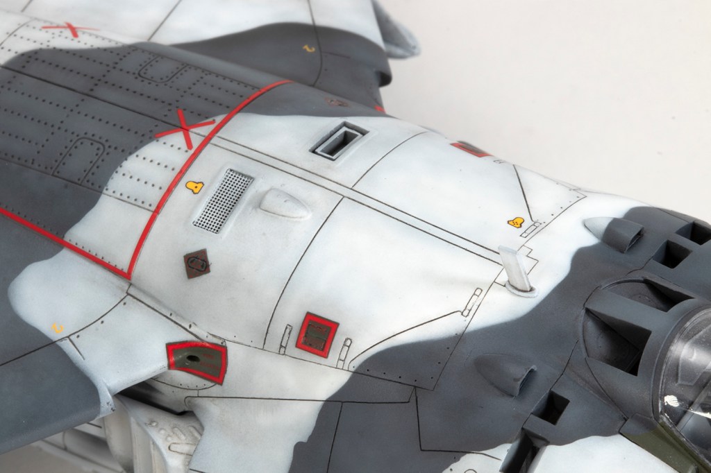 XV778 was photographed in Norway in March 1979 and I had a couple of the pictures, both of the right hand side. Arctic Harriers generally had the green sections of the camouflage overpainted in white, and the way this looked could vary dramatically from deployment to deployment. In this case the photos showed a finish on the neater end of the scale, with stencils and markings painted around rather carefully and the white paint looking rather tidy. Close examination of the photos reveals nice details, like the green canopy sides and nose entirely in Dark Sea Grey. This particular airframe retained the Light Aircraft Grey undersides with pylons, gun pods and the fuel dump all in white. I’m sure I’ve made errors (around the serials, for example, where I could not interpret the photos clearly), and the right hand side is guesswork.