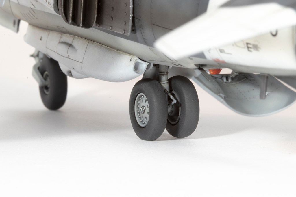 A final word on the undercarriage. The challenge with any harrier is to get all five wheels on the ground. The best way to do this is to leave the rear main gear loose so it can move up or down to match the front and the outriggers. I duly did this, cutting away the awkward locating pegs and using a brass wire to allow the leg to move up and down. What I did not account for is that Kinetic did not mould the holes for the rear leg axle centrally, so my wheels sit at slightly different heights on the axle and thus one floats off the ground whilst the other is firmly planted. This is ultra-annoying and next time I shall try using some aftermarket wheels to see if they improve the situation.