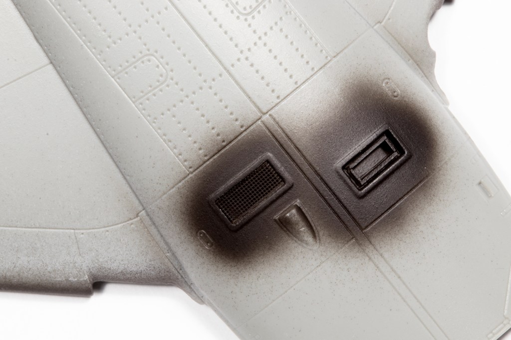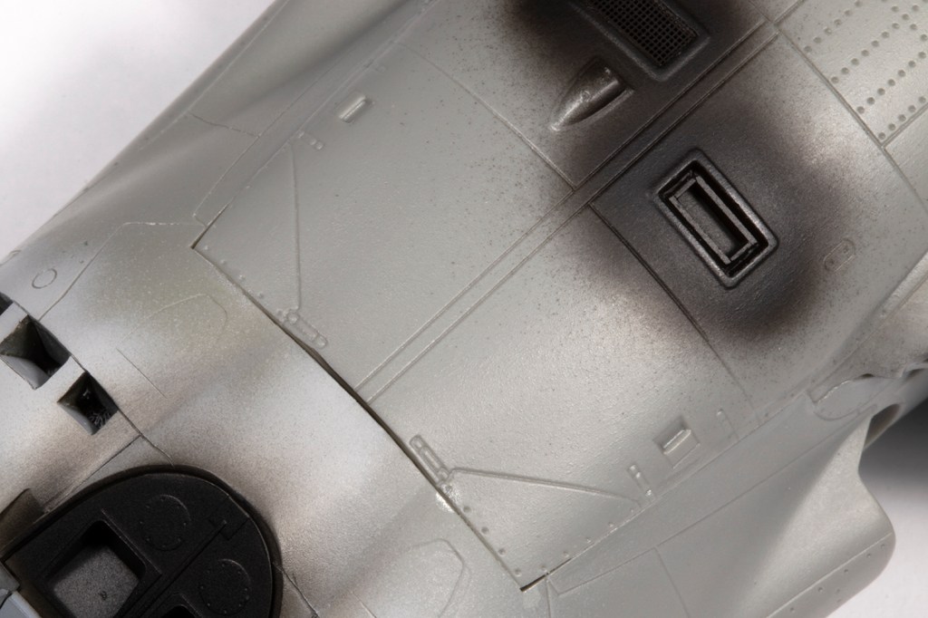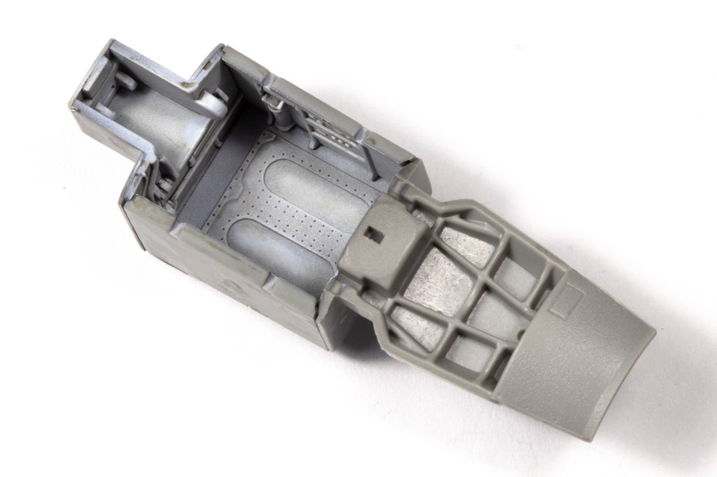 In addition to the cockpit, various modules need to be completed prior to joining the fuselage halves. The rear undercarriage/airbrake bay is nicely detailed, but as I was going to close the doors, it would be invisible. Nevertheless, I used it as an opportunity to practise weathering the white finish with some brown and black ink washes. The doors don’t fit well in the closed position, with nothing to mount to, so I attached each door to its respective fuselage side and backed the very fragile joint with plastic strip.