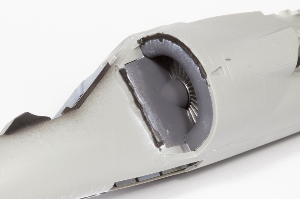 Finally, the intakes need to be addressed. This was more complicated than I anticipated. First, pay attention to the instructions and make sure the intake interiors are painted the correct colours (i.e., not white). I elected to add the intake fan part to the cockpit and then put the entire fuselage together. The fit was fairly good, but I had to use a lot of CA with filler powder and shims of plastic card around the rear gear bay doors. I also took the opportunity to remove the seam between the intake interior and the fuselage sides so no join would be visible later through the open blow-in doors.